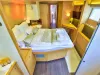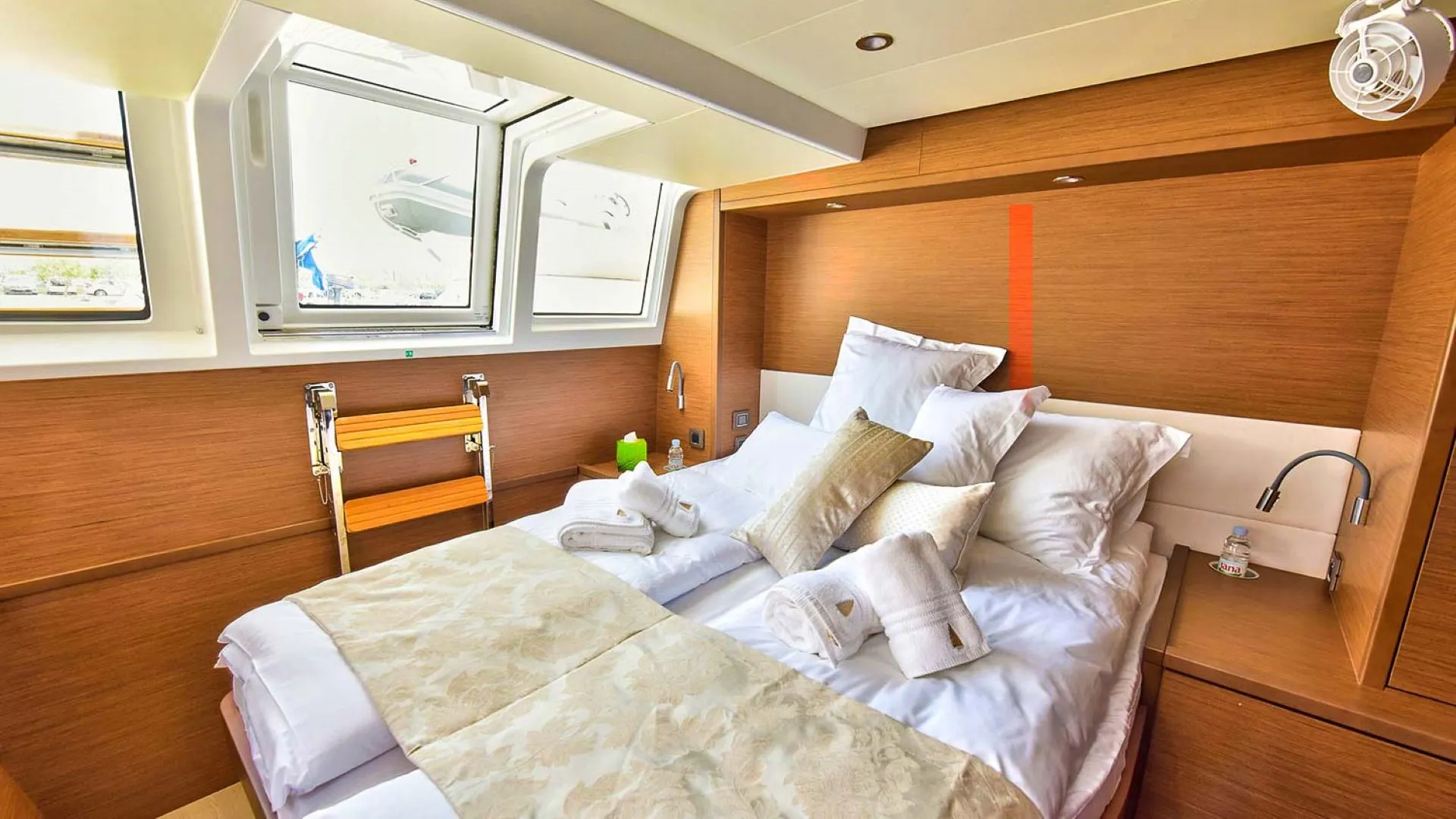 Prostorný salon je rozdělen na samostatné jídelní, relaxační, sedací a navigační oblasti, což poskytuje dostatek prostoru pro různé aktivity. Velká okna v trupu a panoramatická okna v kuchyni a zadní pravobokové kajutě umožňují dostatek přirozeného světla, čímž vytvářejí světlou a vzdušnou atmosféru. Nepřímé osvětlení v salonu a kajutách poskytuje jemnější, intimnější atmosféru, zatímco okna v salonu mohou být vybavena žaluziemi pro soukromí a regulaci světla. Uvnitř plavidla najdete plně vybavenou kuchyni a výběr z nejlepších druhů kávy a nejlepších chorvatských místních produktů.
