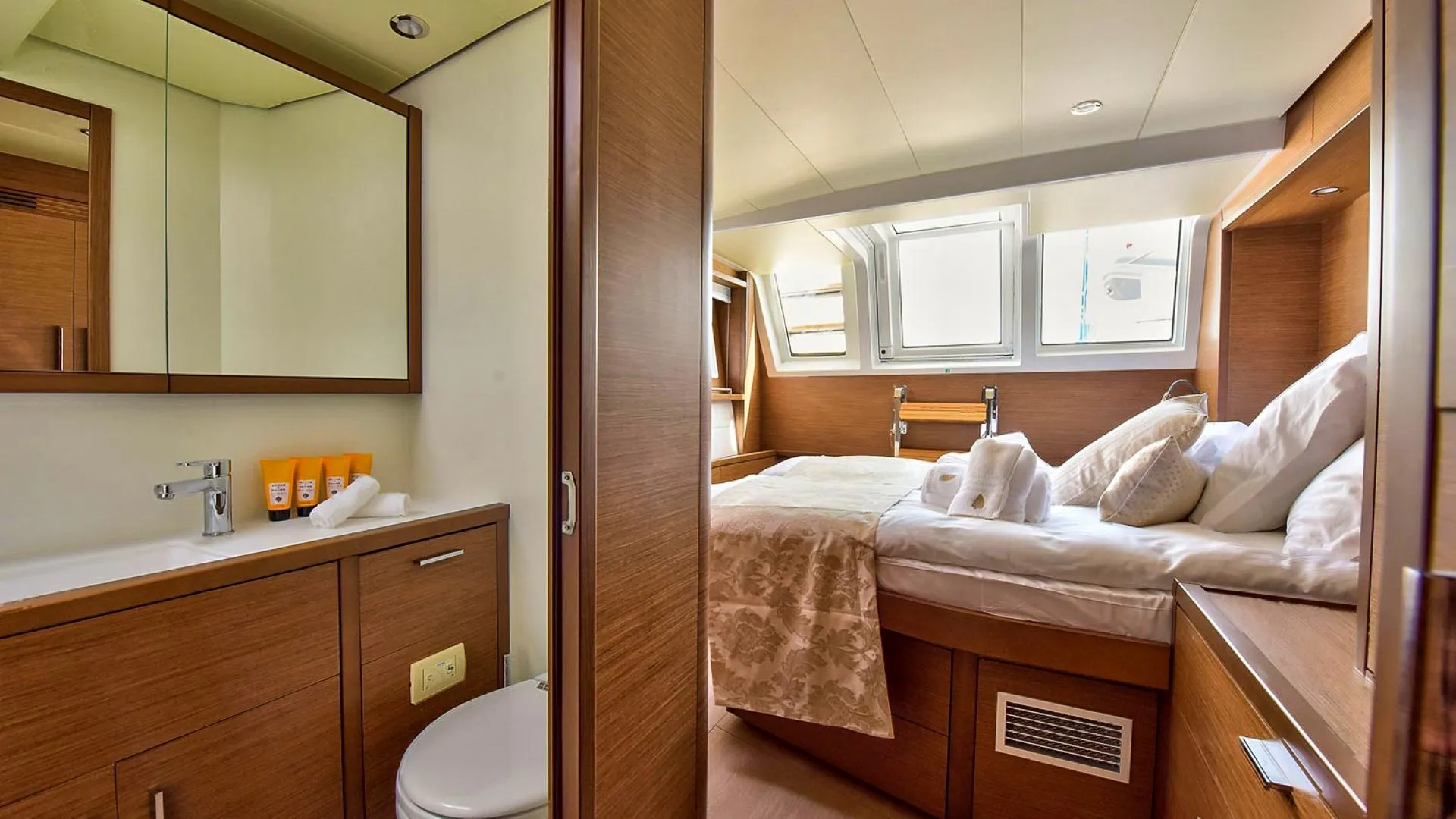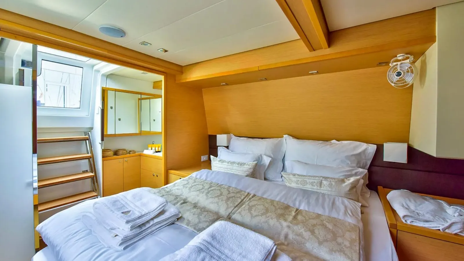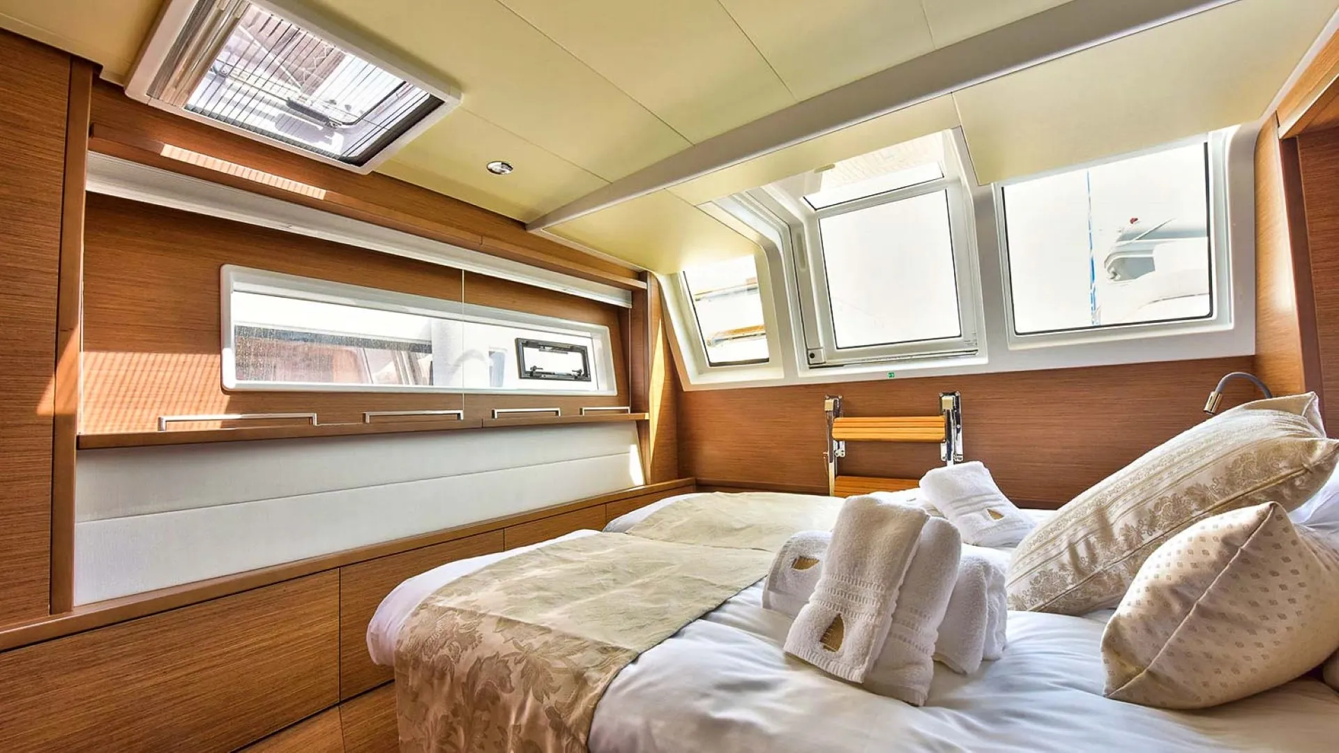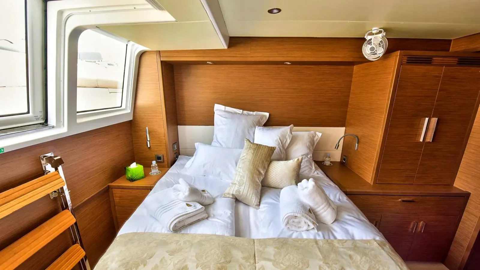 Luxusní, dobře navržené kajuty nabízejí boční přístup k postelím a vlastní koupelny s oddělenými sprchami, což zvyšuje soukromí a pohodlí. Majitelská kajuta, umístěná v pravobokovém trupu, disponuje soukromou sedací částí a přímým přístupem do kokpitu, což zajišťuje pohodlí a komfort. Motorové prostory jsou umístěny daleko od obytných prostor a jsou dokonale izolovány, což zajišťuje tiché a klidné prostředí.