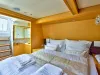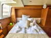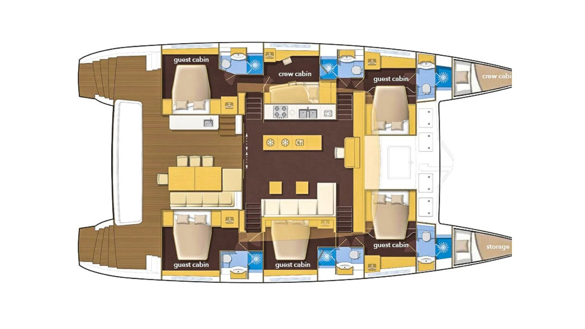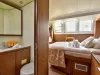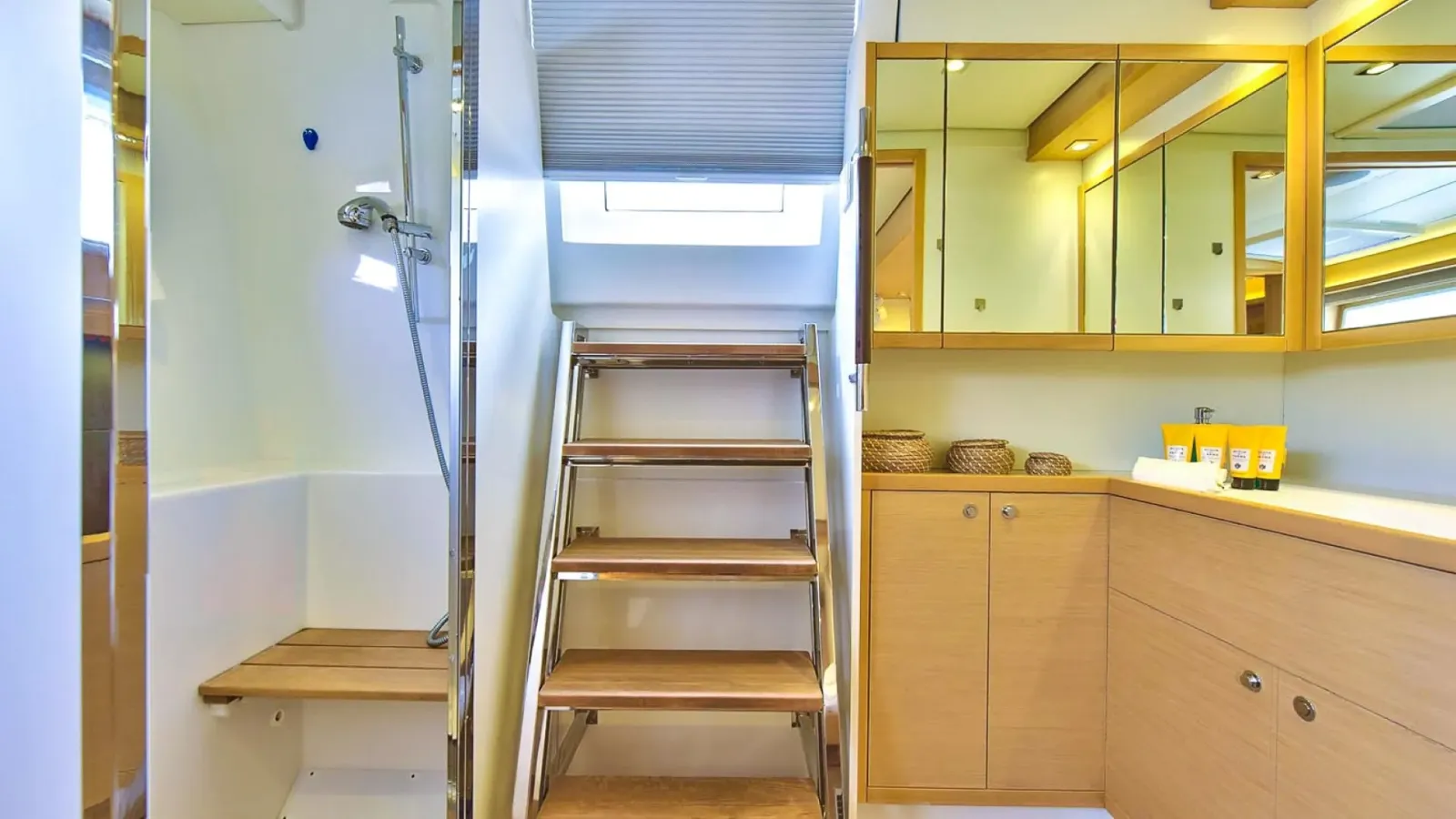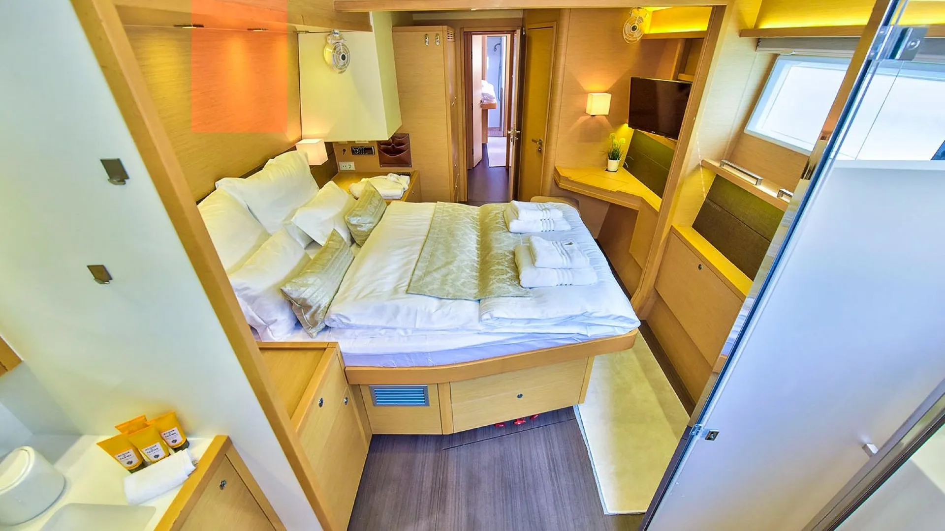 Luxusní, dobře navržené kajuty nabízejí boční přístup k postelím a vlastní koupelny s oddělenými sprchami, což zvyšuje soukromí a pohodlí. Majitelská kajuta, umístěná v pravobokovém trupu, disponuje soukromou sedací částí a přímým přístupem do kokpitu, což zajišťuje pohodlí a komfort. Motorové prostory jsou umístěny daleko od obytných prostor a jsou dokonale izolovány, což zajišťuje tiché a klidné prostředí.