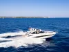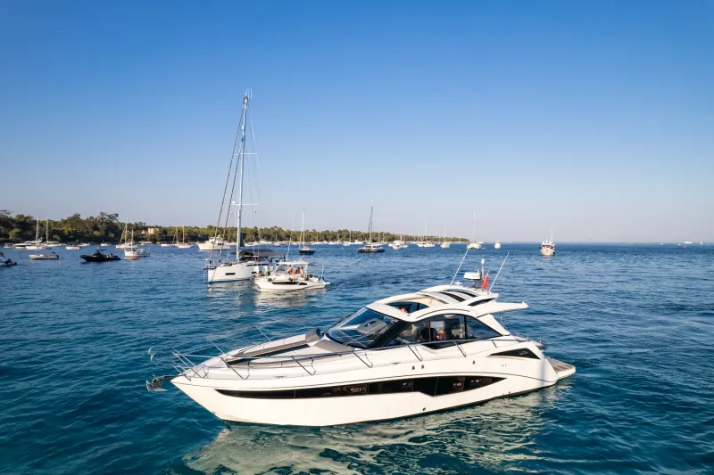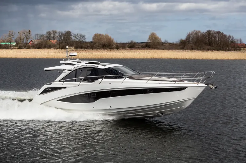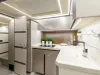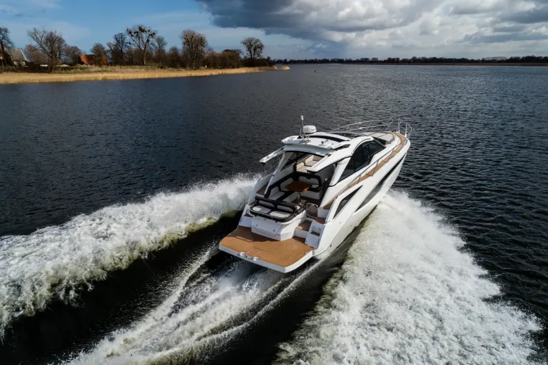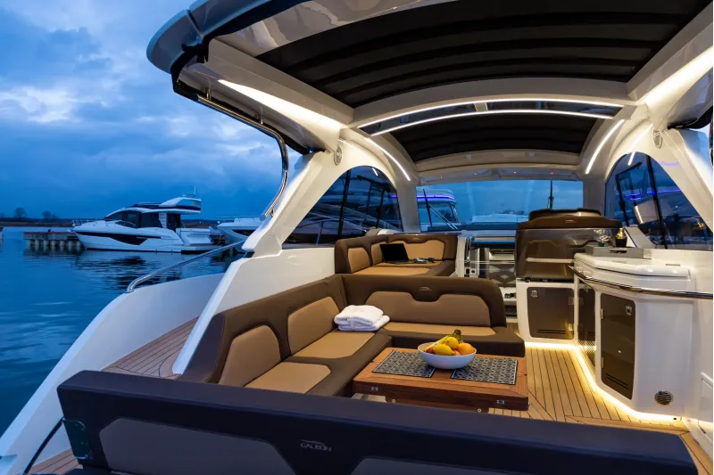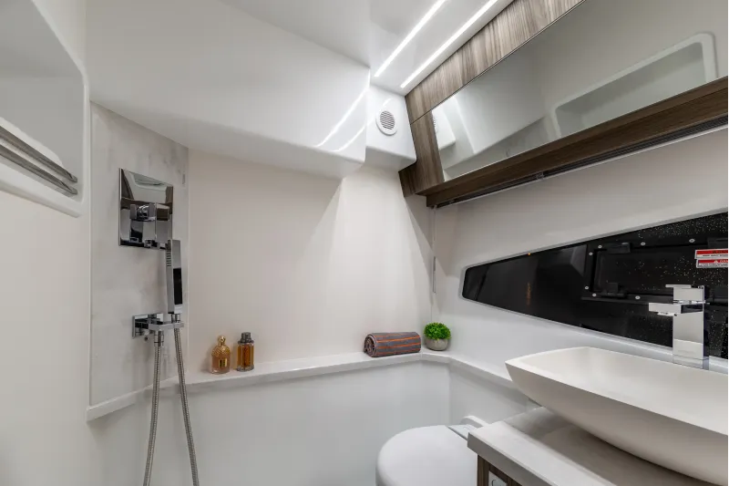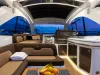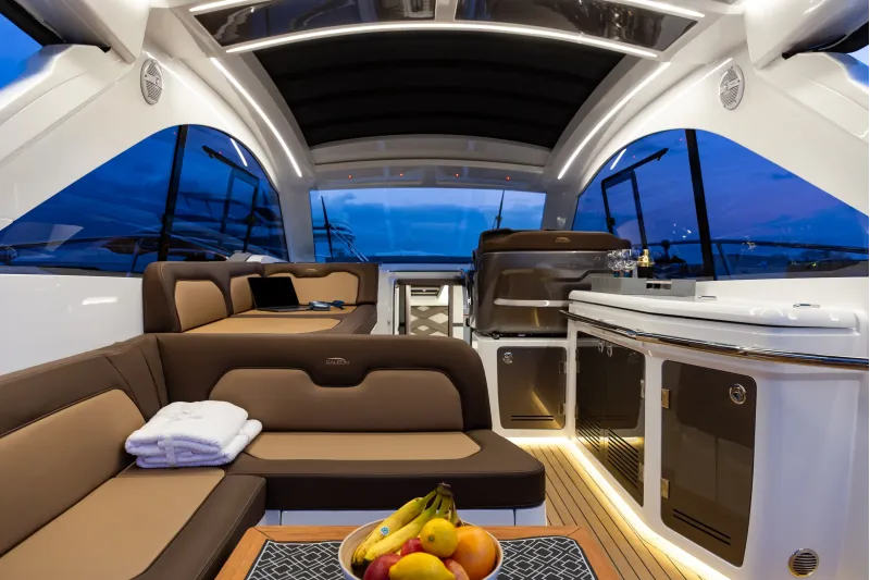 Velká okna přidávají přirozené světlo do salonu, kuchyně a kabin hostů. Prostorný salon na hlavní palubě s barem na pravoboku se jistě stane oblíbeným místem pro setkávání rodiny a přátel, poskytujícím pocit prostornosti. Kormidelna těží z velkých oken a jednoho skleněného štítu, který nabízí panoramatický výhled na 360 stupňů. Ubytovací prostor na dolní palubě zahrnuje plně vybavenou kuchyni a dvě kajuty se samostatnými koupelnami, aby zajistily pohodlí a soukromí hostů. Majitelský apartmán se nachází uprostřed a zabírá celou šířku jachty, což umožňuje neuvěřitelné množství objemu a úložného prostoru.