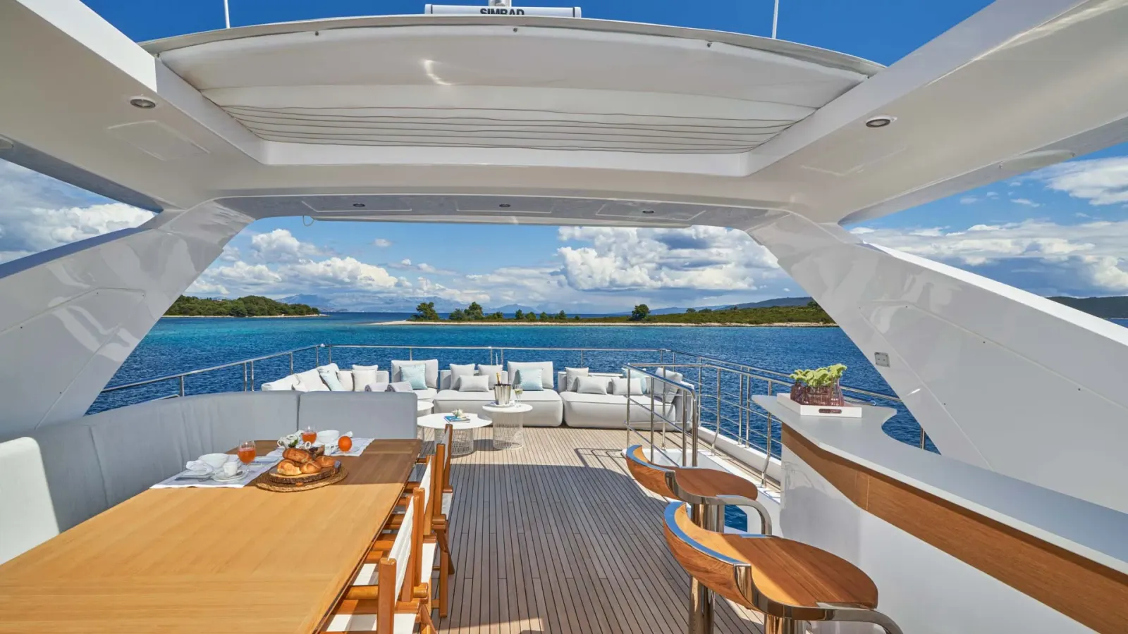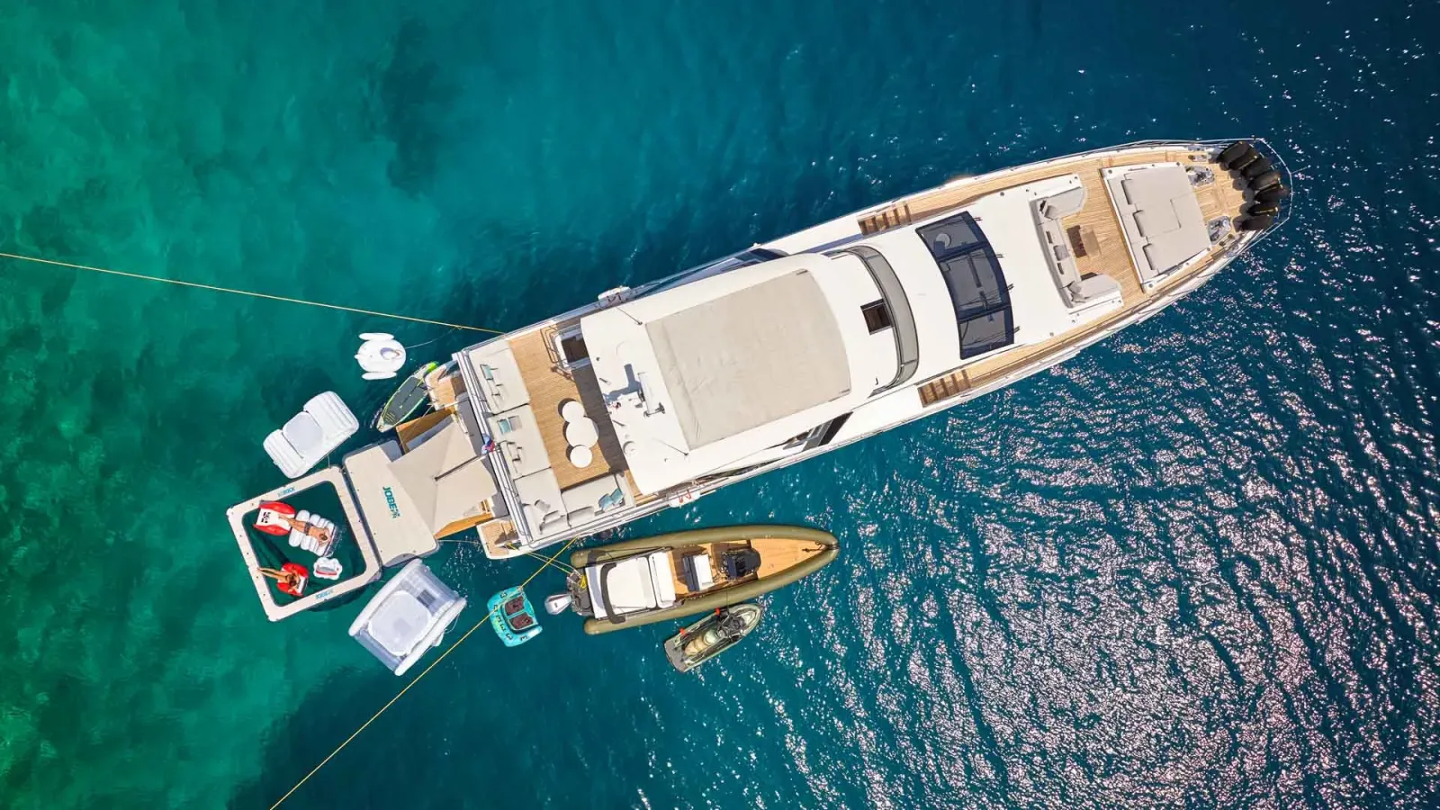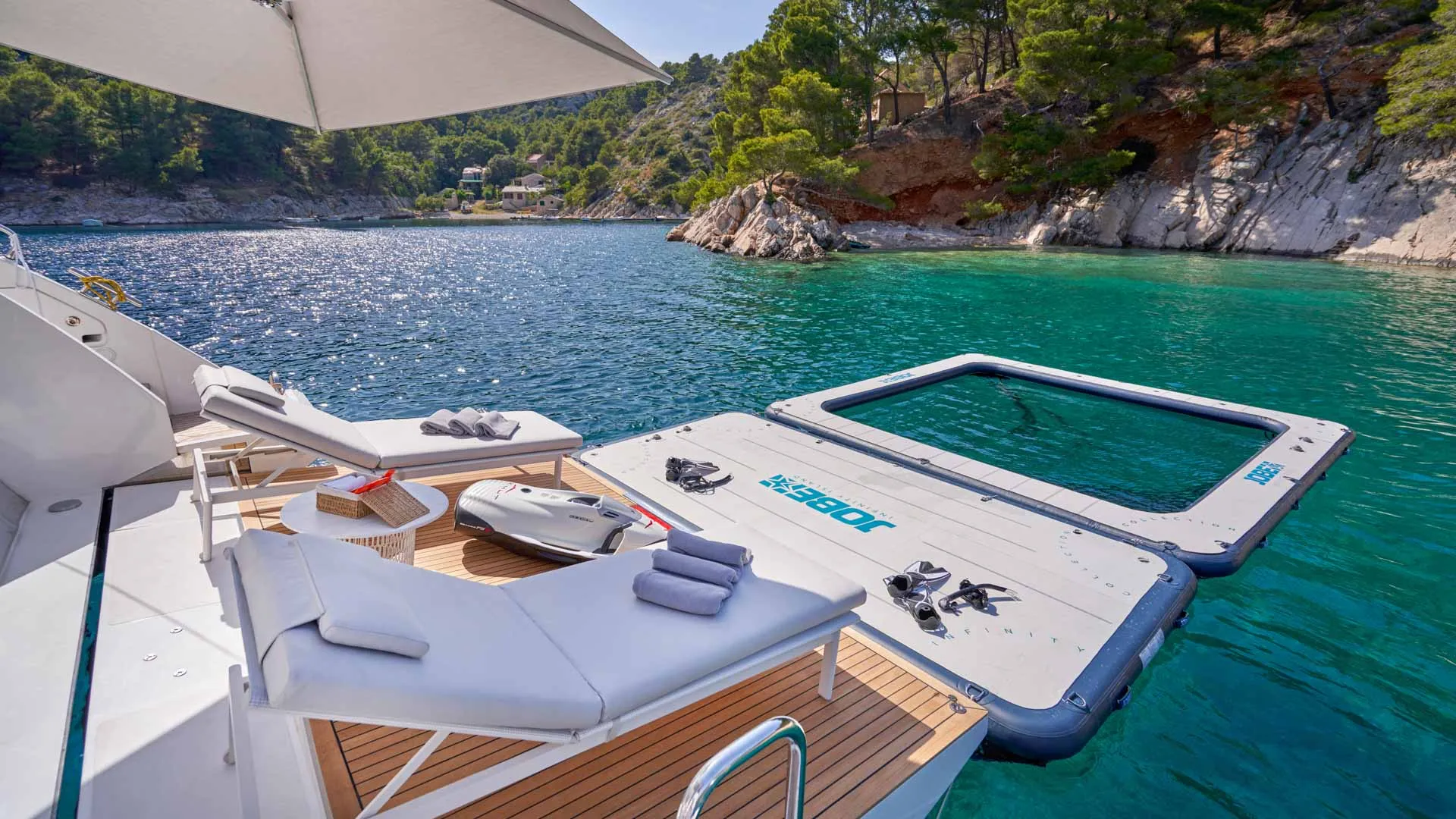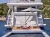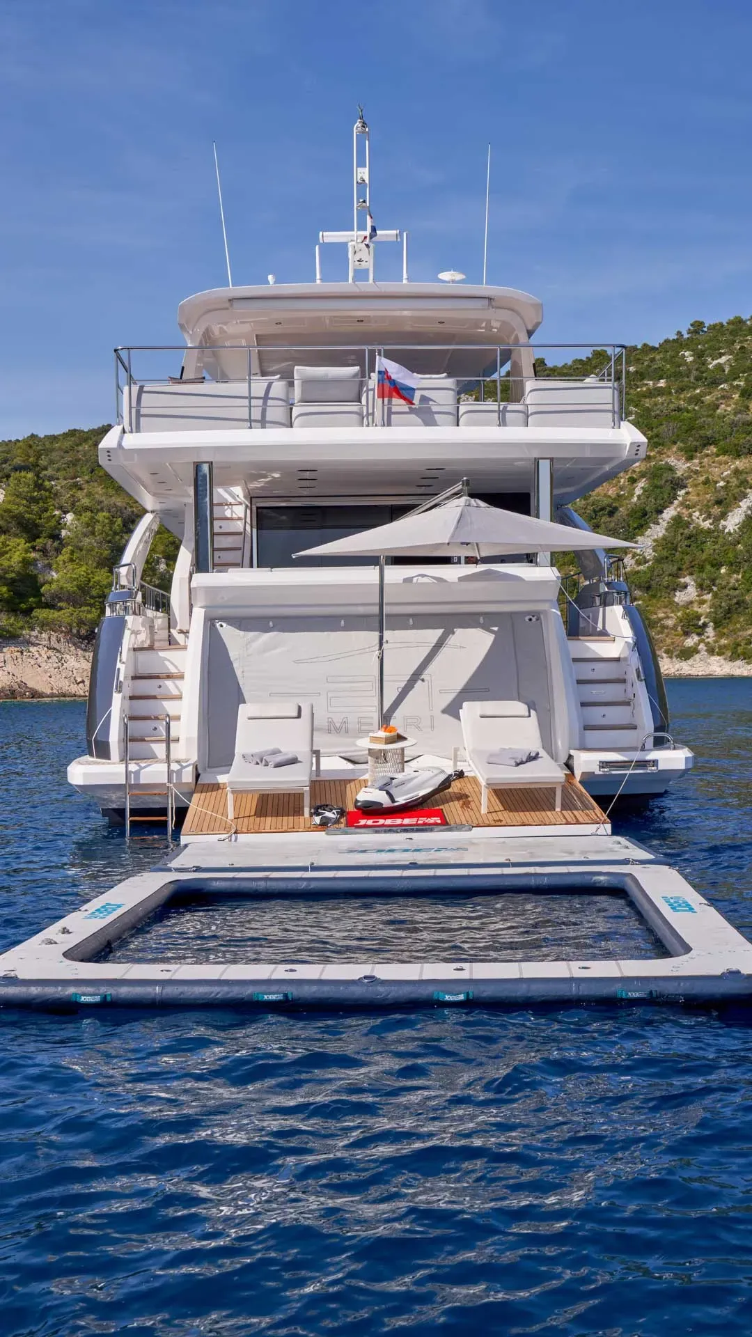 Die Aluminia Too verfügt über große, raumhohe Fenster und großzügige Volumen in der gesamten Yacht, die den Raum maximieren. Ihre innovative Plattform erweitert sich, indem sie das Heck in den Beach-Modus absenkt und so den Gästen ein komfortables Erlebnis bietet.