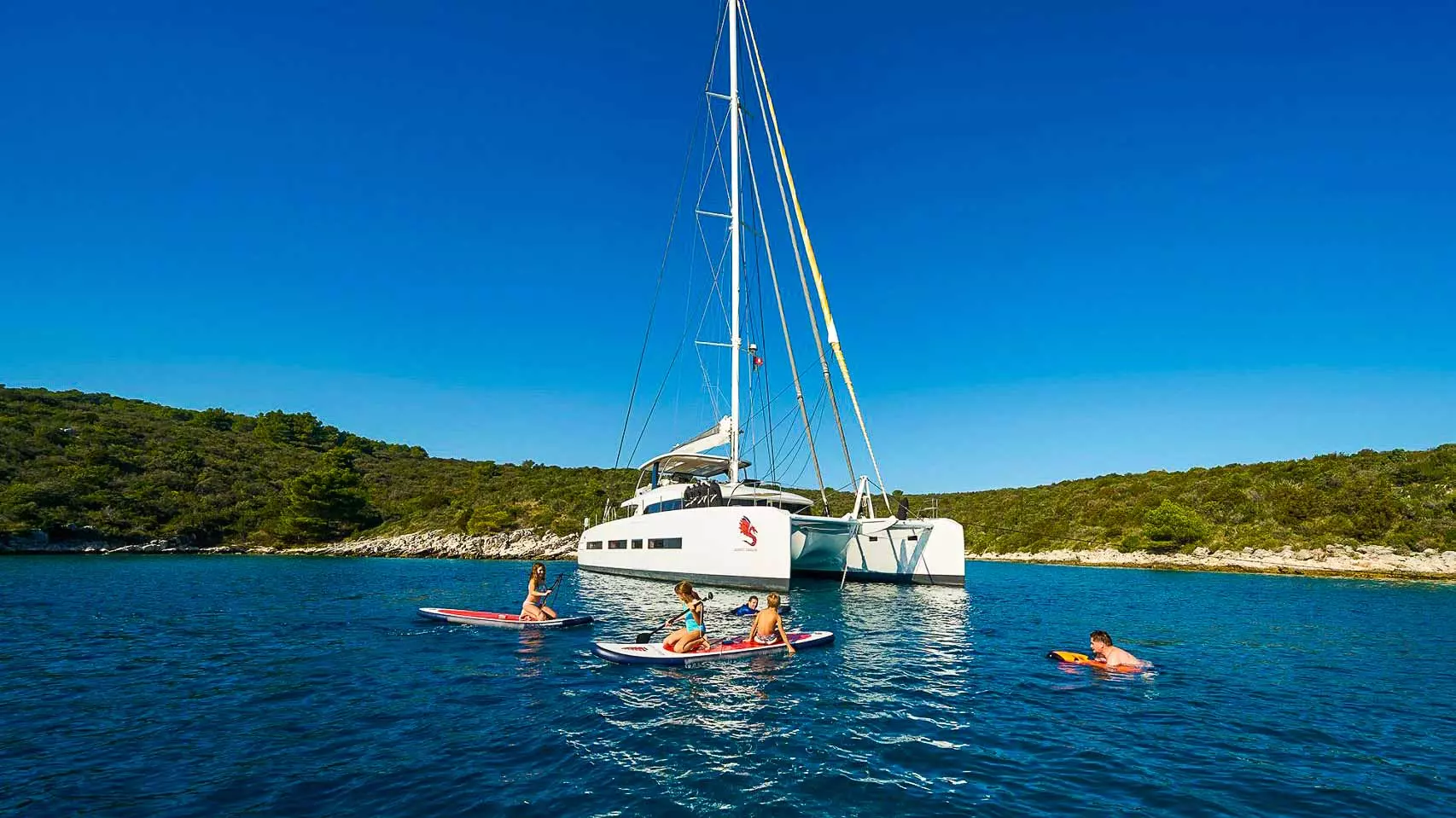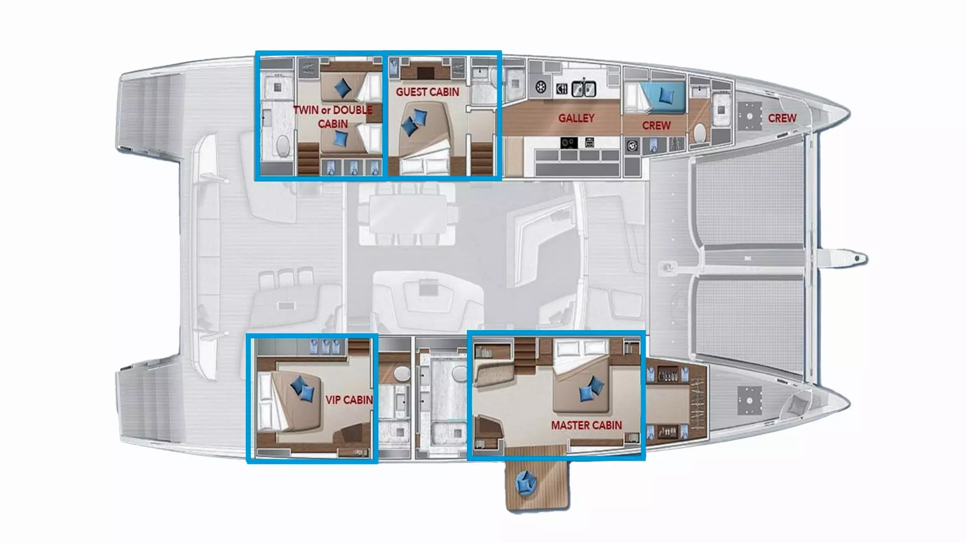 Die Lagoon Seventy 7 bietet bequem Platz für acht Gäste in vier luxuriösen Kabinen, bestehend aus drei Doppelkabinen und einer umwandelbaren Zweibettkabine. Jede Kabine verfügt über ein eigenes Badezimmer. Die Master-Kabine bietet einen einzigartigen Teak-Balkon mit einer Badeleiter, der über eine hydraulische Tür zugänglich ist. Zur Unterhaltung steht ein hochwertiges TV-Medien-System im Salon und in der Master-Kabine zur Verfügung. Für zusätzlichen Komfort sind in jedem Badezimmer beheizte Handtuchhalter vorhanden.