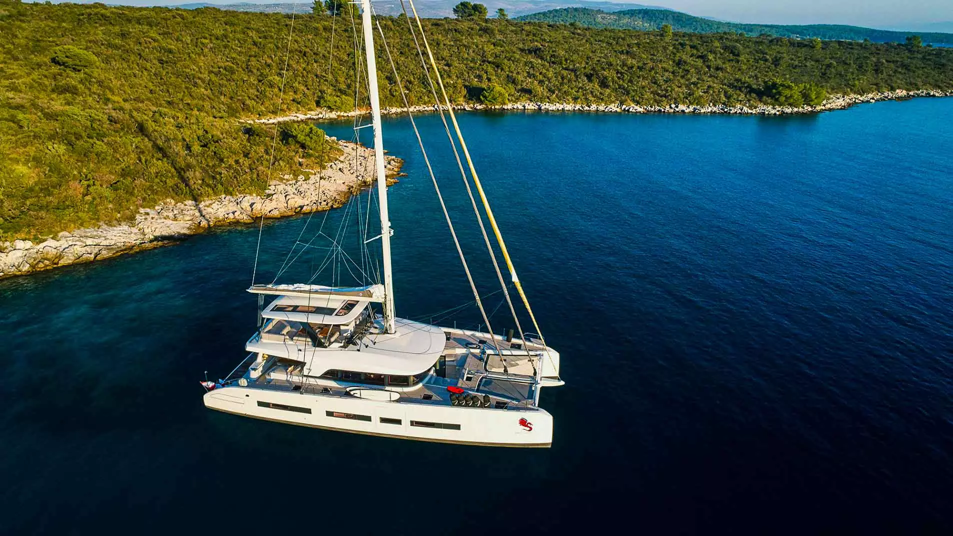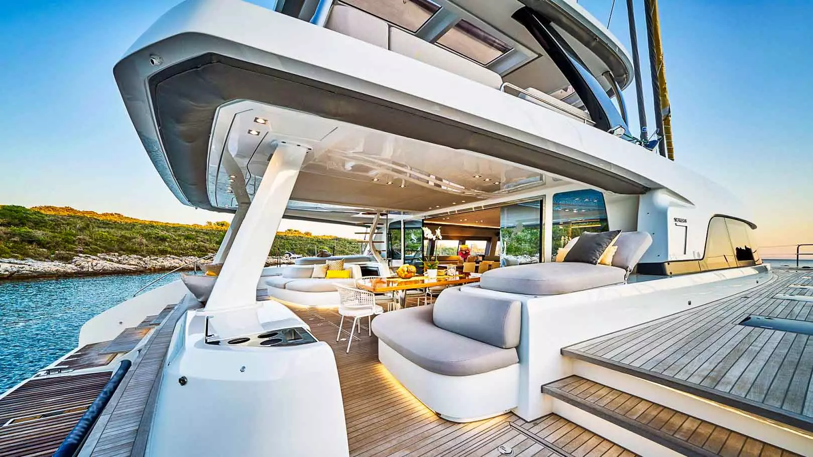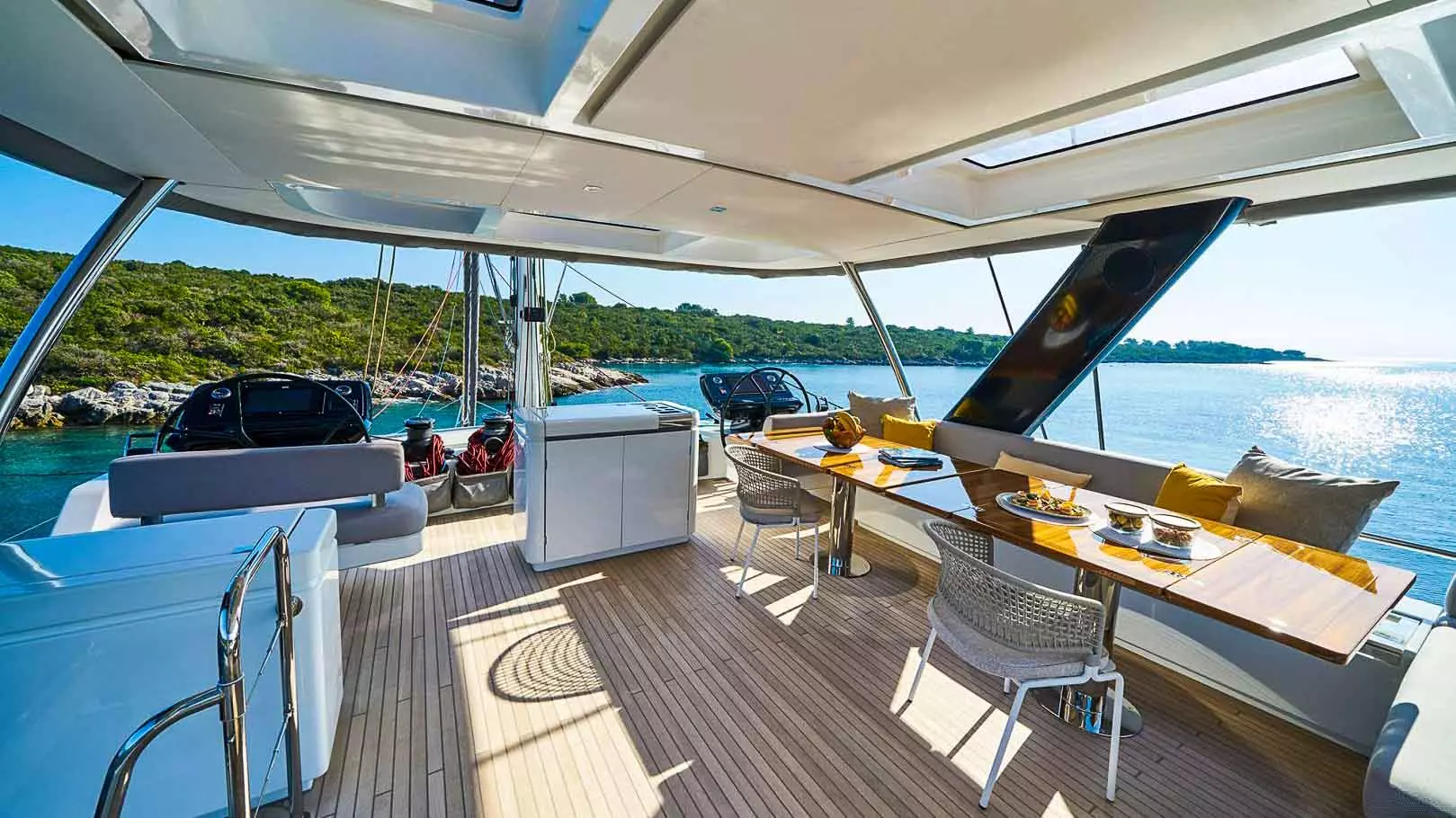Die Lagoon Seventy 7 ist eine moderne Kreuzfahrt-Yacht, die Stärke, Komfort, Leistung und außergewöhnlichen Wohnraum harmonisch vereint. Sie richtet sich an anspruchsvolle Kunden, die einen innovativen Ansatz für das Leben an Bord suchen. Dieses optisch ansprechende Lagoon-Modell bietet einen großzügigen Sonnenbereich am Bug, komplett mit einem Zelt und einem Verbund-Bimini auf der Flybridge. Zusätzlich verfügt diese Lagoon Seventy 7 über ein komplettes Teakdeck, eine hydraulische Plattform und eine Gangway. Um das Segelerlebnis auch bei leichtem Wind zu verbessern, ist dieser Luxuskatamaran mit einem Code 0 Segel ausgestattet.