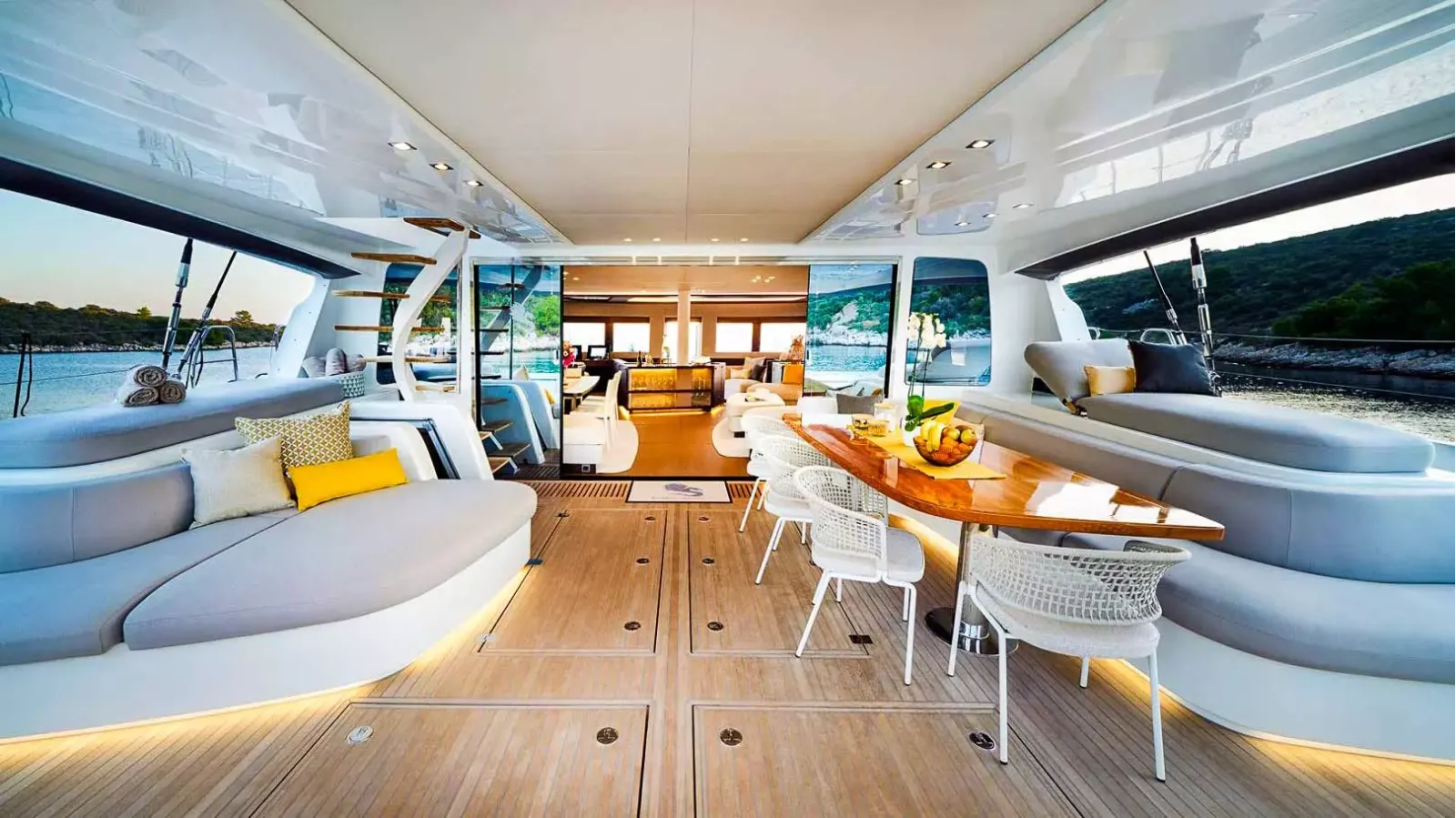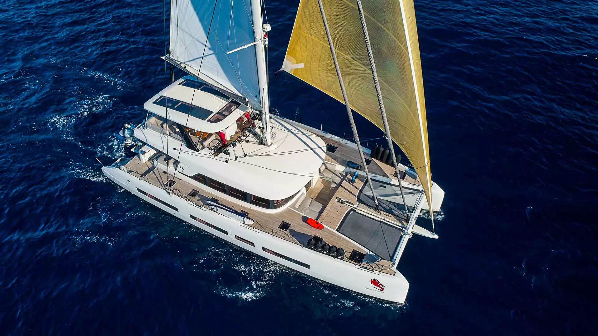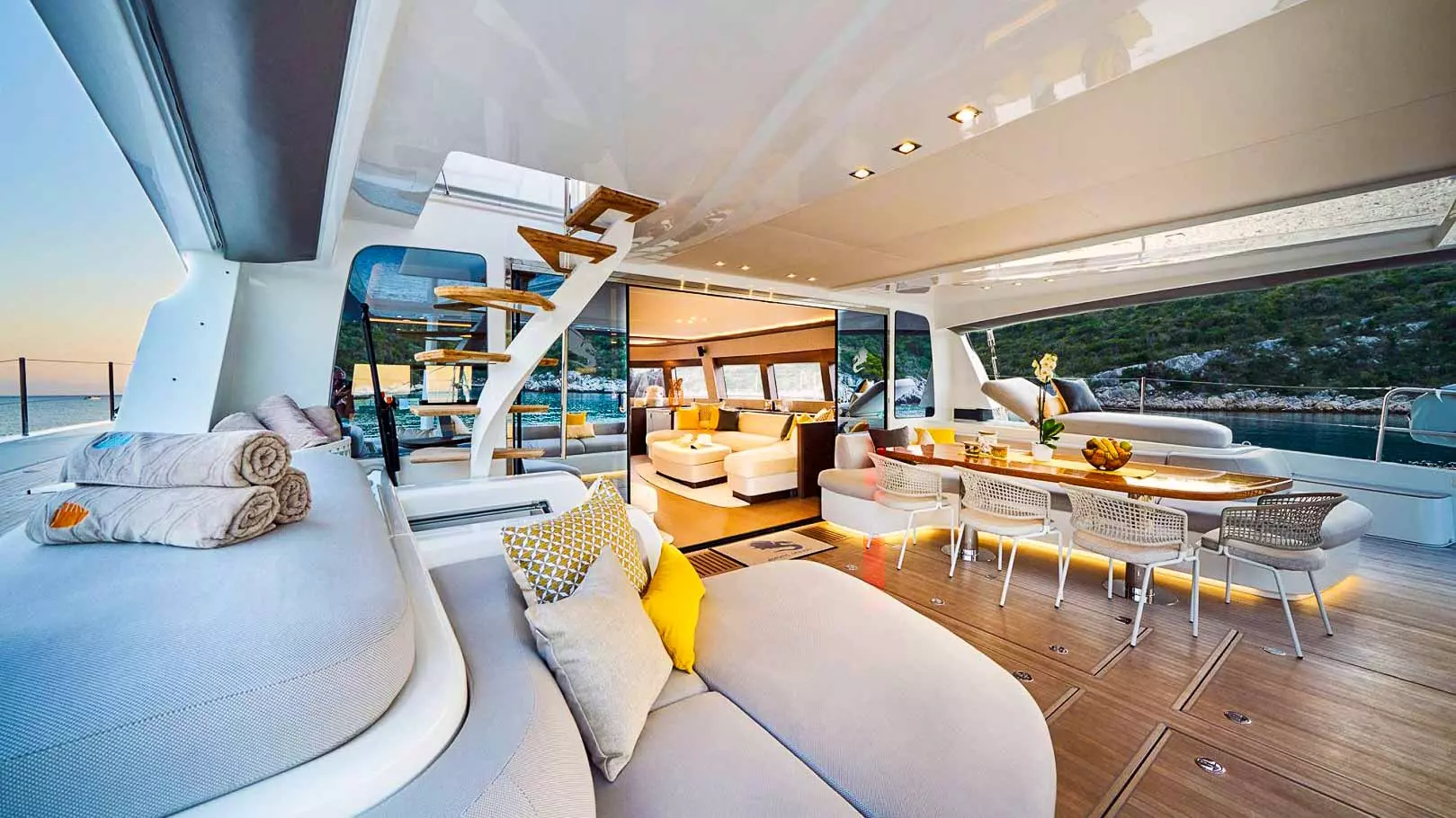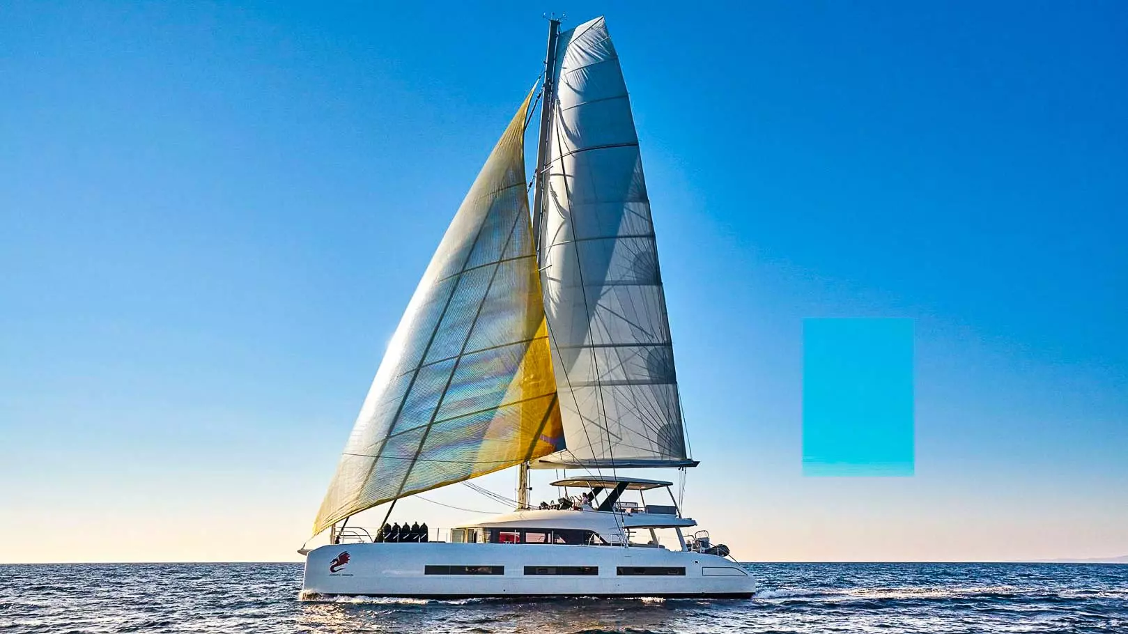 Die Lagoon Seventy 7 ist eine moderne Kreuzfahrt-Yacht, die Stärke, Komfort, Leistung und außergewöhnlichen Wohnraum harmonisch vereint. Sie richtet sich an anspruchsvolle Kunden, die einen innovativen Ansatz für das Leben an Bord suchen. Dieses optisch ansprechende Lagoon-Modell bietet einen großzügigen Sonnenbereich am Bug, komplett mit einem Zelt und einem Verbund-Bimini auf der Flybridge. Zusätzlich verfügt diese Lagoon Seventy 7 über ein komplettes Teakdeck, eine hydraulische Plattform und eine Gangway. Um das Segelerlebnis auch bei leichtem Wind zu verbessern, ist dieser Luxuskatamaran mit einem Code 0 Segel ausgestattet.