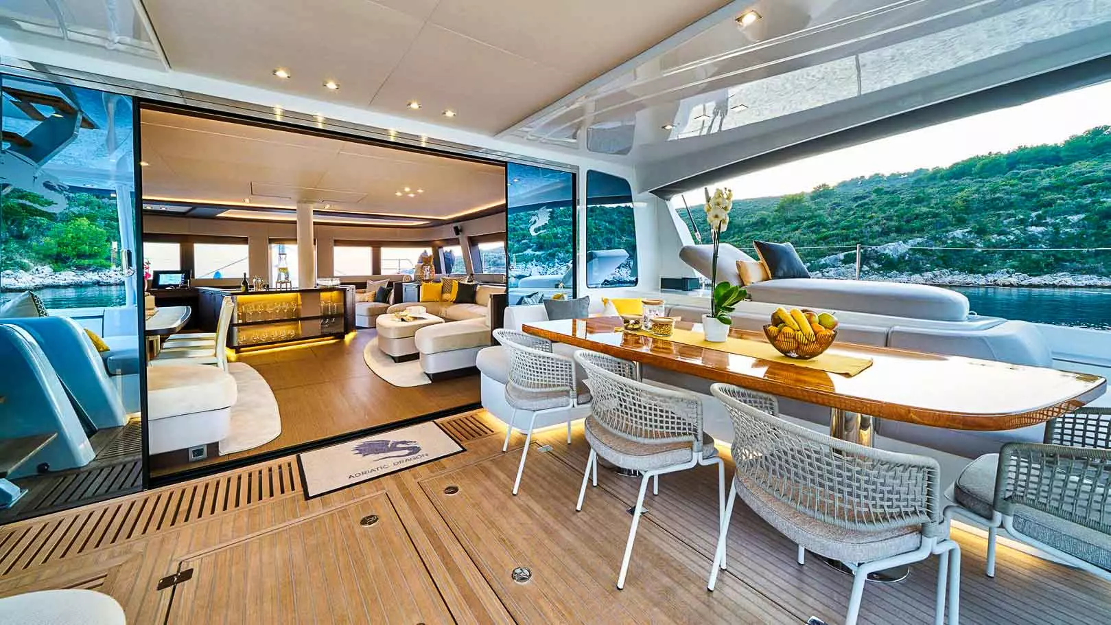 Das Hauptdeck verfügt über einen großzügigen Essbereich, bekannt als Cockpit. Unten im Backbordrumpf befindet sich eine gut ausgestattete Küche, in der der Koch kulinarische Köstlichkeiten zubereitet. Die Küche ist mit modernen Annehmlichkeiten wie einer Waschmaschine/Trockner, einer Spülmaschine, einem Wasserfilter und einem Drucker ausgestattet. Um Ihren Komfort zu erhöhen, bietet der Katamaran tägliche Reinigungsdienste, einschließlich Endreinigung, Bettwäsche, Handtücher, Strandtücher und Toilettenartikel. Zusätzlich bleiben Sie mit 1 TB wöchentlichem WLAN mit Freunden und Familie in Verbindung.