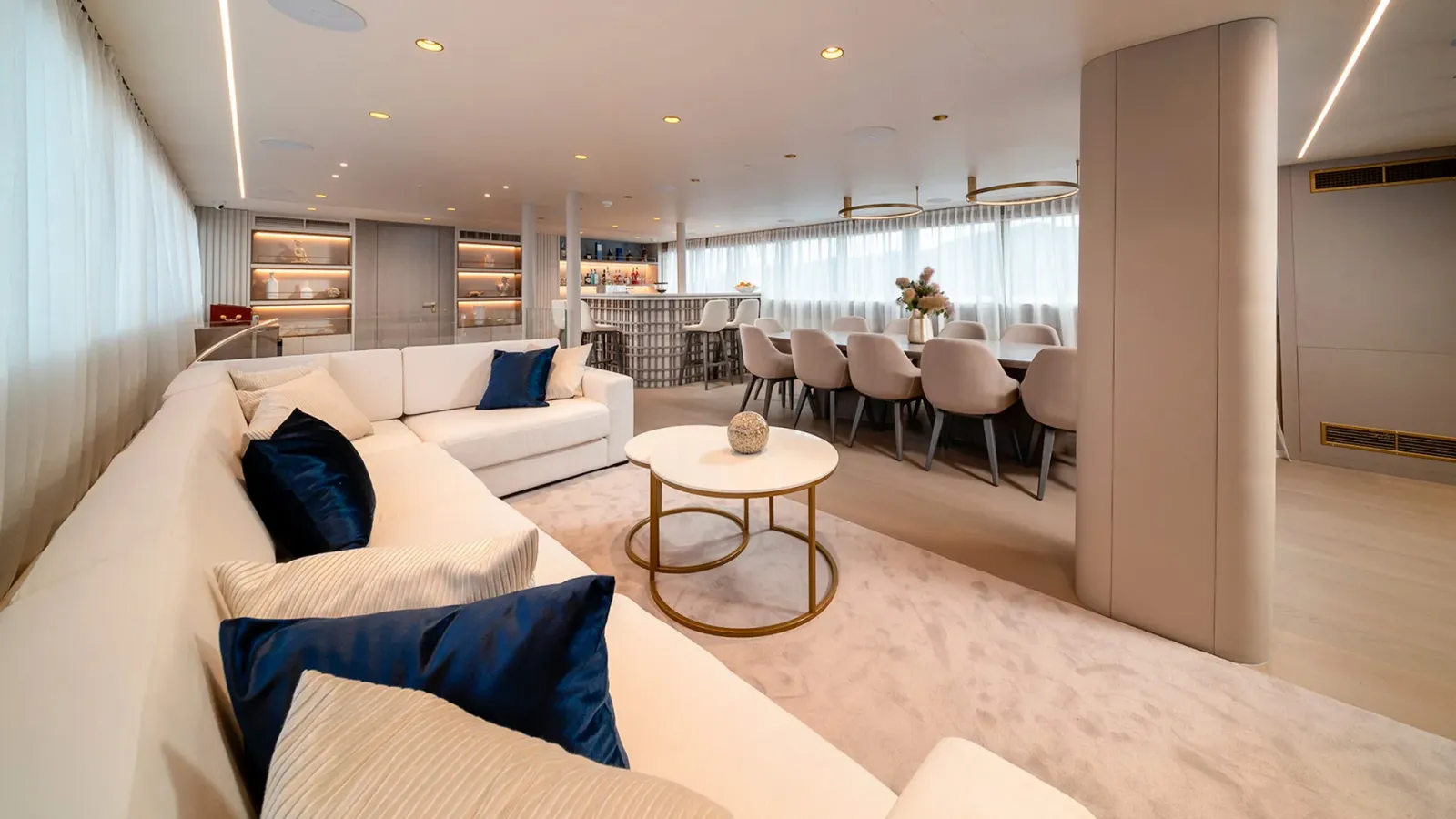 Die luxuriöse Segelyacht Nocturno verfügt über einen geräumigen Salon mit einer gemütlichen Lounge, einem Innen-Essbereich und einer Bar. Die Yacht ist vollständig klimatisiert, um an heißen Sommertagen einen angenehmen Aufenthalt zu gewährleisten. Darüber hinaus sind die Crewquartiere sowie die Küche separat, sodass die Privatsphäre der Gäste garantiert ist. Nocturno bietet Platz für bis zu 12 Gäste in 5 luxuriösen Kabinen. Diese charmante Luxusyacht verfügt über eine Master-, VIP-, Doppel- und eine in zwei Einzelbetten umwandelbare Kabine. Zudem bietet die herausragende Master-Kabine eine Massagetherapie-Badewanne. Zusätzlich ist jede Kabine mit Annehmlichkeiten wie TV, WLAN und einem Surround-Sound-System mit separaten Steuerungen ausgestattet.