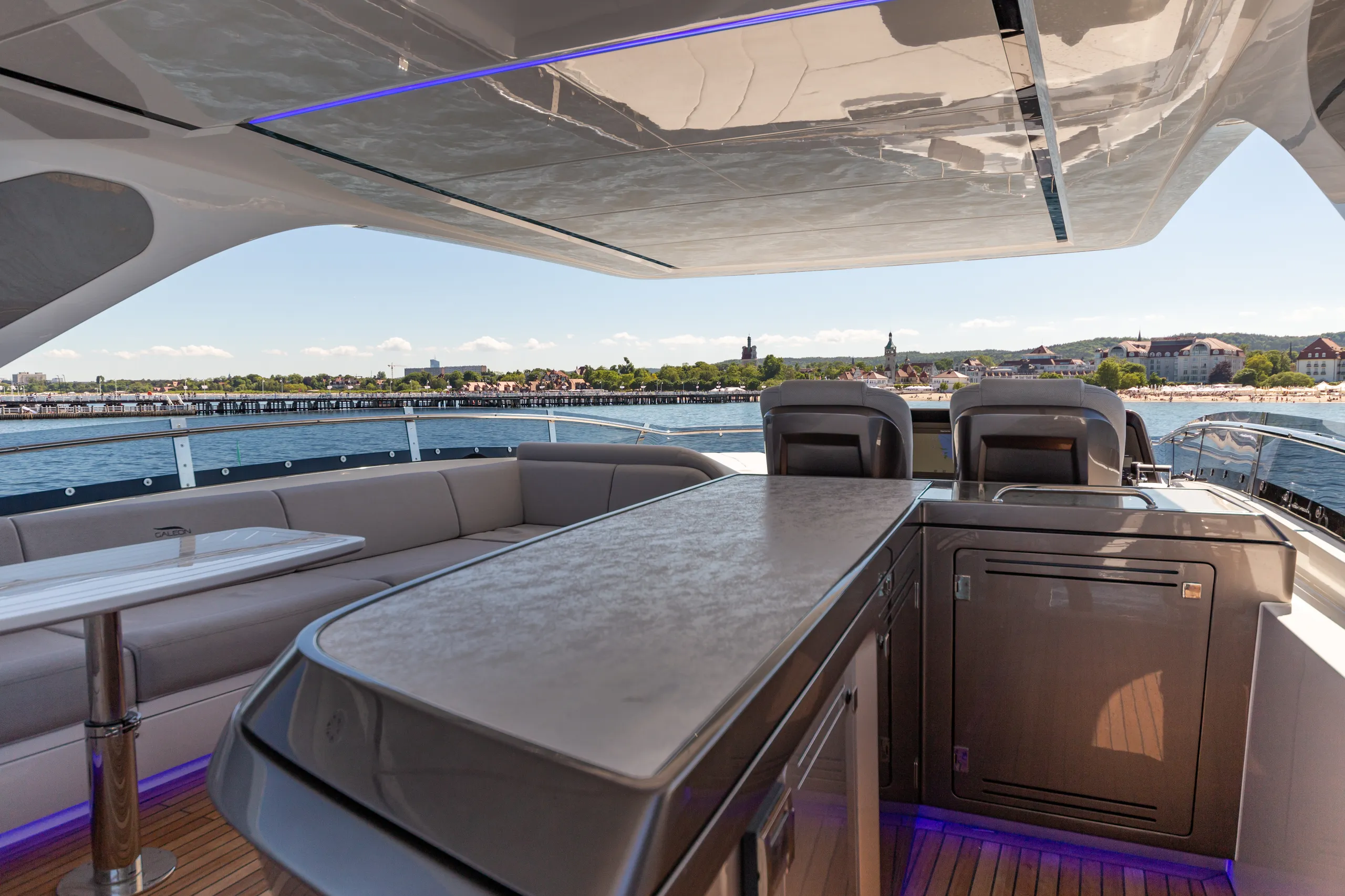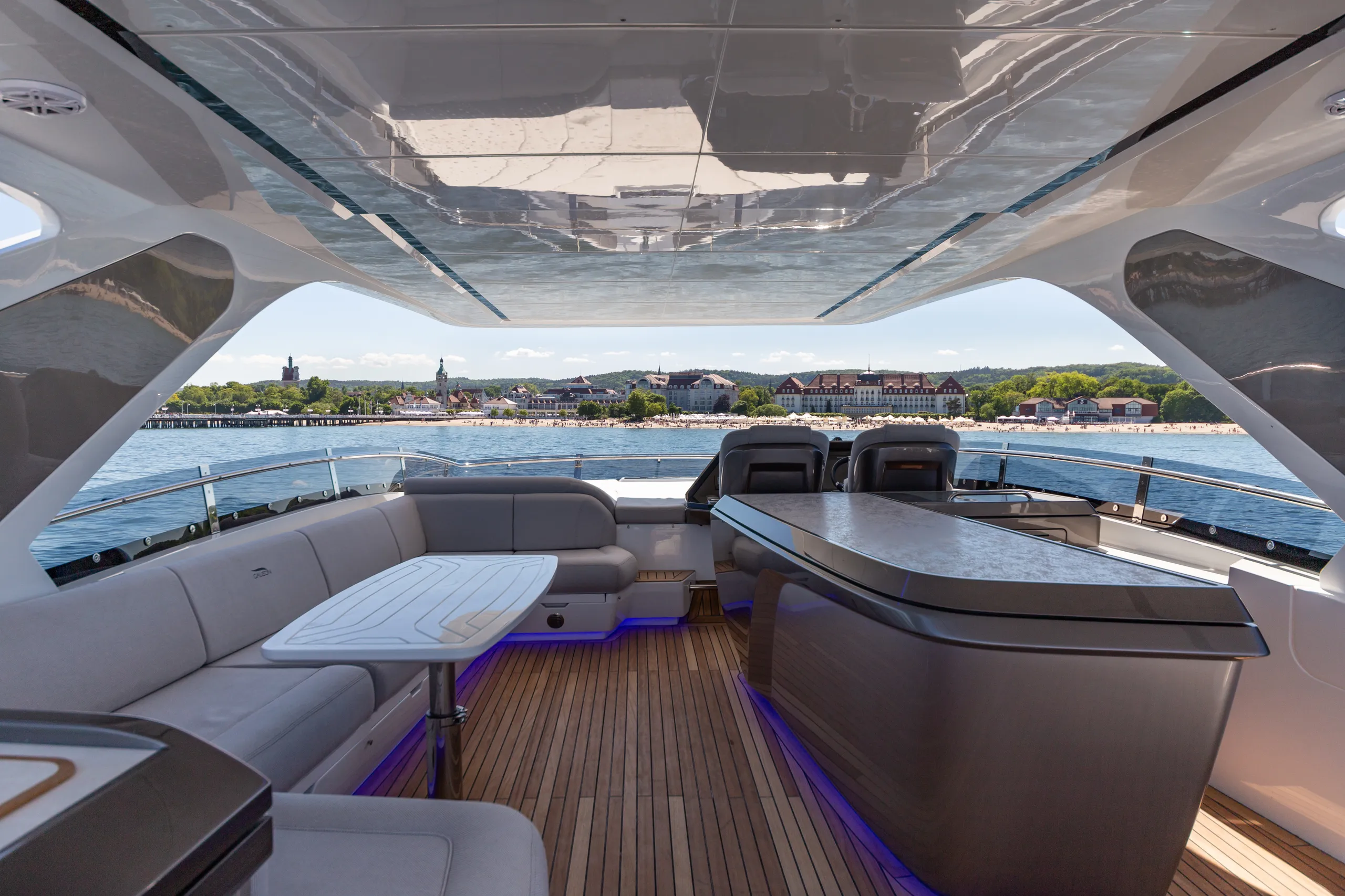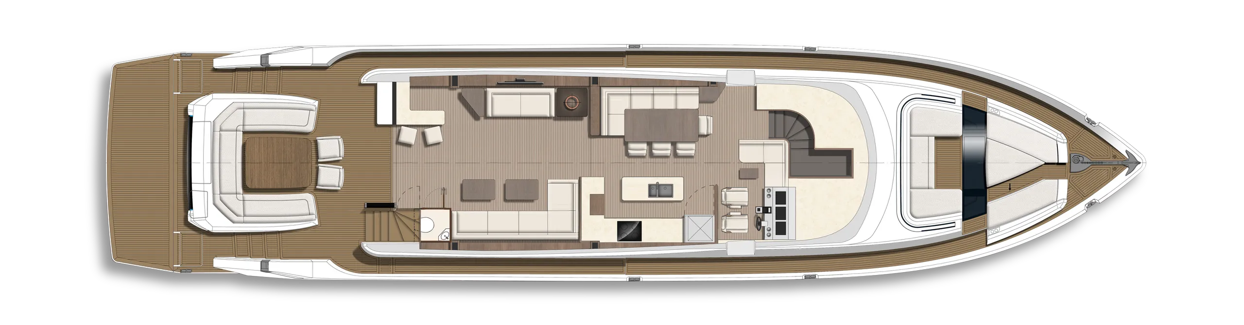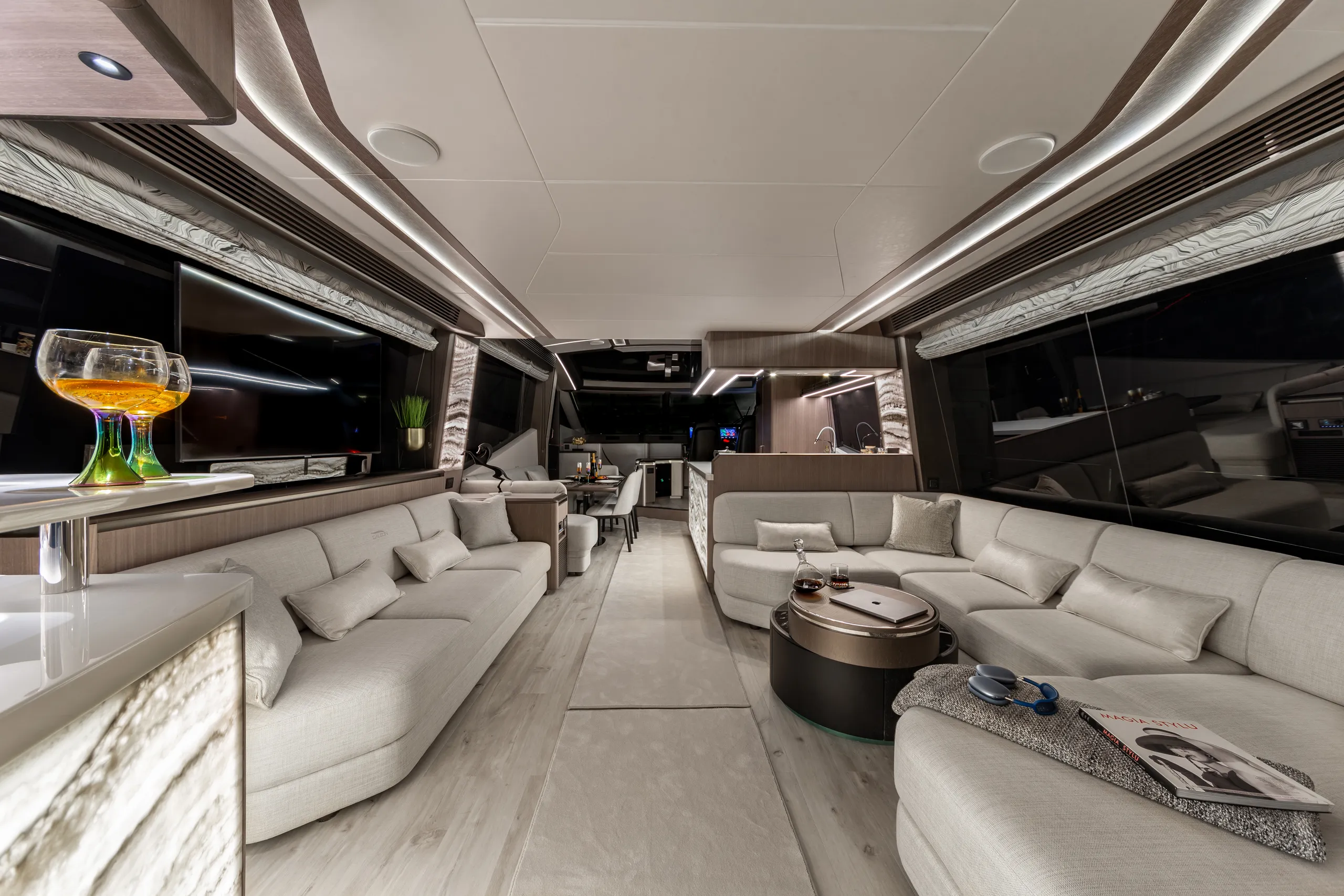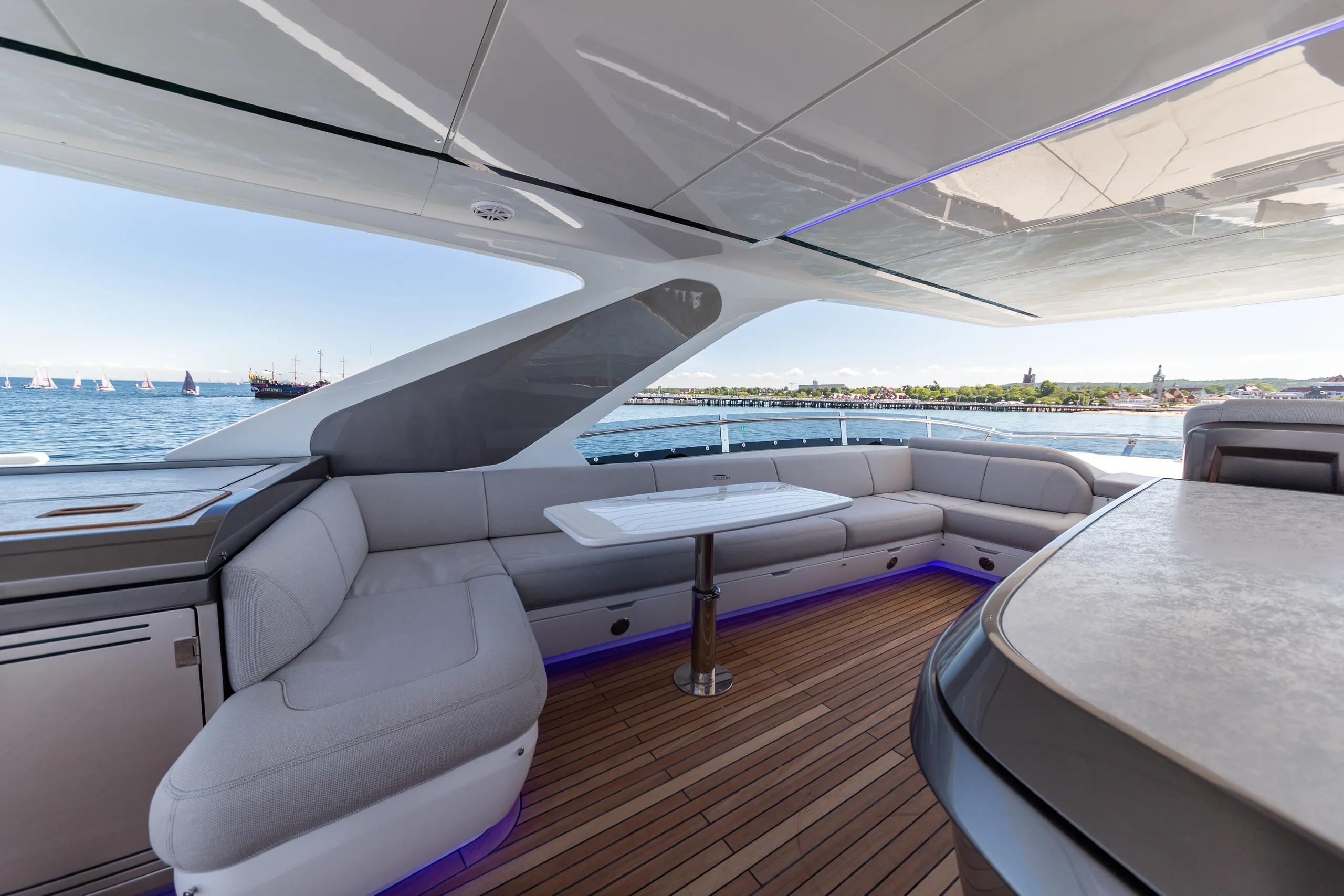 Strukturelemente aus Kohlefaser ermöglichten eine Vergrößerung der Fläche des Oberdecks, sodass wir dort nicht nur eine doppelte Steuerstandposition, eine voll ausgestattete Bar, einen komfortablen Sonnenbereich, vier Tische, die an die Bedürfnisse der Gäste angepasst werden können, sondern auch zwei separate, riesige, halbkreisförmige Sofas anbieten können, zwischen denen wir sehr stilvoll den Jacuzzi integriert haben. Auf dem Hauptdeck können wir die Innenräume genießen, die an die besten Apartments erinnern. Eine reich ausgestattete Kombüse mit einer eleganten Kücheninsel zieht alle Blicke auf sich. Neben der doppelten Steuerstandstation befindet sich ein komfortables Sofa mit einem Couchtisch, und direkt daneben ein majestätischer Tisch für 8 Personen. Das geschmackvoll eingerichtete Wohnzimmer bietet neben eleganten Sofas, die dazu einladen, längere Zeit bequem darauf zu verbringen, auch ungewöhnlich große Fenster, einen ausziehbaren Fernseher, eine moderne Bar und eine separate Tages-Toilette.