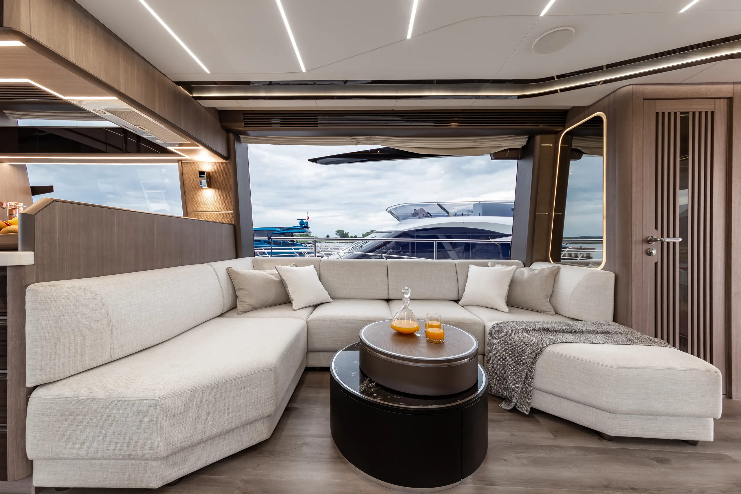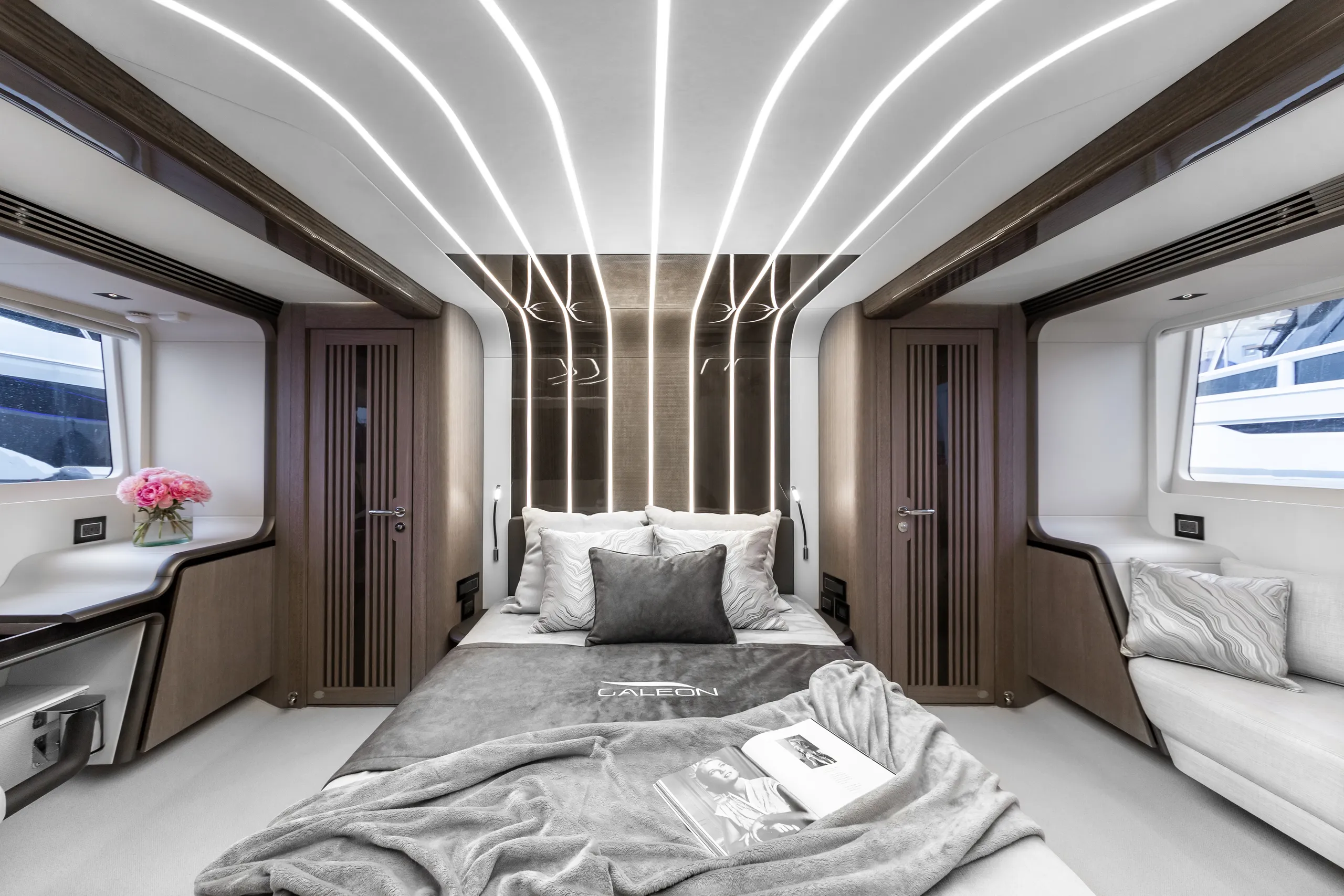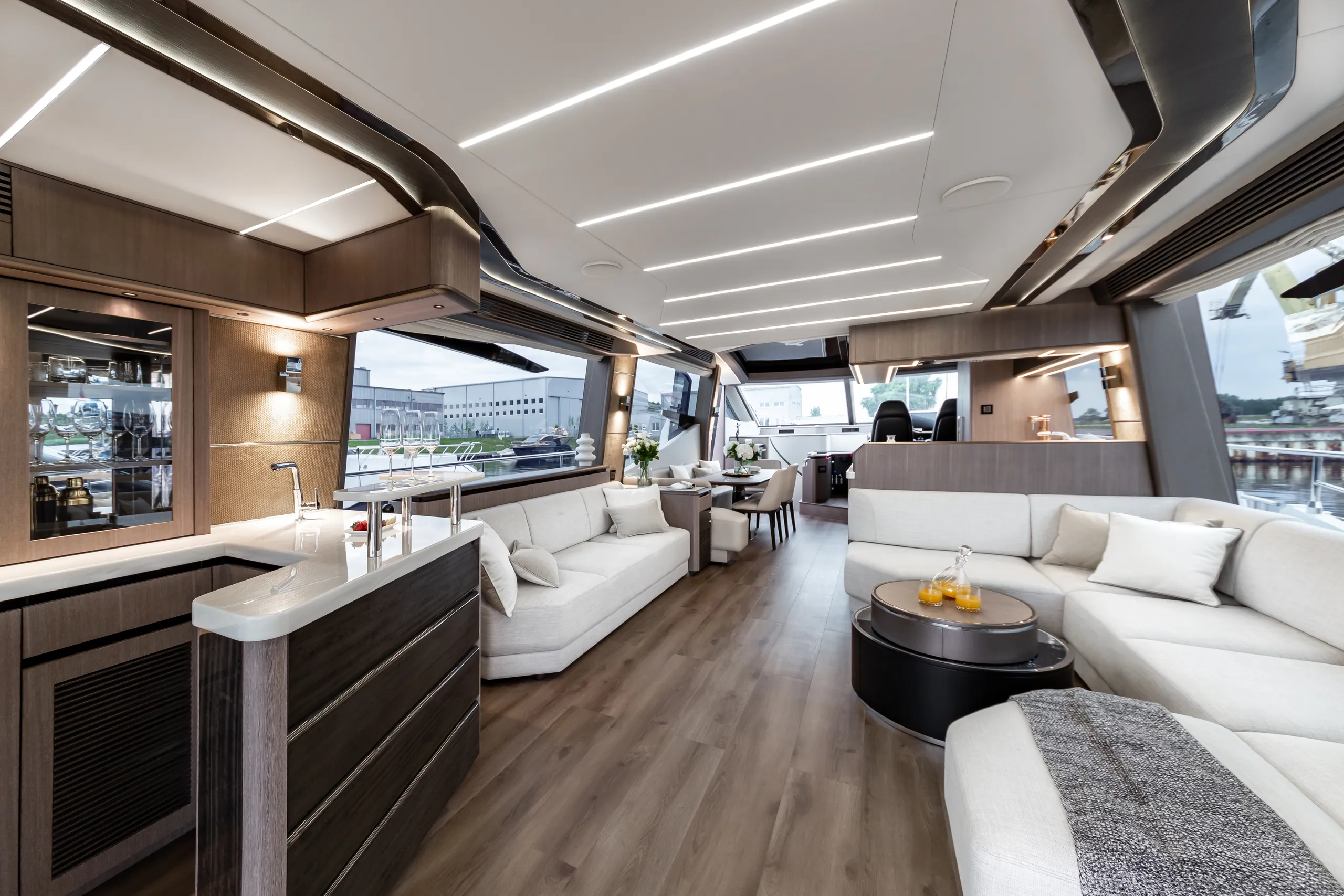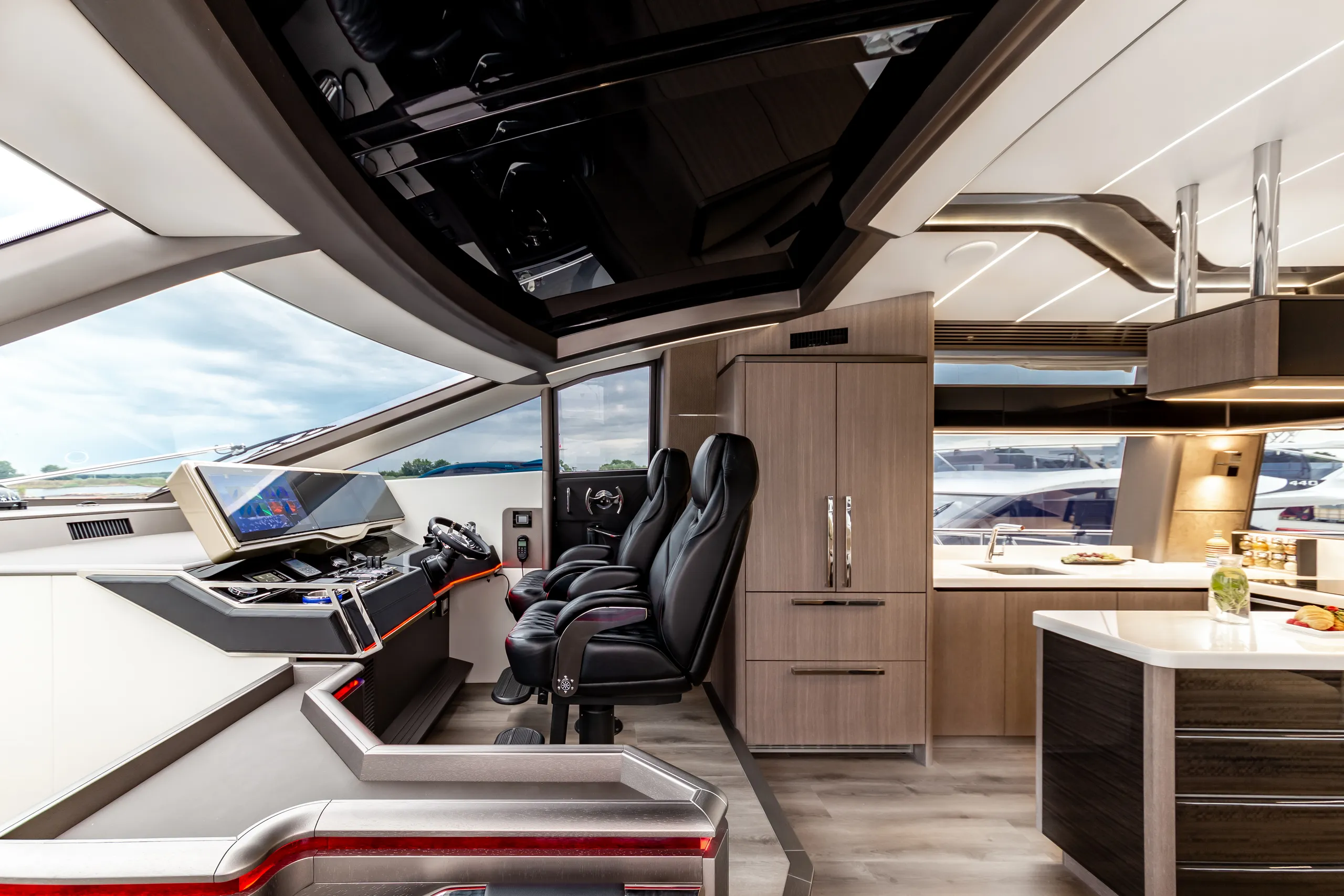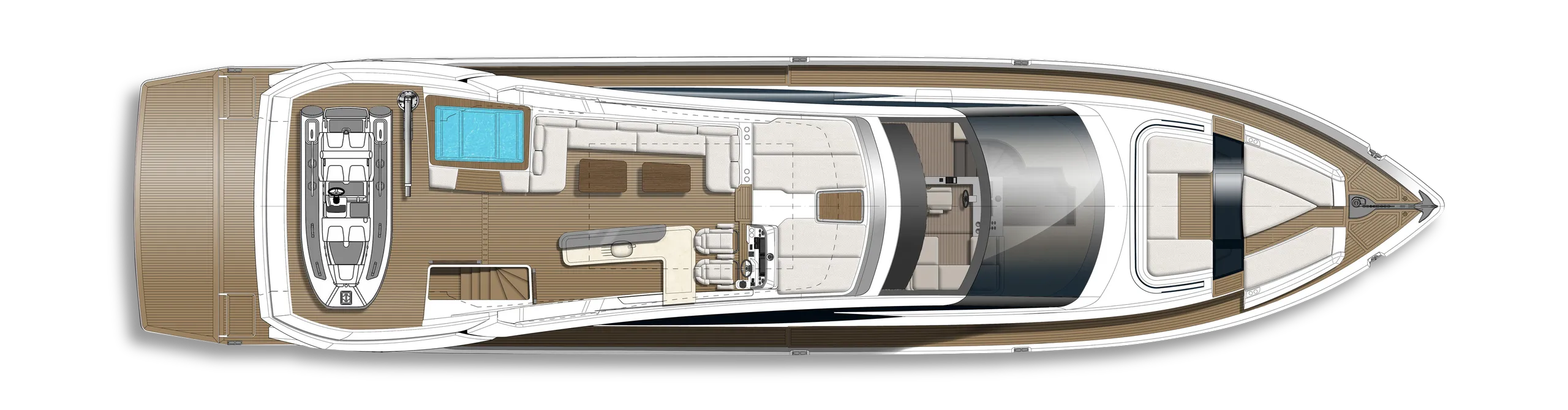 Strukturelemente aus Kohlefaser ermöglichten eine Vergrößerung der Fläche des Oberdecks, sodass wir dort nicht nur eine doppelte Steuerstandposition, eine voll ausgestattete Bar, einen komfortablen Sonnenbereich, vier Tische, die an die Bedürfnisse der Gäste angepasst werden können, sondern auch zwei separate, riesige, halbkreisförmige Sofas anbieten können, zwischen denen wir sehr stilvoll den Jacuzzi integriert haben. Auf dem Hauptdeck können wir die Innenräume genießen, die an die besten Apartments erinnern. Eine reich ausgestattete Kombüse mit einer eleganten Kücheninsel zieht alle Blicke auf sich. Neben der doppelten Steuerstandstation befindet sich ein komfortables Sofa mit einem Couchtisch, und direkt daneben ein majestätischer Tisch für 8 Personen. Das geschmackvoll eingerichtete Wohnzimmer bietet neben eleganten Sofas, die dazu einladen, längere Zeit bequem darauf zu verbringen, auch ungewöhnlich große Fenster, einen ausziehbaren Fernseher, eine moderne Bar und eine separate Tages-Toilette.