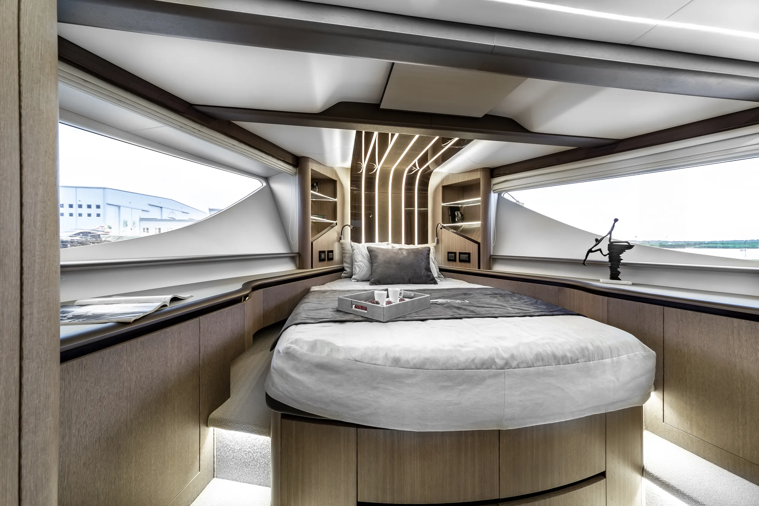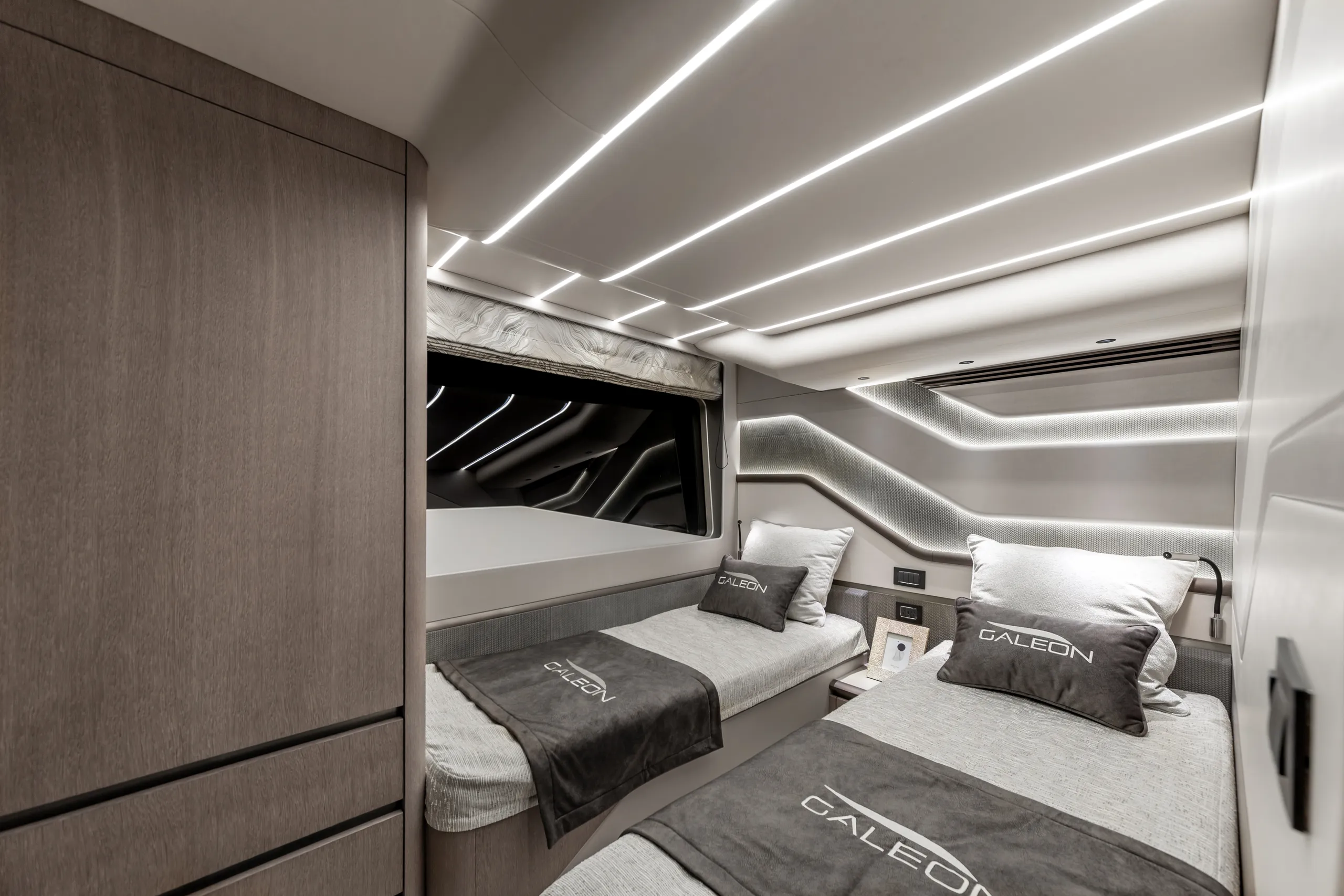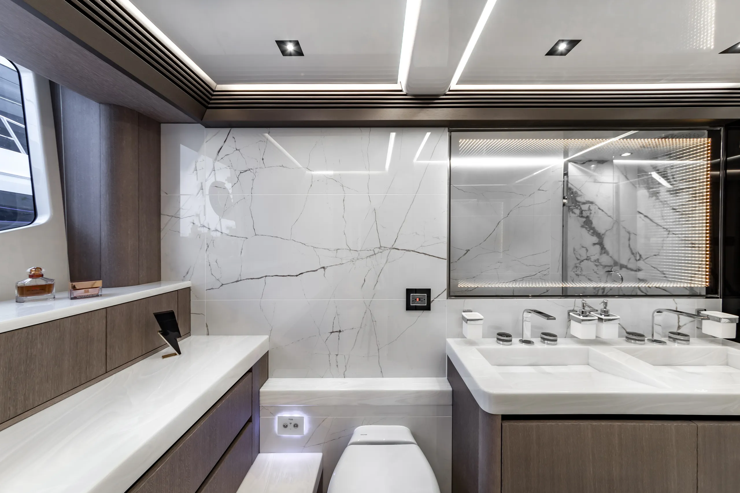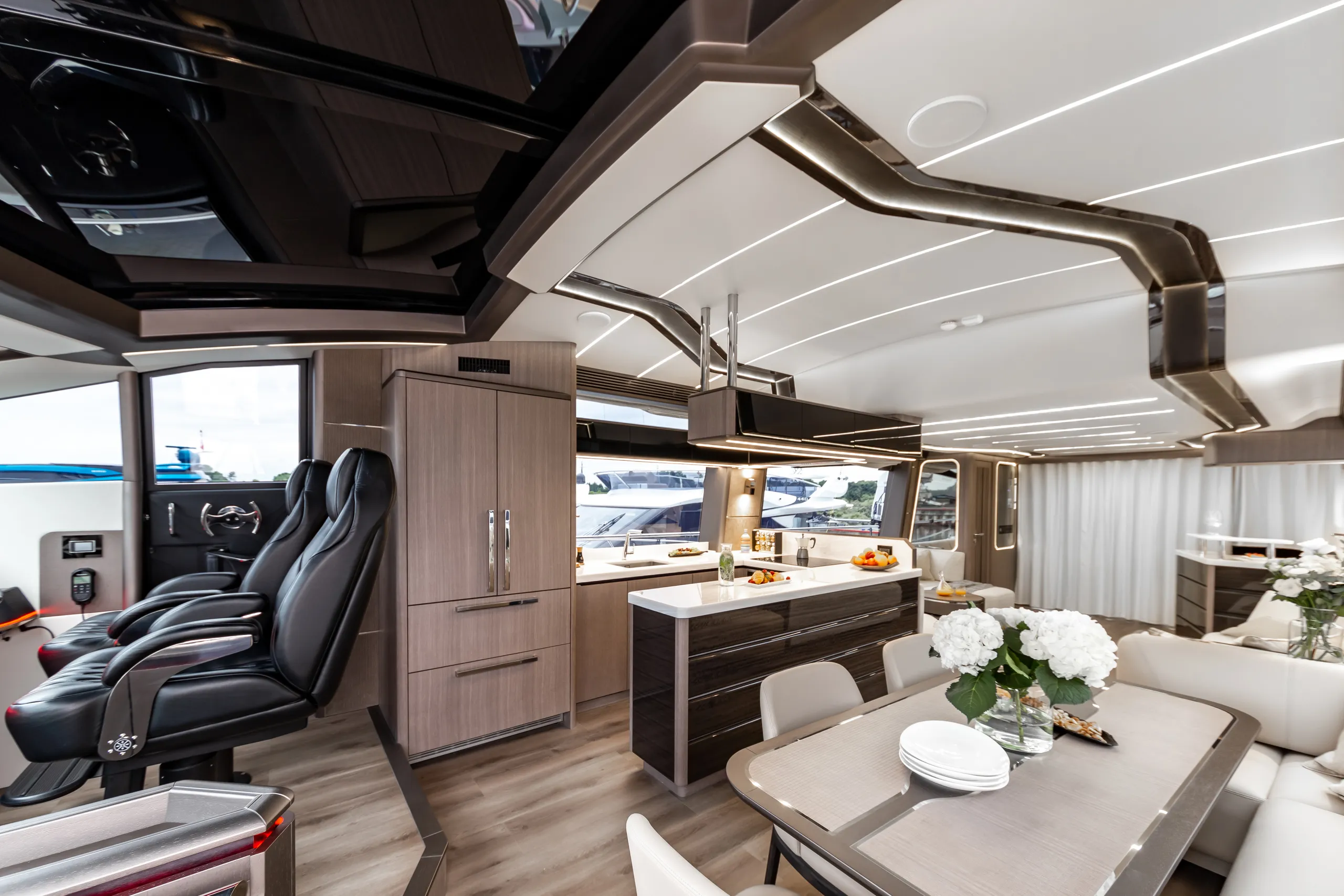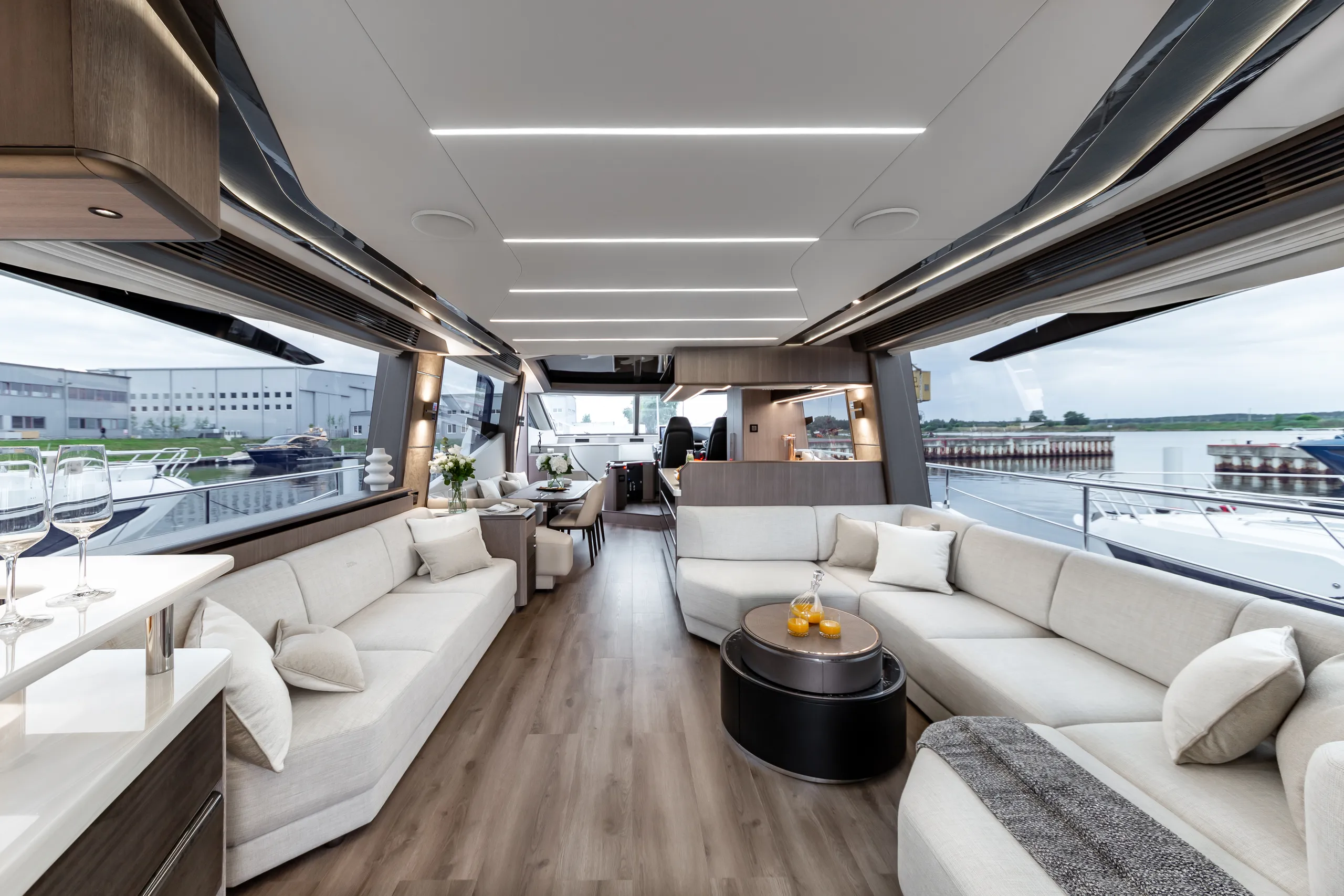 Strukturelemente aus Kohlefaser ermöglichten eine Vergrößerung der Fläche des Oberdecks, sodass wir dort nicht nur eine doppelte Steuerstandposition, eine voll ausgestattete Bar, einen komfortablen Sonnenbereich, vier Tische, die an die Bedürfnisse der Gäste angepasst werden können, sondern auch zwei separate, riesige, halbkreisförmige Sofas anbieten können, zwischen denen wir sehr stilvoll den Jacuzzi integriert haben. Auf dem Hauptdeck können wir die Innenräume genießen, die an die besten Apartments erinnern. Eine reich ausgestattete Kombüse mit einer eleganten Kücheninsel zieht alle Blicke auf sich. Neben der doppelten Steuerstandstation befindet sich ein komfortables Sofa mit einem Couchtisch, und direkt daneben ein majestätischer Tisch für 8 Personen. Das geschmackvoll eingerichtete Wohnzimmer bietet neben eleganten Sofas, die dazu einladen, längere Zeit bequem darauf zu verbringen, auch ungewöhnlich große Fenster, einen ausziehbaren Fernseher, eine moderne Bar und eine separate Tages-Toilette.