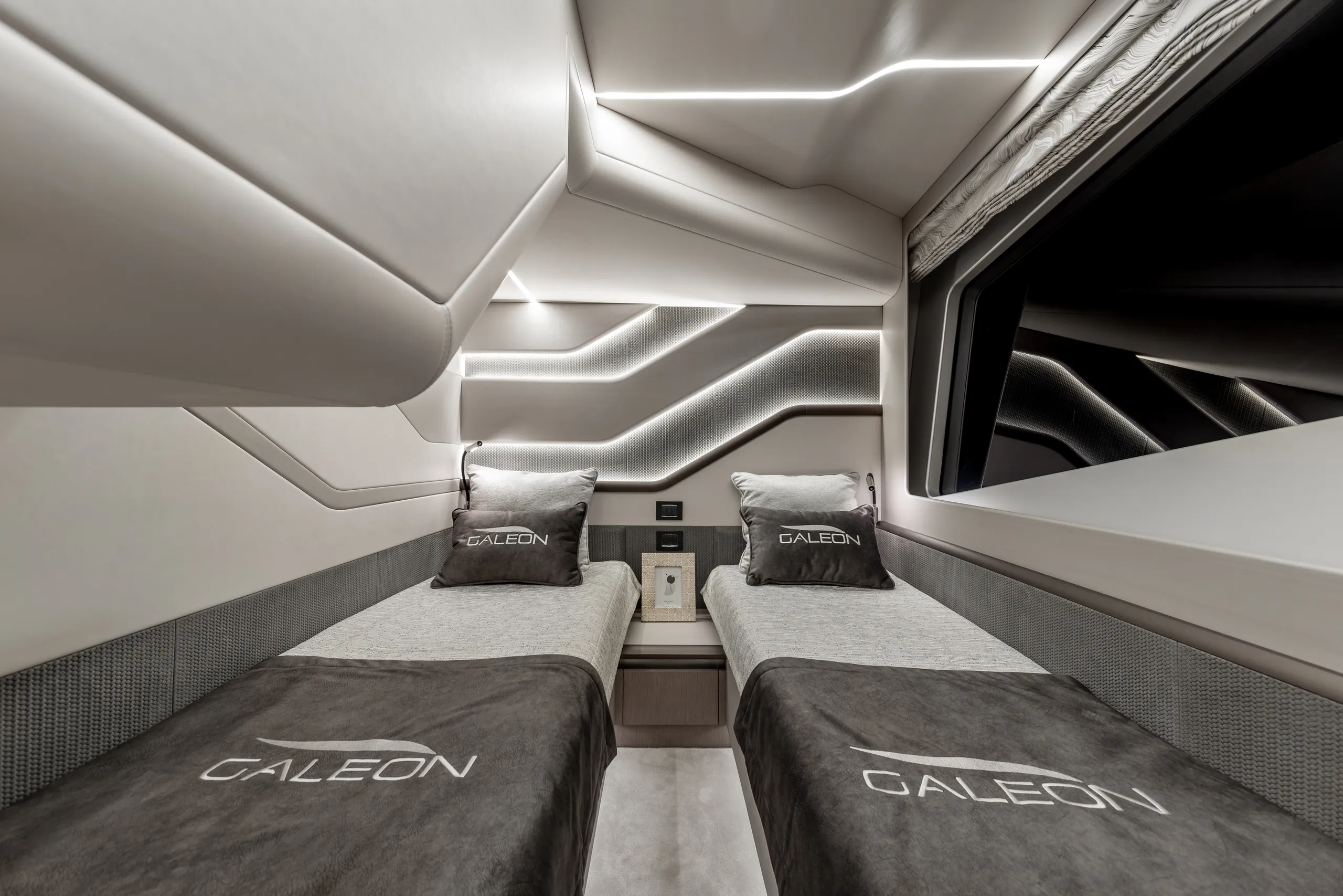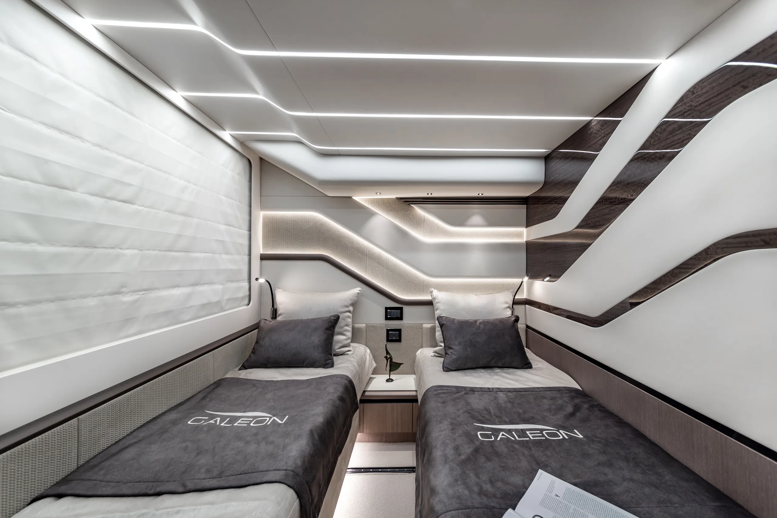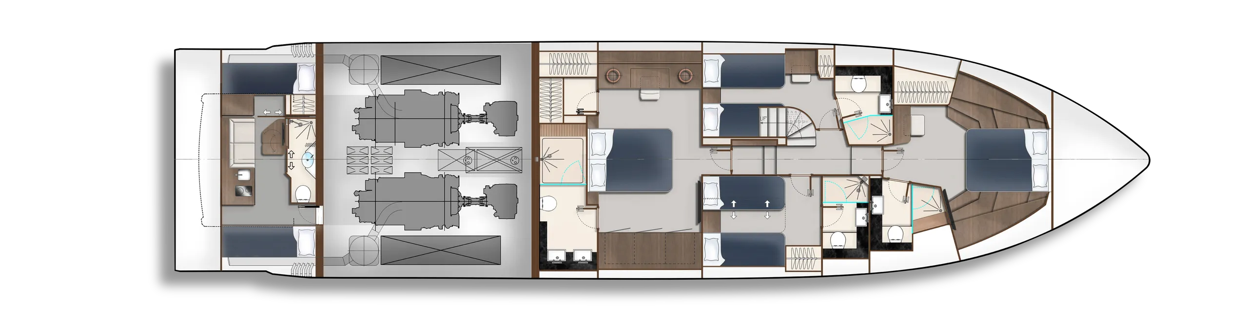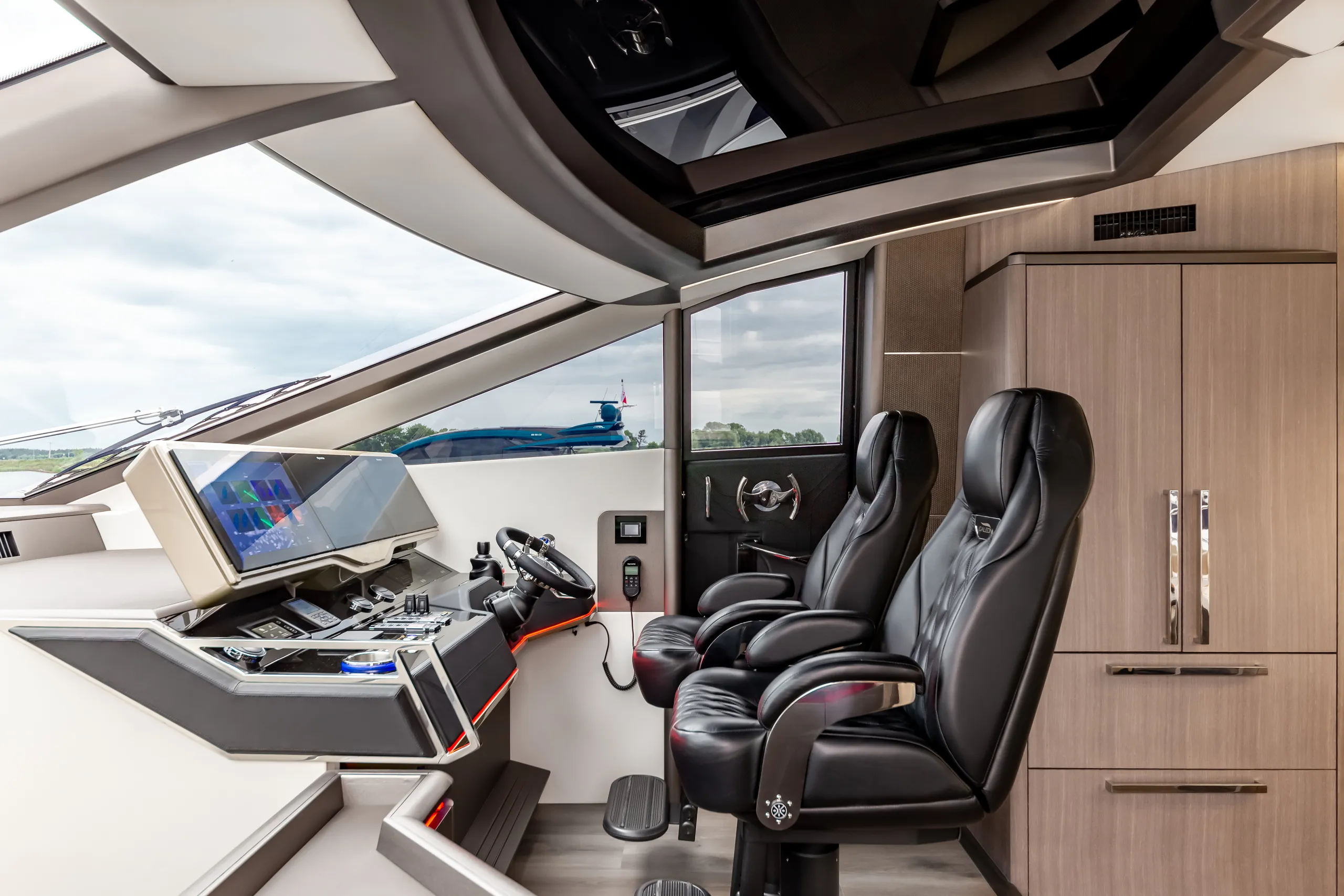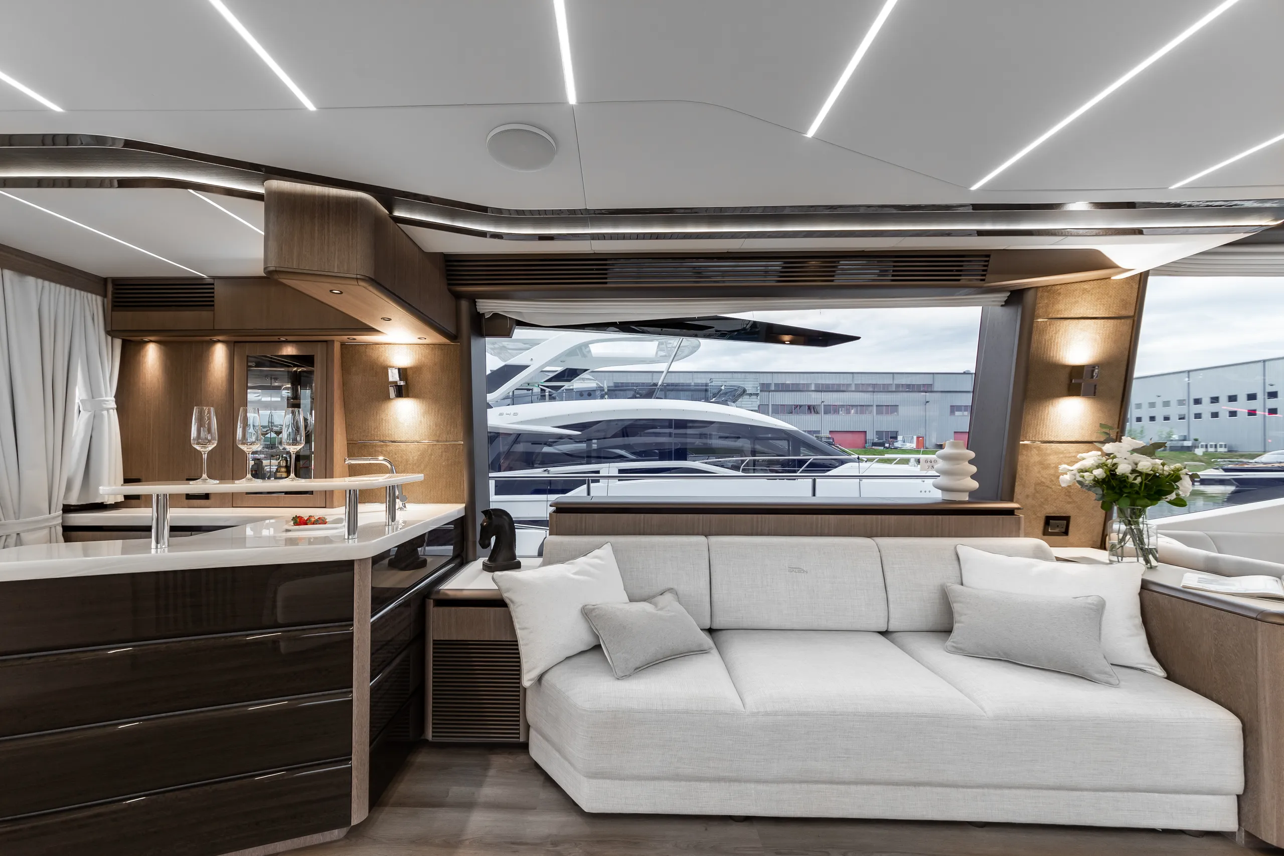 Strukturelemente aus Kohlefaser ermöglichten eine Vergrößerung der Fläche des Oberdecks, sodass wir dort nicht nur eine doppelte Steuerstandposition, eine voll ausgestattete Bar, einen komfortablen Sonnenbereich, vier Tische, die an die Bedürfnisse der Gäste angepasst werden können, sondern auch zwei separate, riesige, halbkreisförmige Sofas anbieten können, zwischen denen wir sehr stilvoll den Jacuzzi integriert haben. Auf dem Hauptdeck können wir die Innenräume genießen, die an die besten Apartments erinnern. Eine reich ausgestattete Kombüse mit einer eleganten Kücheninsel zieht alle Blicke auf sich. Neben der doppelten Steuerstandstation befindet sich ein komfortables Sofa mit einem Couchtisch, und direkt daneben ein majestätischer Tisch für 8 Personen. Das geschmackvoll eingerichtete Wohnzimmer bietet neben eleganten Sofas, die dazu einladen, längere Zeit bequem darauf zu verbringen, auch ungewöhnlich große Fenster, einen ausziehbaren Fernseher, eine moderne Bar und eine separate Tages-Toilette.