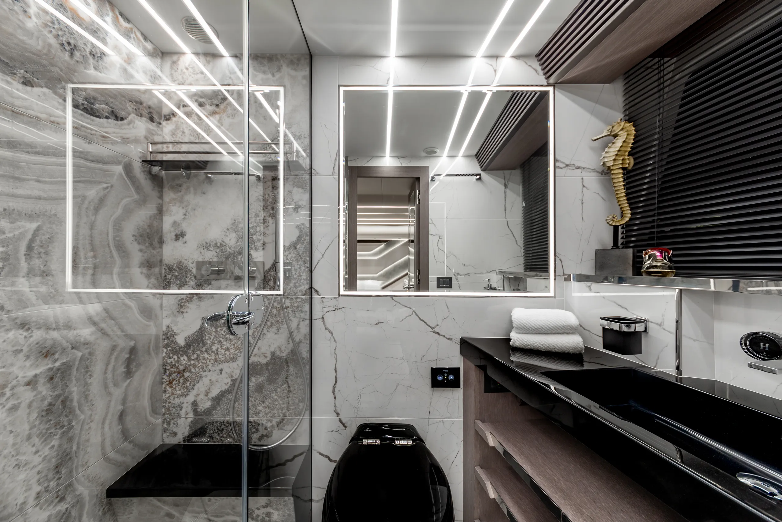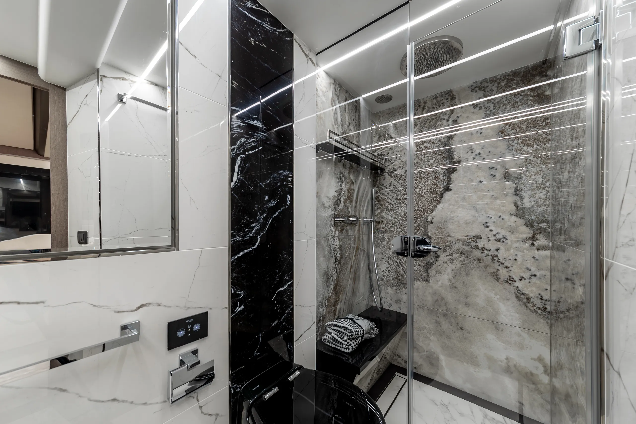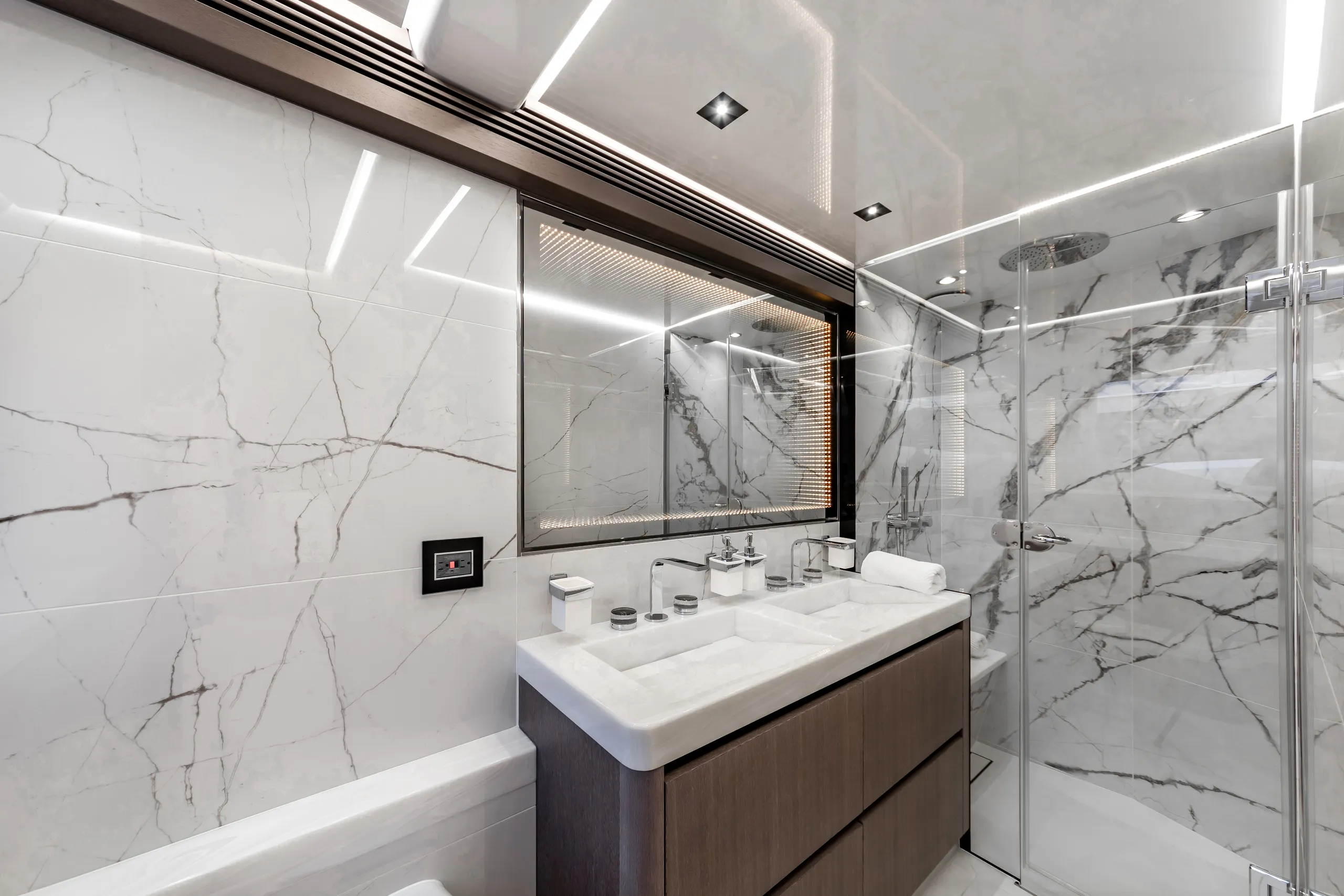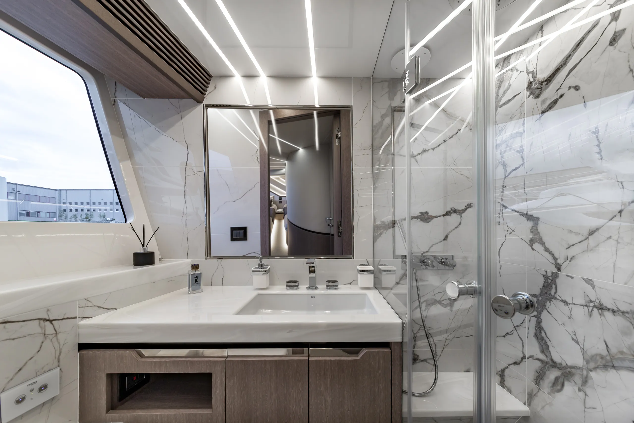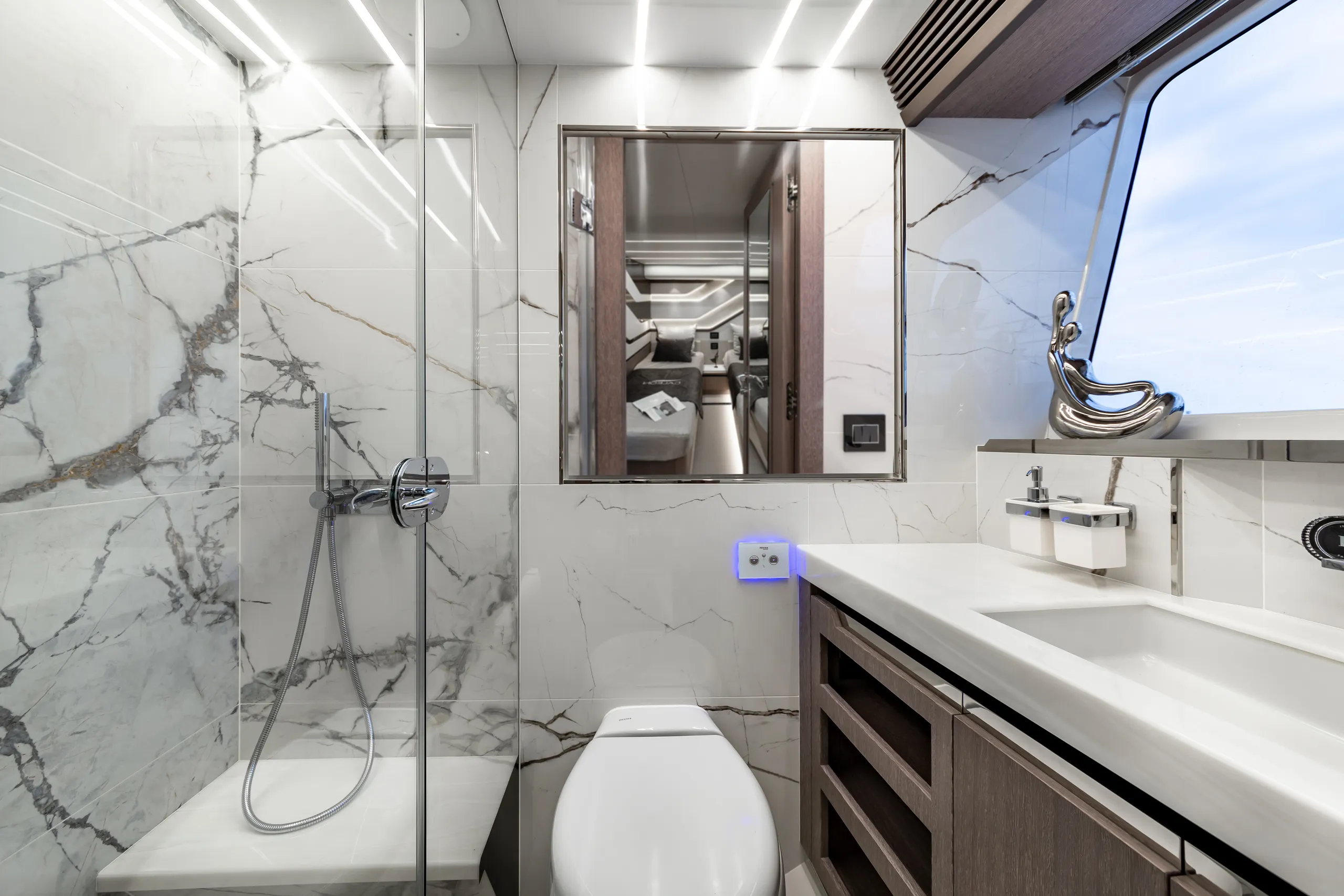 Strukturelemente aus Kohlefaser ermöglichten eine Vergrößerung der Fläche des Oberdecks, sodass wir dort nicht nur eine doppelte Steuerstandposition, eine voll ausgestattete Bar, einen komfortablen Sonnenbereich, vier Tische, die an die Bedürfnisse der Gäste angepasst werden können, sondern auch zwei separate, riesige, halbkreisförmige Sofas anbieten können, zwischen denen wir sehr stilvoll den Jacuzzi integriert haben. Auf dem Hauptdeck können wir die Innenräume genießen, die an die besten Apartments erinnern. Eine reich ausgestattete Kombüse mit einer eleganten Kücheninsel zieht alle Blicke auf sich. Neben der doppelten Steuerstandstation befindet sich ein komfortables Sofa mit einem Couchtisch, und direkt daneben ein majestätischer Tisch für 8 Personen. Das geschmackvoll eingerichtete Wohnzimmer bietet neben eleganten Sofas, die dazu einladen, längere Zeit bequem darauf zu verbringen, auch ungewöhnlich große Fenster, einen ausziehbaren Fernseher, eine moderne Bar und eine separate Tages-Toilette.