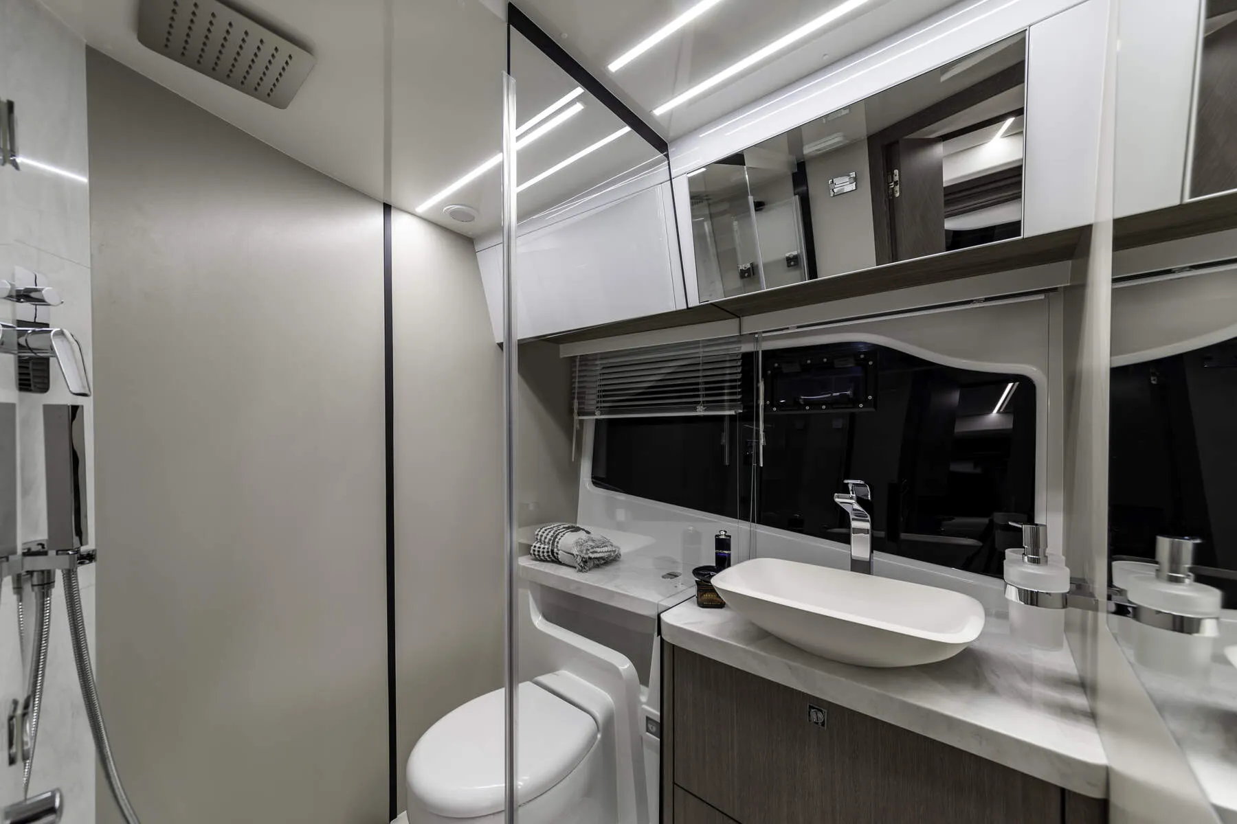 • Holz-/Aluminium-Jalousien in den Kabinen