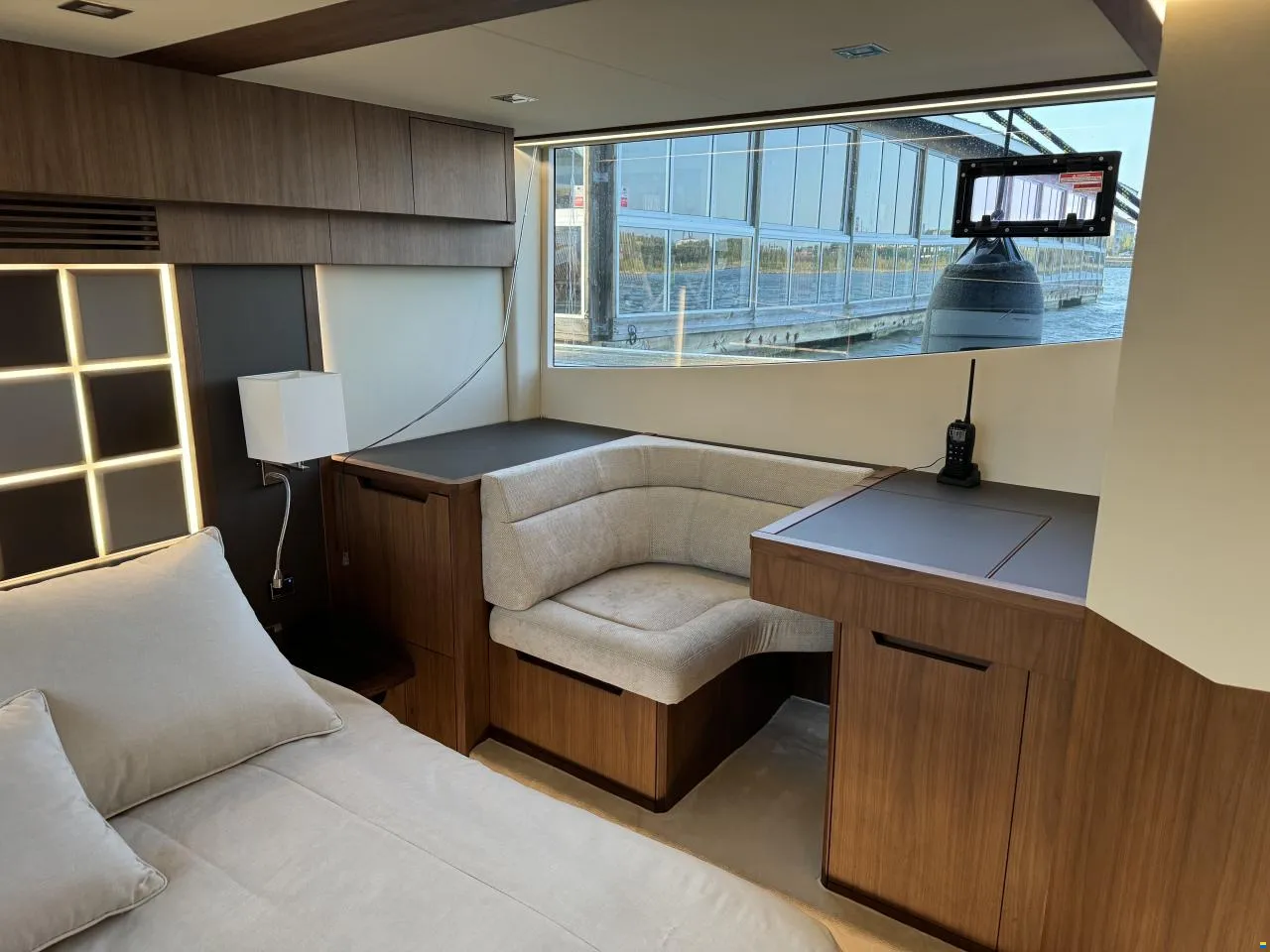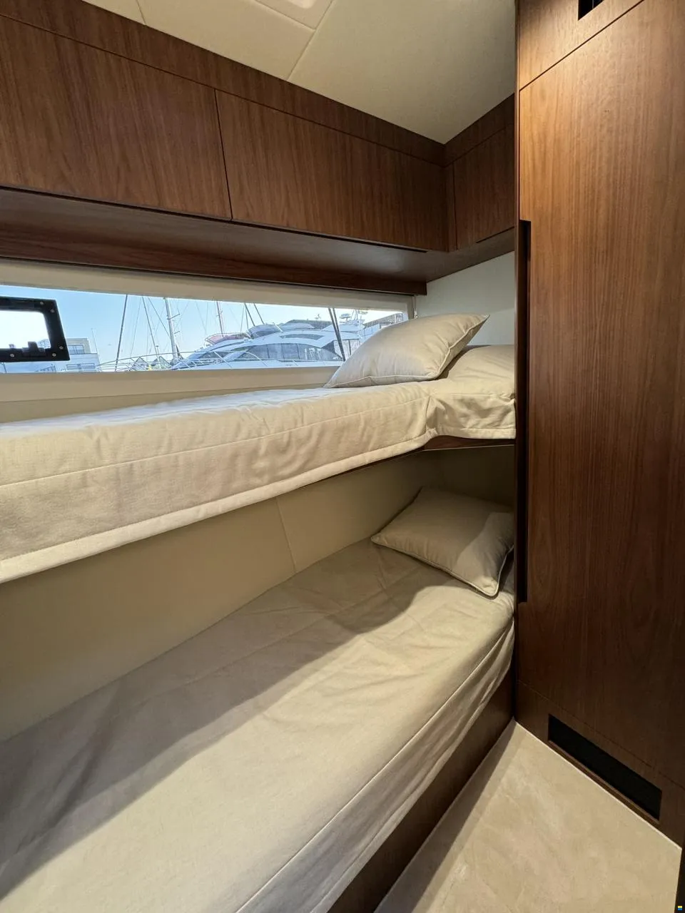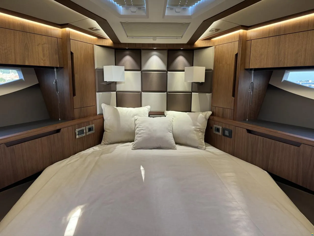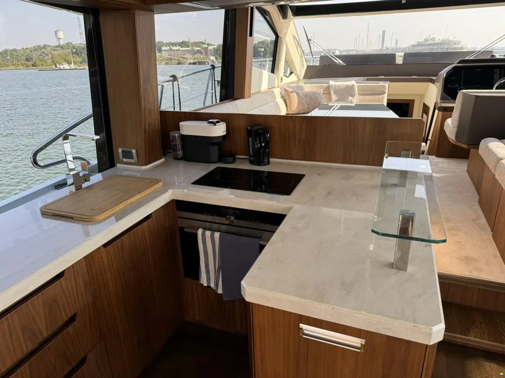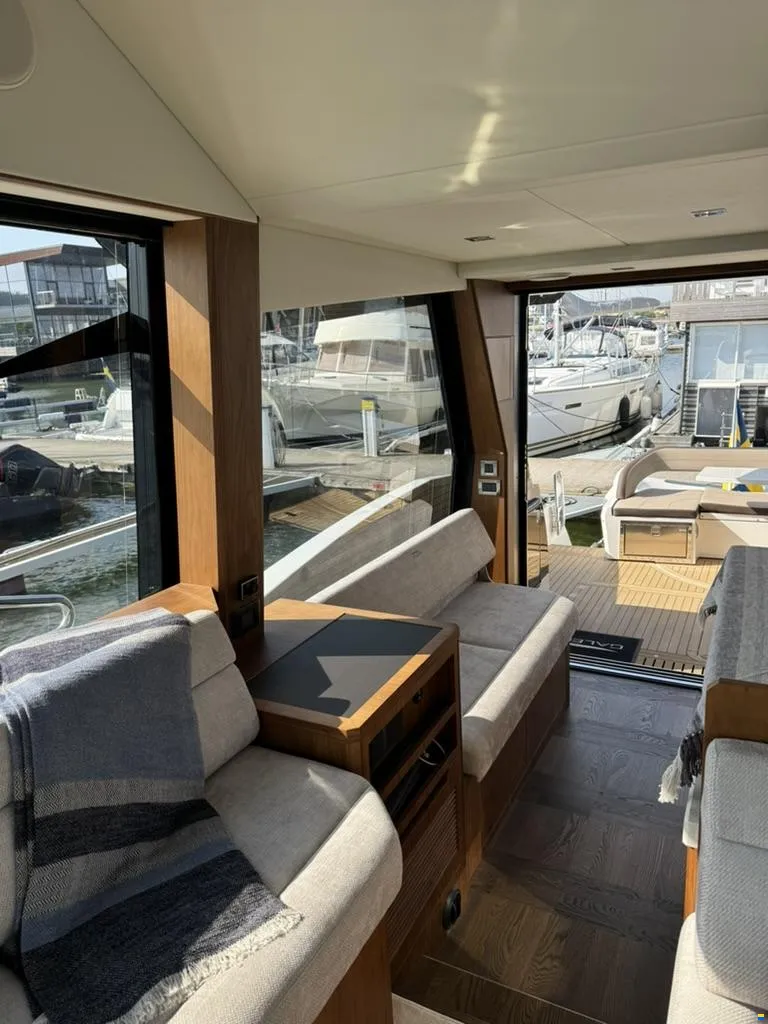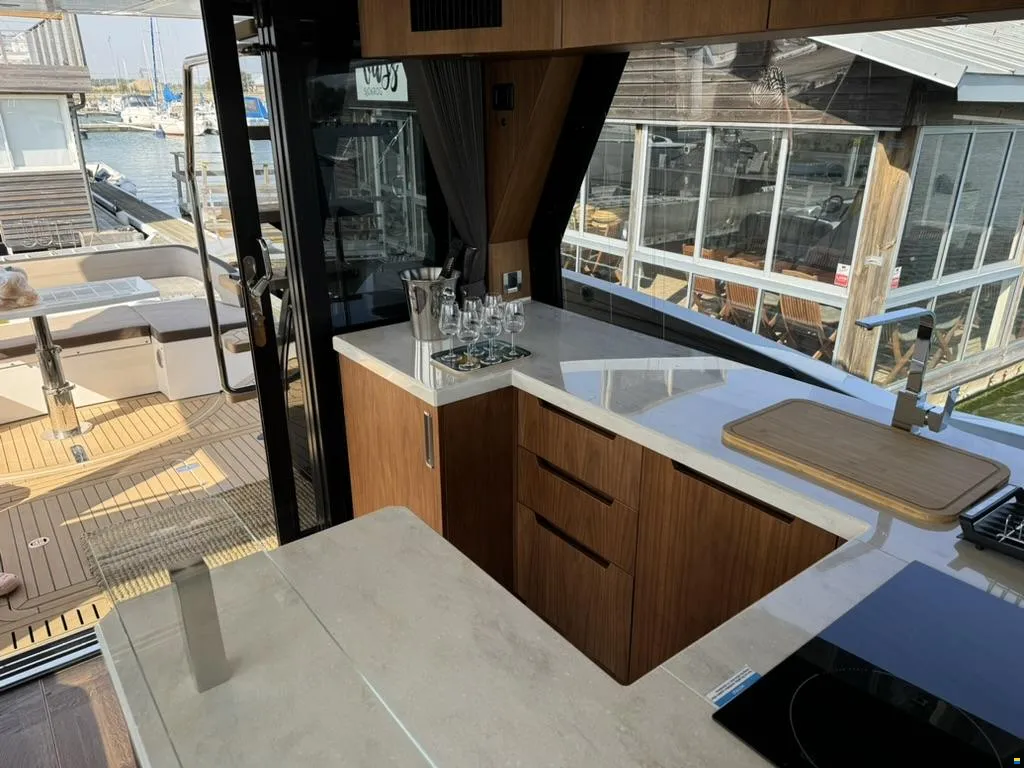 Separater Gang zu den Kabinen und dem Badezimmer. Jollegarage für ein Williams 330 im Heck mit Winde. Im Inneren des Bootes werden Sie von großen Fenstern empfangen, die für maximales Licht sorgen. Hier können Sie Sekt und Canapés für die Gäste an der Bar servieren.