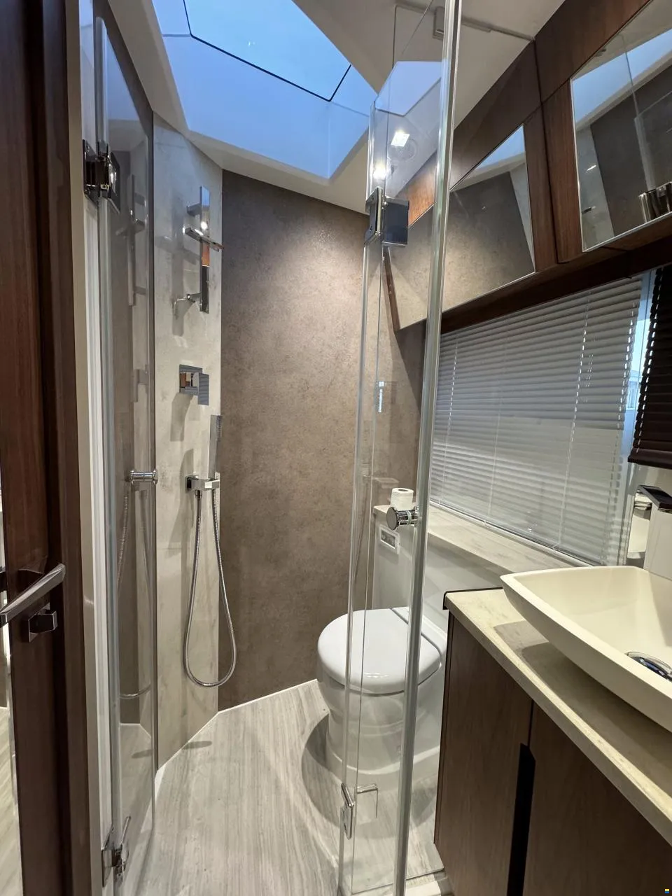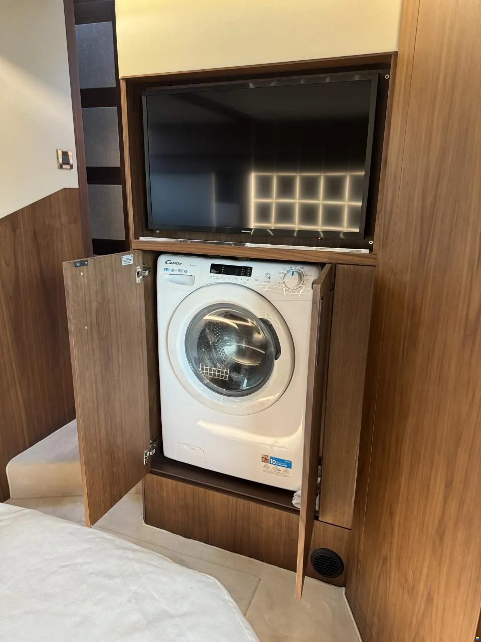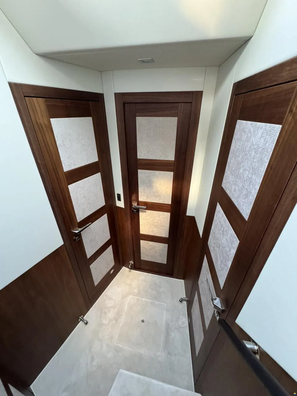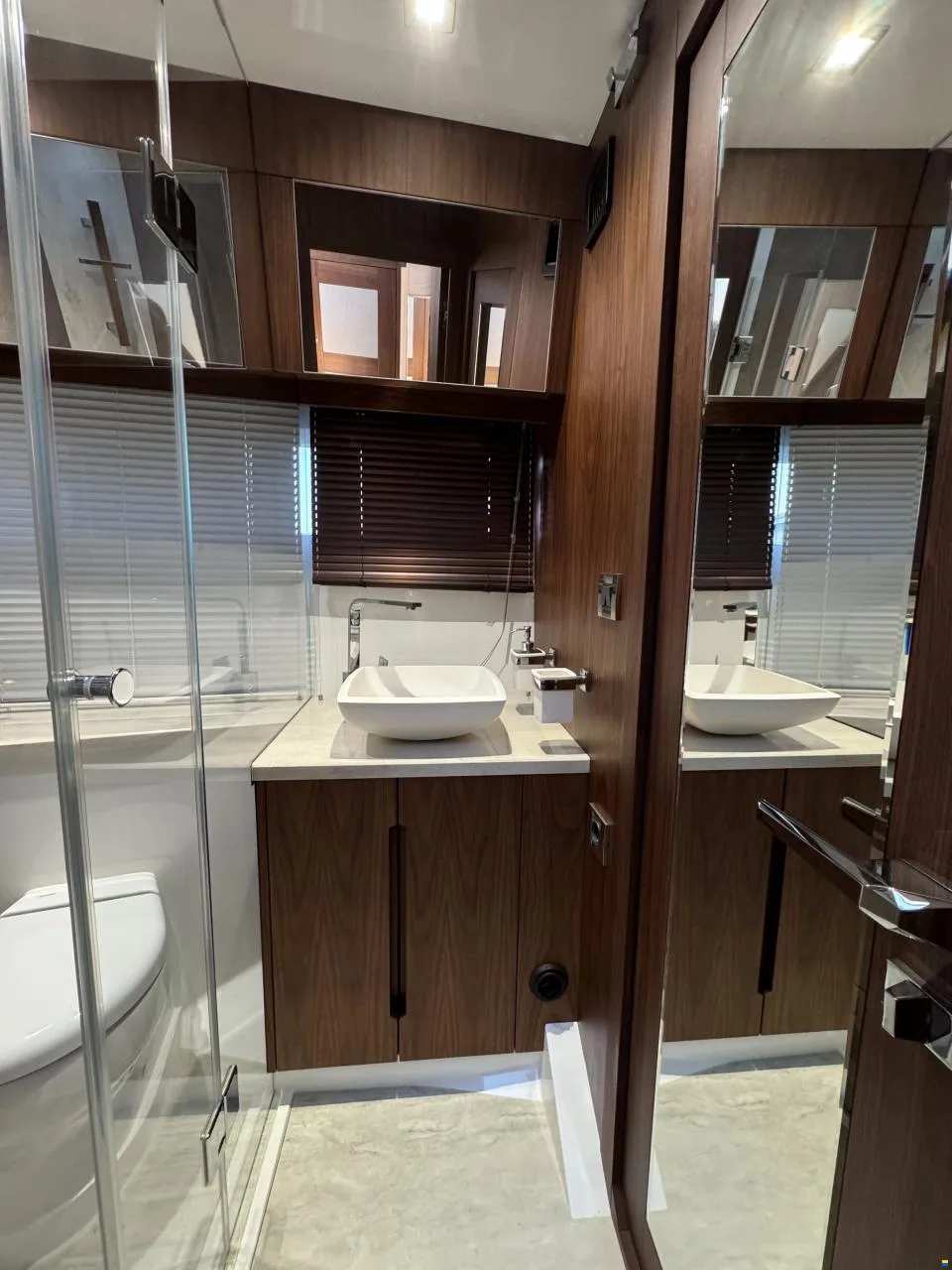 Separater Gang zu den Kabinen und dem Badezimmer. Jollegarage für ein Williams 330 im Heck mit Winde. Im Inneren des Bootes werden Sie von großen Fenstern empfangen, die für maximales Licht sorgen. Hier können Sie Sekt und Canapés für die Gäste an der Bar servieren.