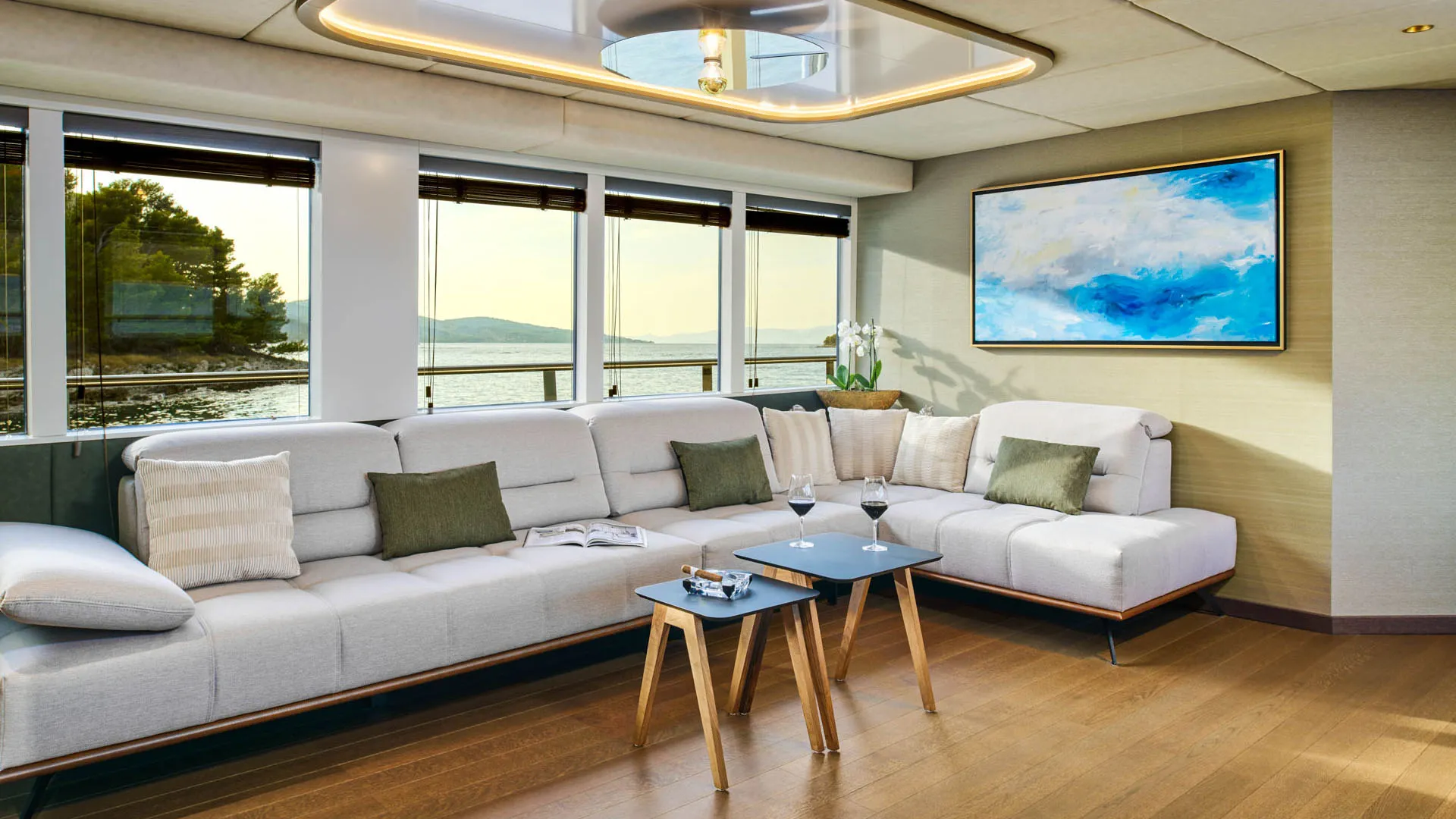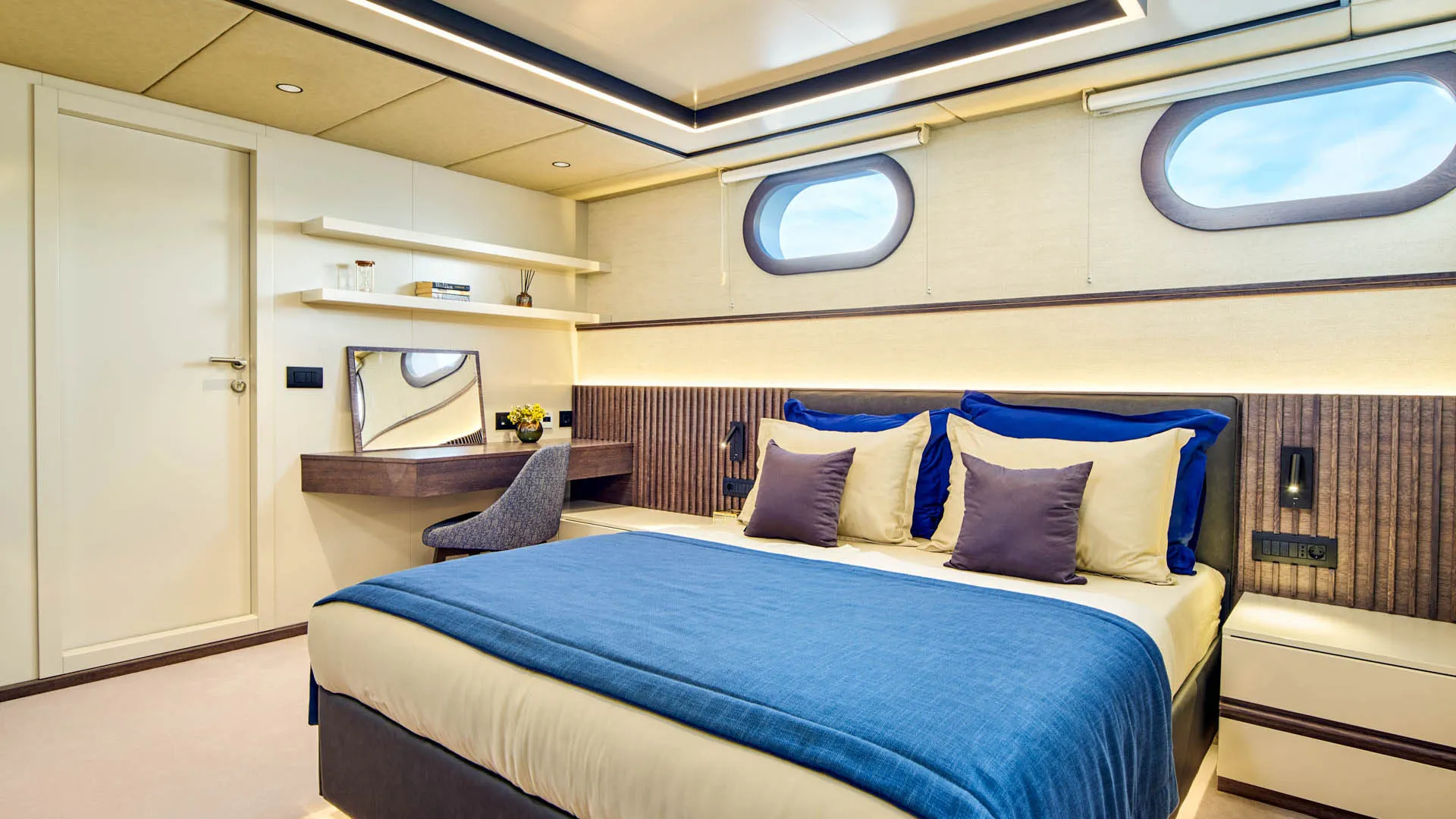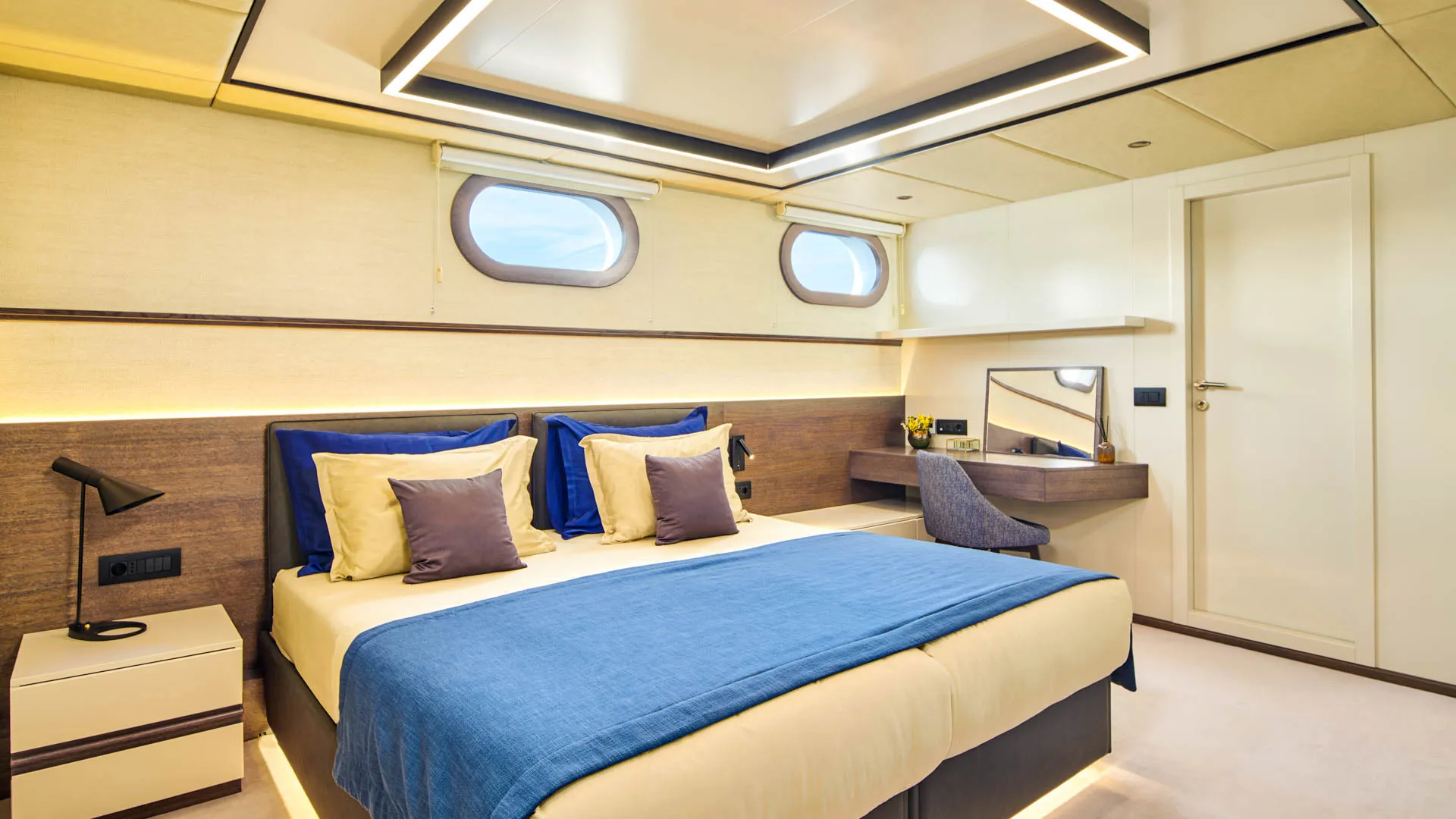 El yate de lujo Anima Maris presenta un interior elegante complementado con madera oscura, mármol y comodidades de lujo. Sin lugar a dudas, los suelos de madera, el mobiliario estiloso y las decoraciones discretas crean una atmósfera acogedora. El salón cuenta con una elegante sala de estar y un bar lounge equipado con un sistema de audio y video de última generación. Además, Anima Maris ofrece el máximo nivel de confort para cada invitado en 6 camarotes de lujo con baño privado. Este yate de línea personalizada cuenta con 1 Master, 1 VIP, 2 Dobles y 2 Twin convertibles. Cada camarote dispone de armario, TV, Wi-Fi, caja fuerte y un interfono. También, el servicio de habitaciones está disponible para el máximo confort de cada invitado. Finalmente, una tripulación local excepcional se encargará de ofrecer una experiencia de crucero de 5 estrellas a sus invitados.