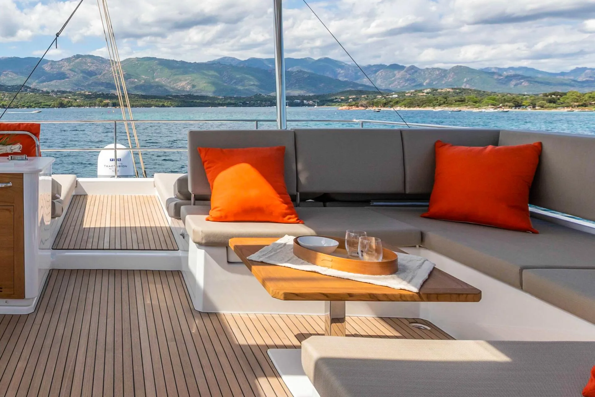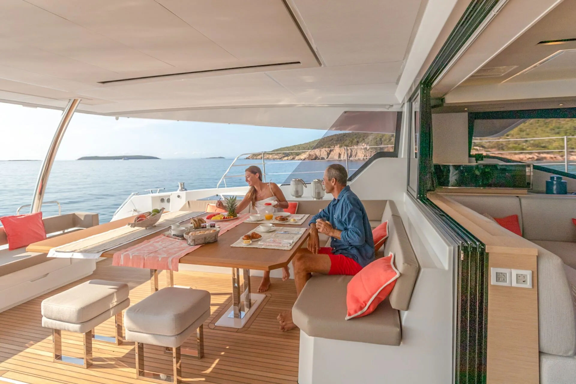 El FP67 Alegria proporciona la combinación perfecta de sofisticación y relajación, con cabinas espaciosas, comodidades modernas y un ambiente acogedor. El espacio exterior es impresionante, con una hermosa cubierta de teca que abarca gran parte del área. Al frente, encontrará los populares trampolines, junto con un salón rebajado y un acogedor jacuzzi. El flybridge ofrece un entorno ideal para cócteles con vistas impresionantes, mientras que tanto el cockpit como el flybridge proporcionan generosas áreas para cenar y relajarse. Ya sea disfrutando de una comida en las elegantes áreas de comedor, relajándose en el flybridge o sumergiéndose en el jacuzzi, cada momento a bordo está diseñado para el máximo deleite.