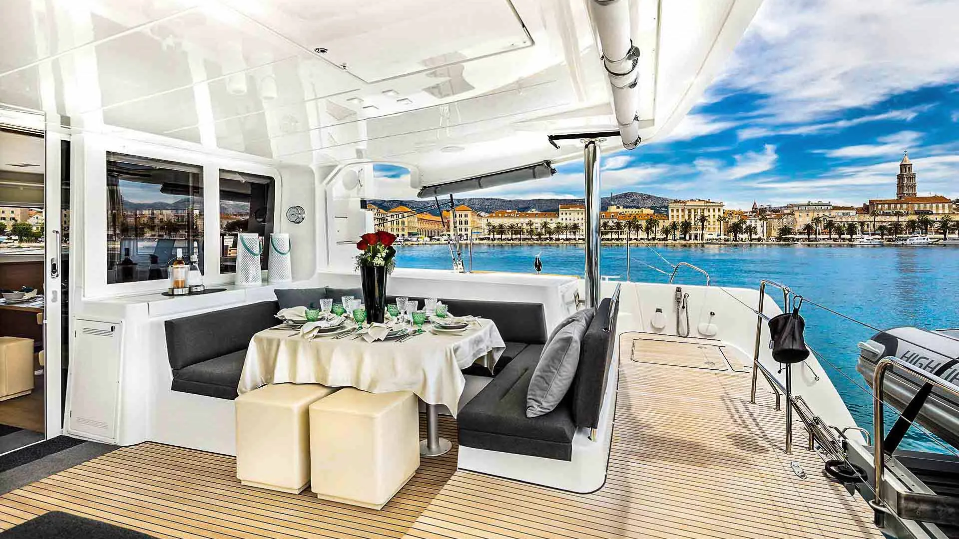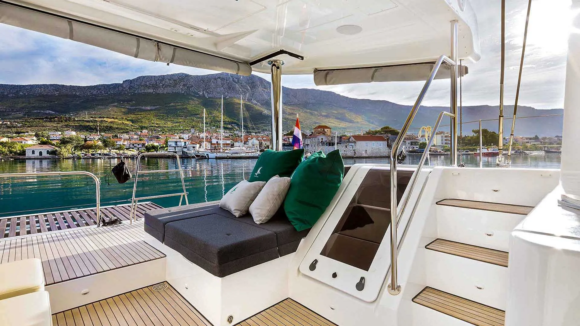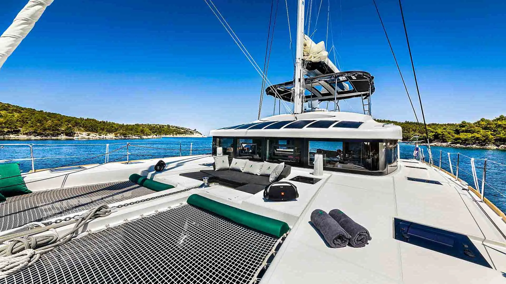 El área de proa excepcional de este yate Lagoon es espaciosa y para muchos el lugar favorito a bordo. Por lo tanto, es simplemente perfecto para tomar el sol y disfrutar de las vistas del Adriático. Además, el pequeño espacio de descanso en la proa del Lagoon 52 F está diseñado para una privacidad total cuando se está amarrado en una marina. Las amplias cubiertas laterales aseguran un movimiento fácil a bordo. Además, el encantador flybridge cuenta con un área de descanso modular extra funcional. Finalmente, el salón y el cockpit al mismo nivel aseguran un área de estar espaciosa. El área de comedor en popa puede estar completamente protegida del viento o de una breve lluvia de verano, lo que la hace perfecta para todos los momentos de vacaciones. El Lagoon 52 realmente parece una hermosa villa en el mar, completamente independiente de las marinas gracias al generador y al desalinizador disponibles.