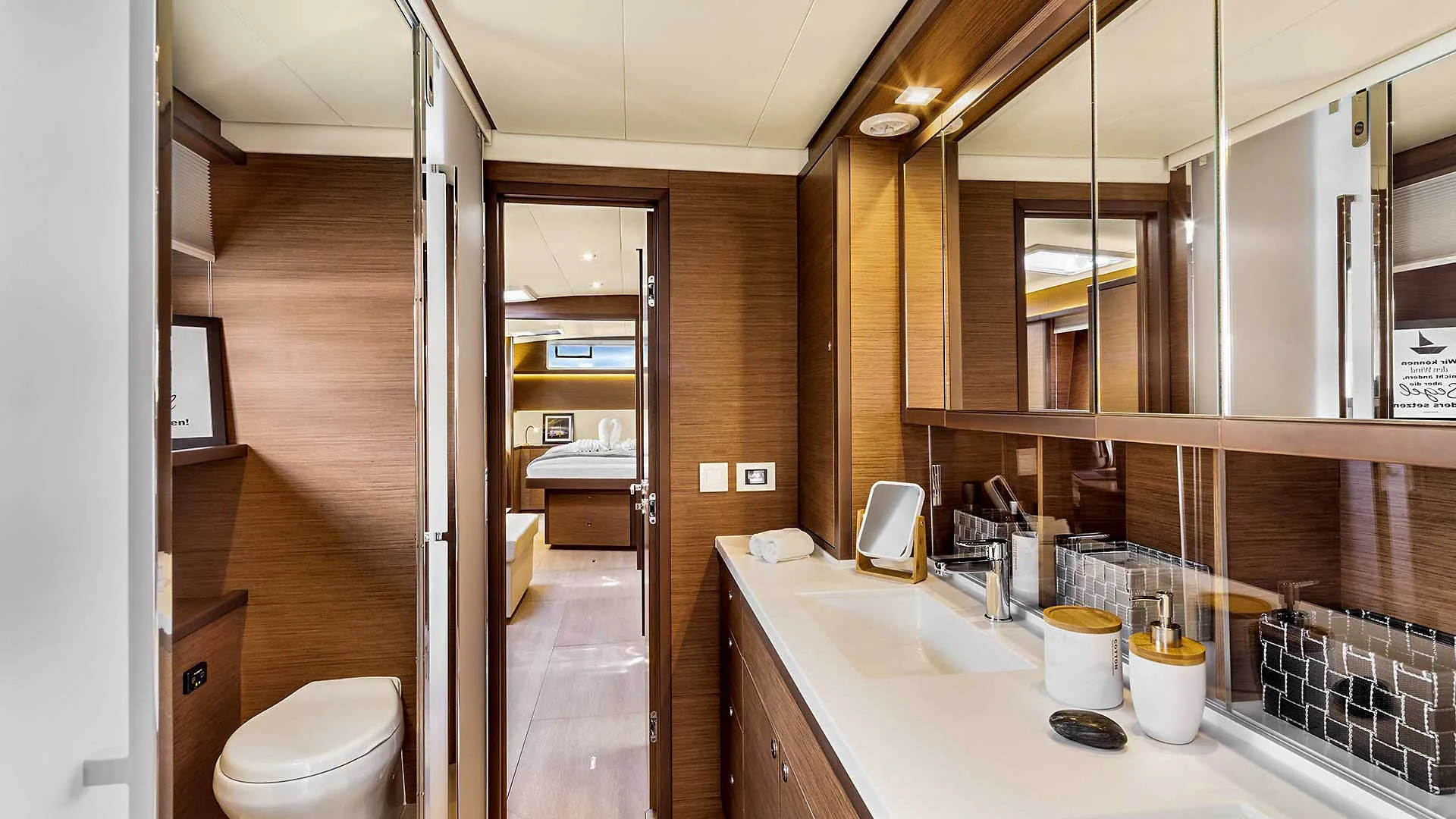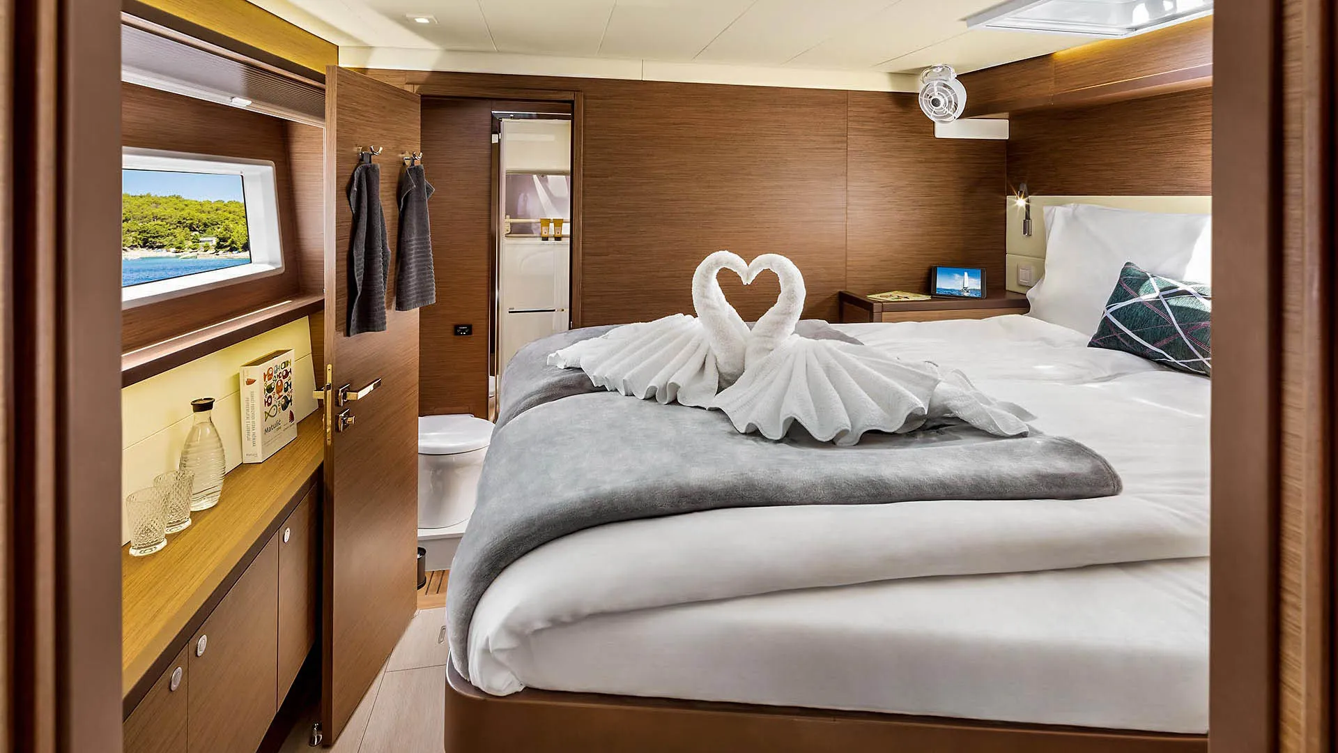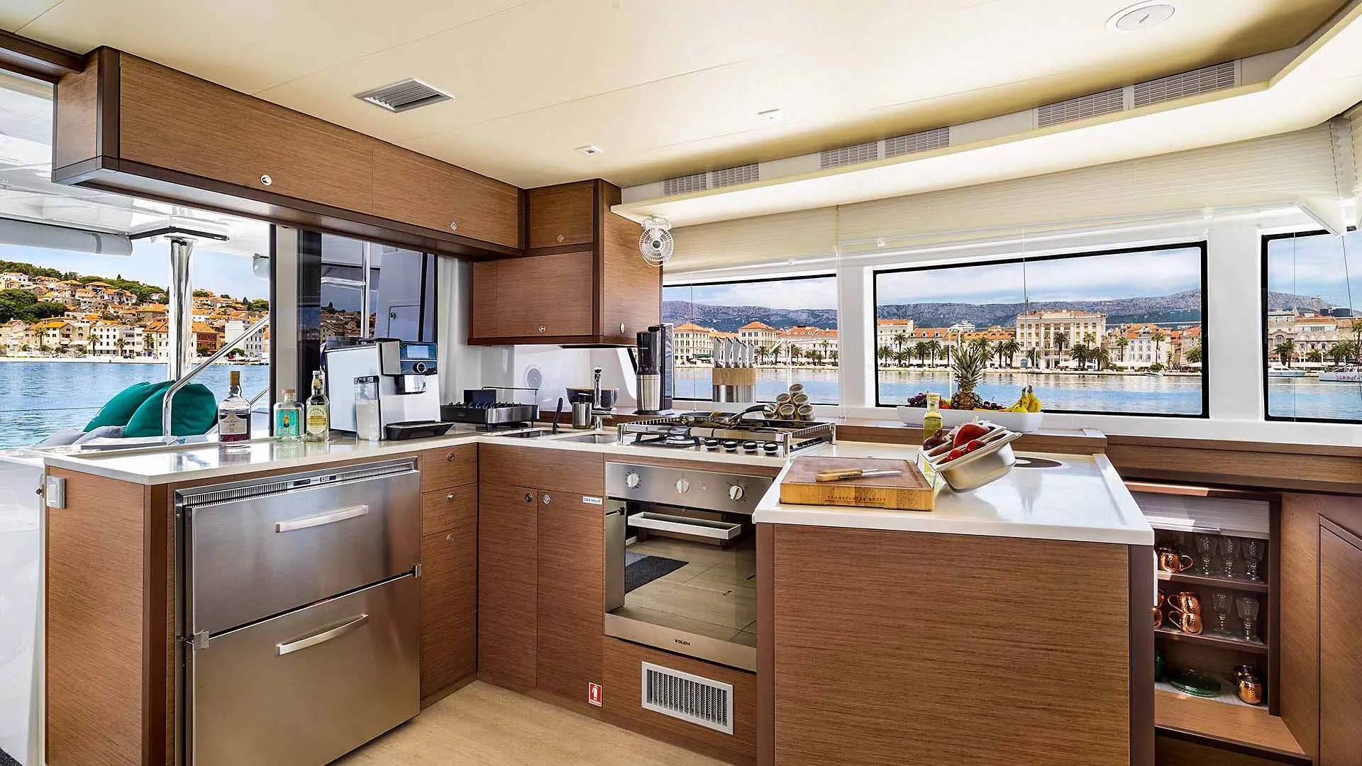 El área de proa excepcional de este yate Lagoon es espaciosa y para muchos el lugar favorito a bordo. Por lo tanto, es simplemente perfecto para tomar el sol y disfrutar de las vistas del Adriático. Además, el pequeño espacio de descanso en la proa del Lagoon 52 F está diseñado para una privacidad total cuando se está amarrado en una marina. Las amplias cubiertas laterales aseguran un movimiento fácil a bordo. Además, el encantador flybridge cuenta con un área de descanso modular extra funcional. Finalmente, el salón y el cockpit al mismo nivel aseguran un área de estar espaciosa. El área de comedor en popa puede estar completamente protegida del viento o de una breve lluvia de verano, lo que la hace perfecta para todos los momentos de vacaciones. El Lagoon 52 realmente parece una hermosa villa en el mar, completamente independiente de las marinas gracias al generador y al desalinizador disponibles.