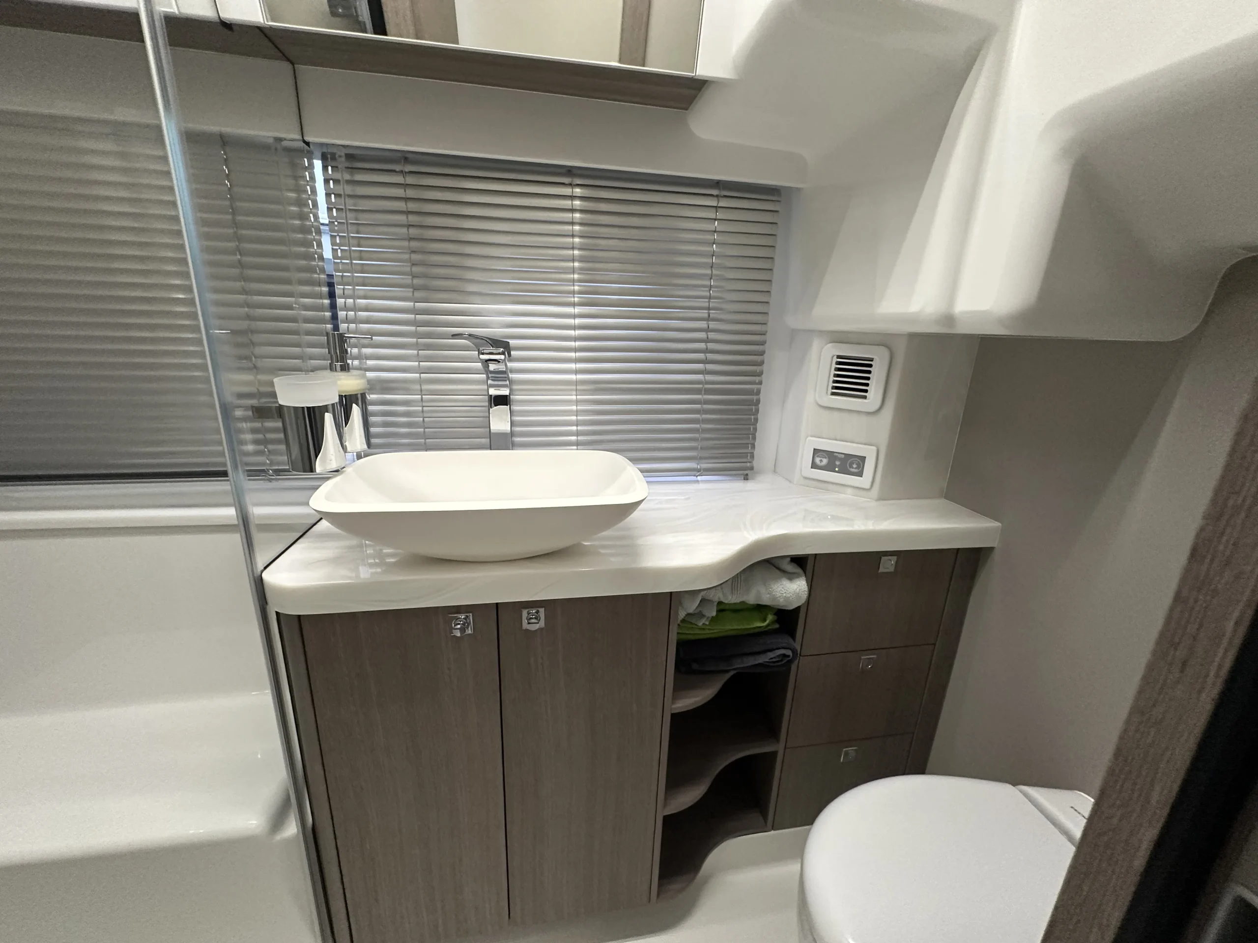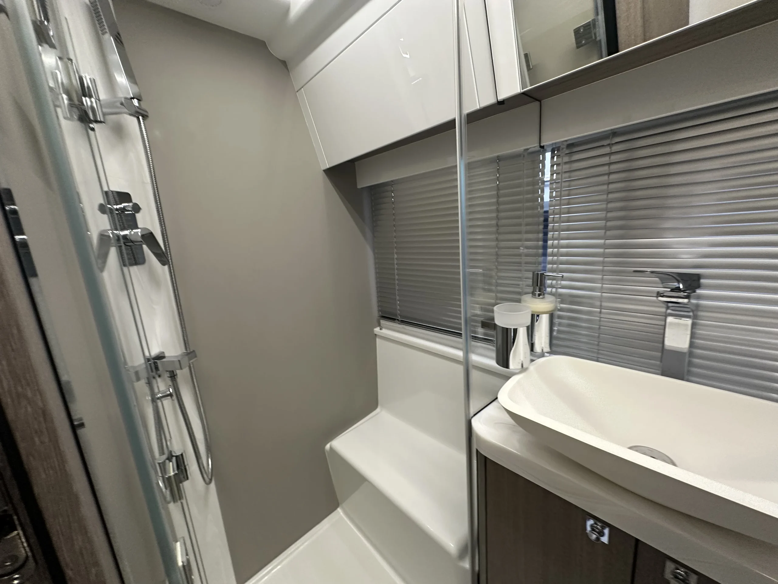• Persianas de madera/aluminio en las cabinas