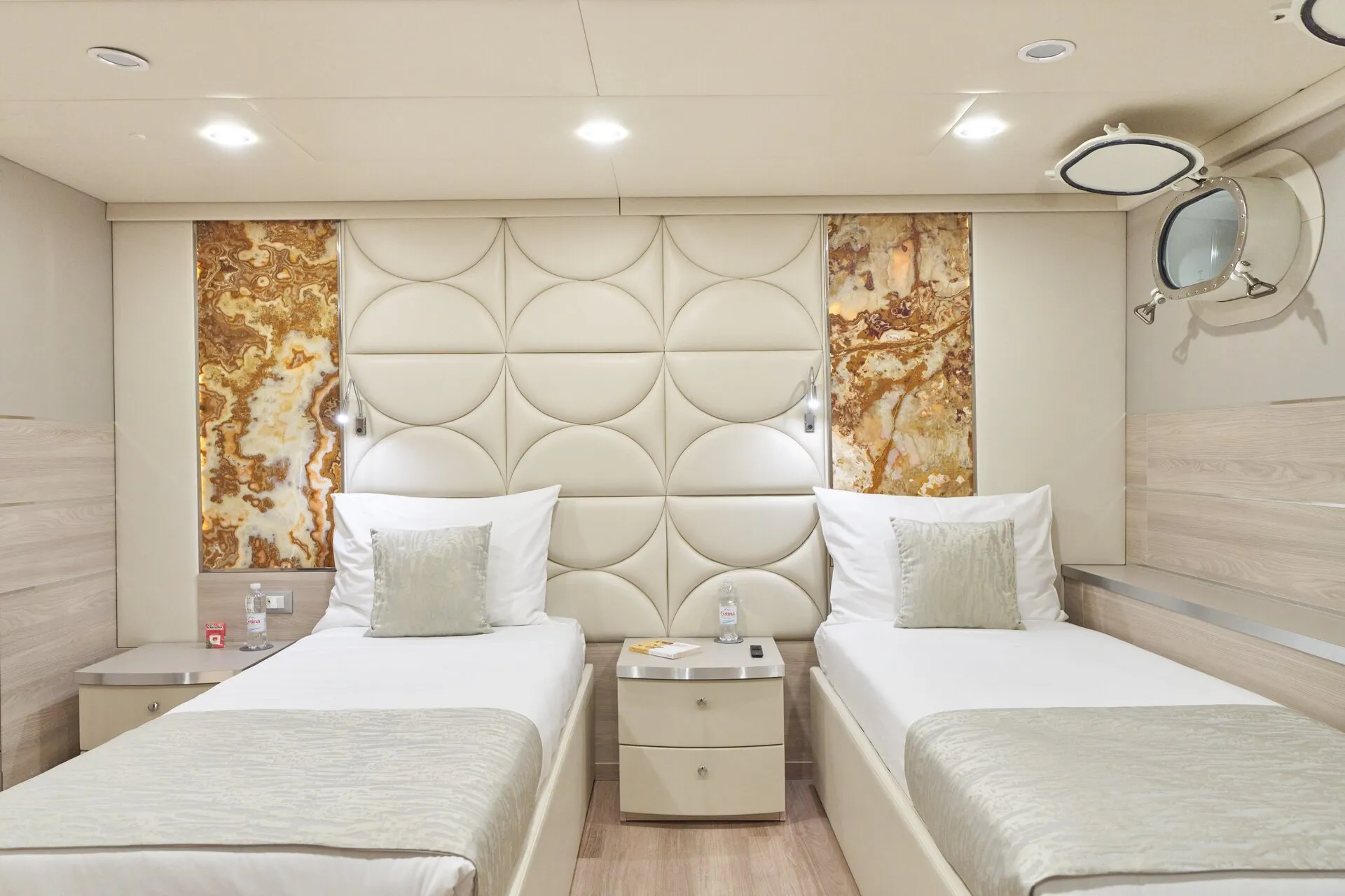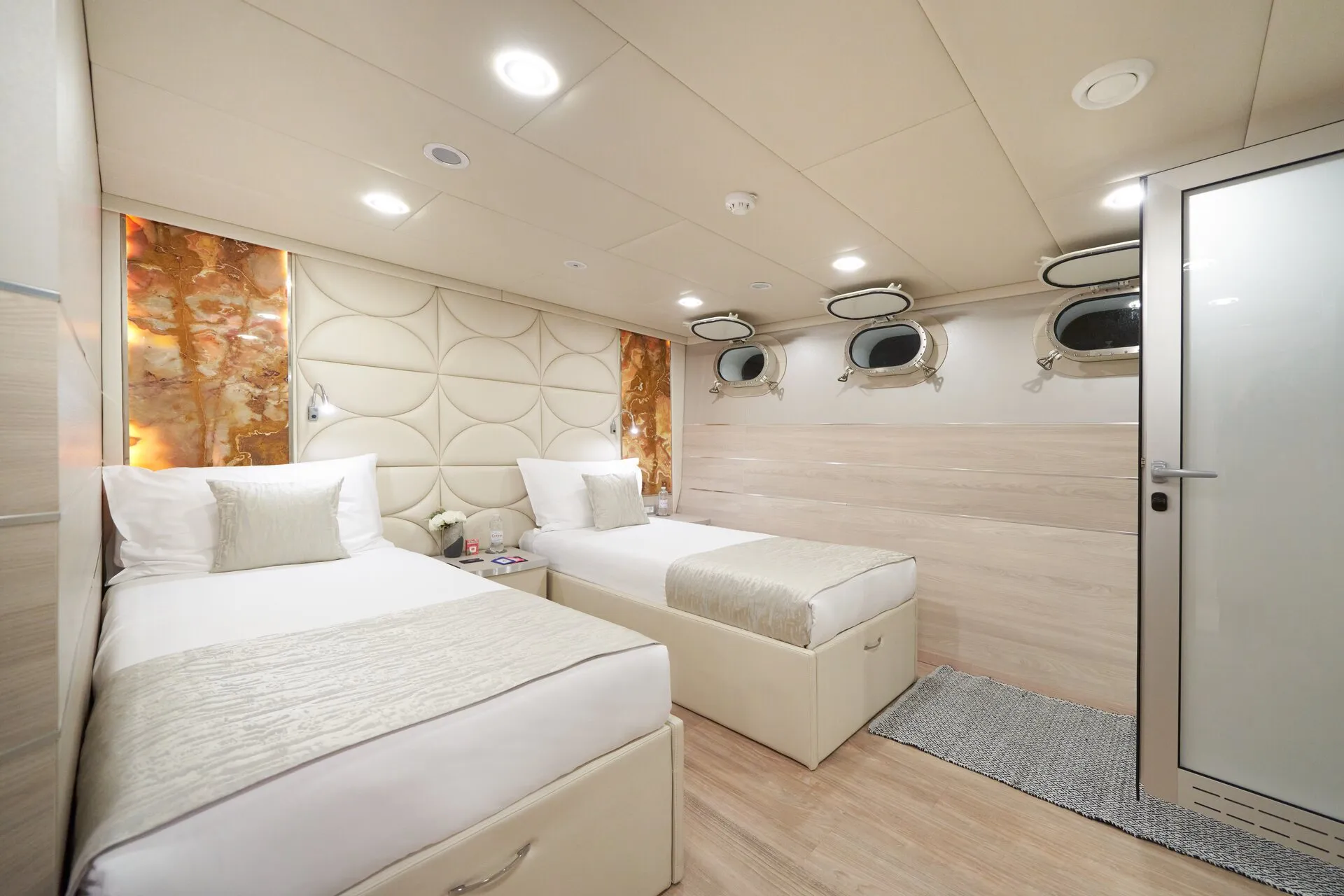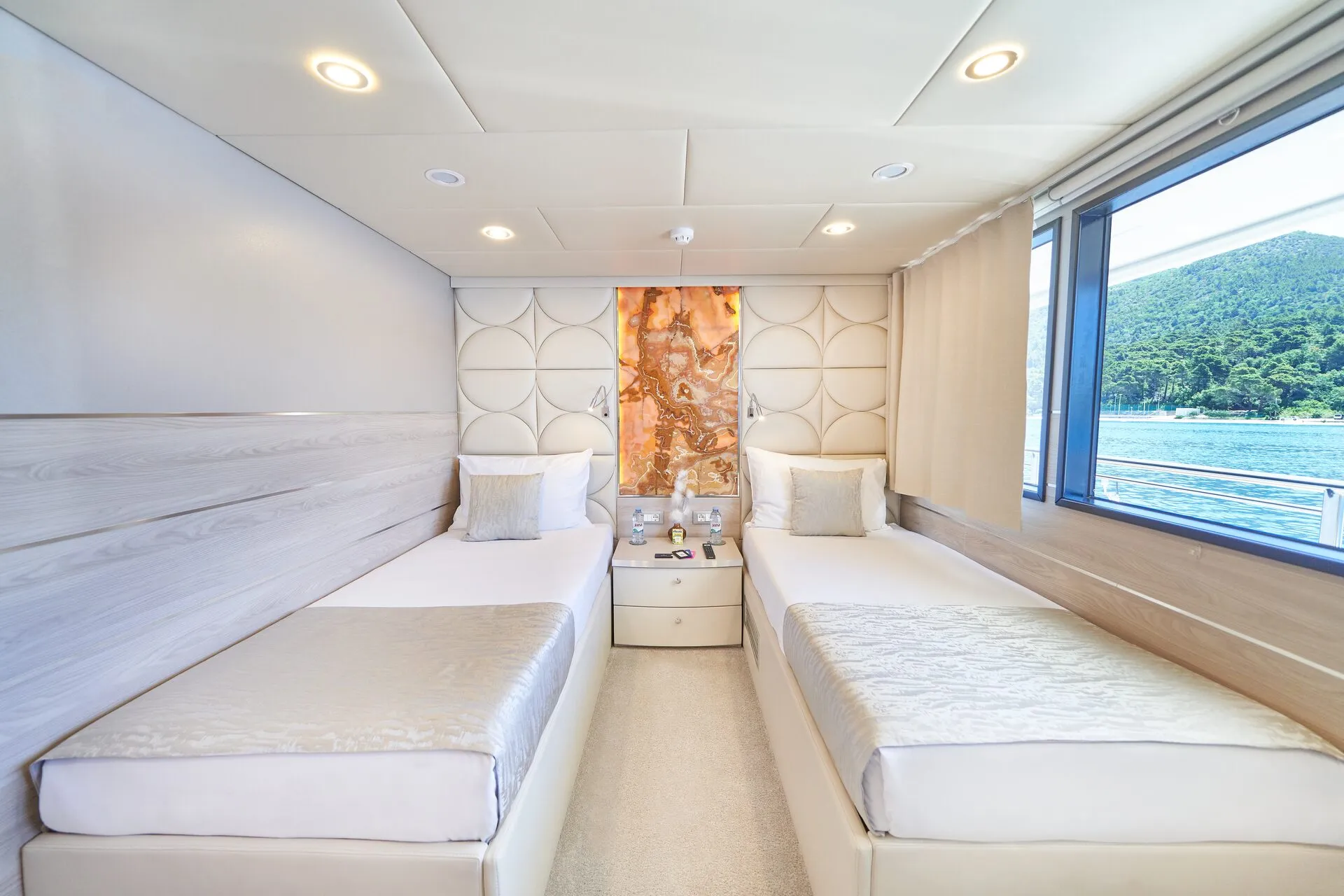L’ampio ed elegante salone principale di Aeterna dispone di due tavoli da pranzo per 24 ospiti con un’area lounge meno formale dove gli ospiti possono socializzare con un drink o due dal bar ben attrezzato. Il layout di Aeterna offre 10 sontuose cabine per un massimo di 20 ospiti, ciascuna arredata con cura e attenzione ai dettagli. Il designer degli interni è riuscito a creare zone intime in tutta la barca, nonostante gli ampi spazi interni, concentrandosi sul massimo comfort e piacere per gli ospiti. Dispone di 4 cabine Master con bagni privati, 4 cabine doppie con letti king-size e 2 cabine Twin, tutte dotate di smart TV inclusa TV satellitare.