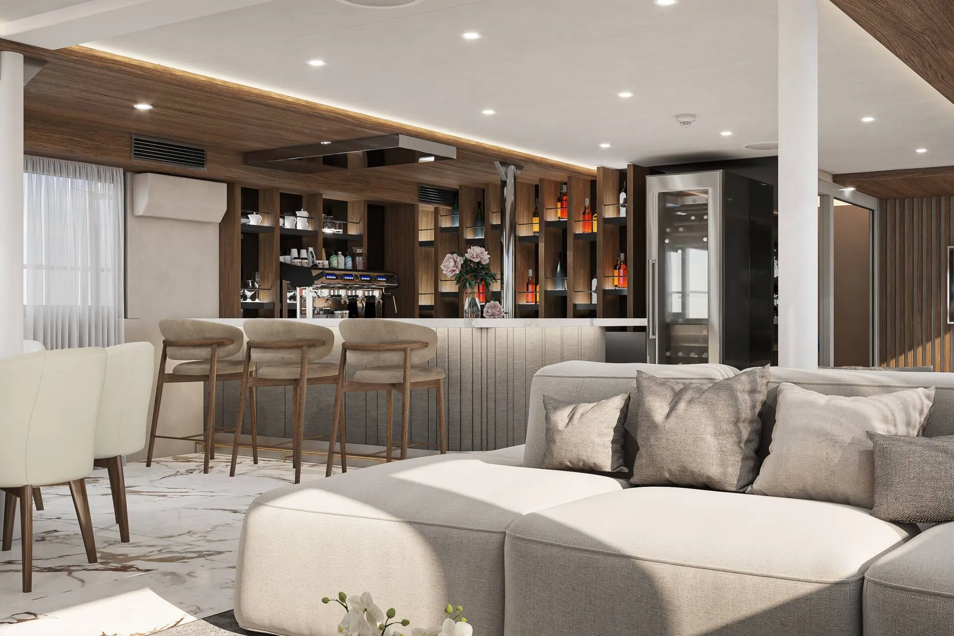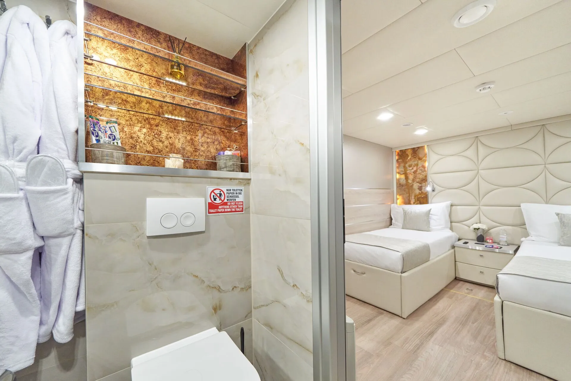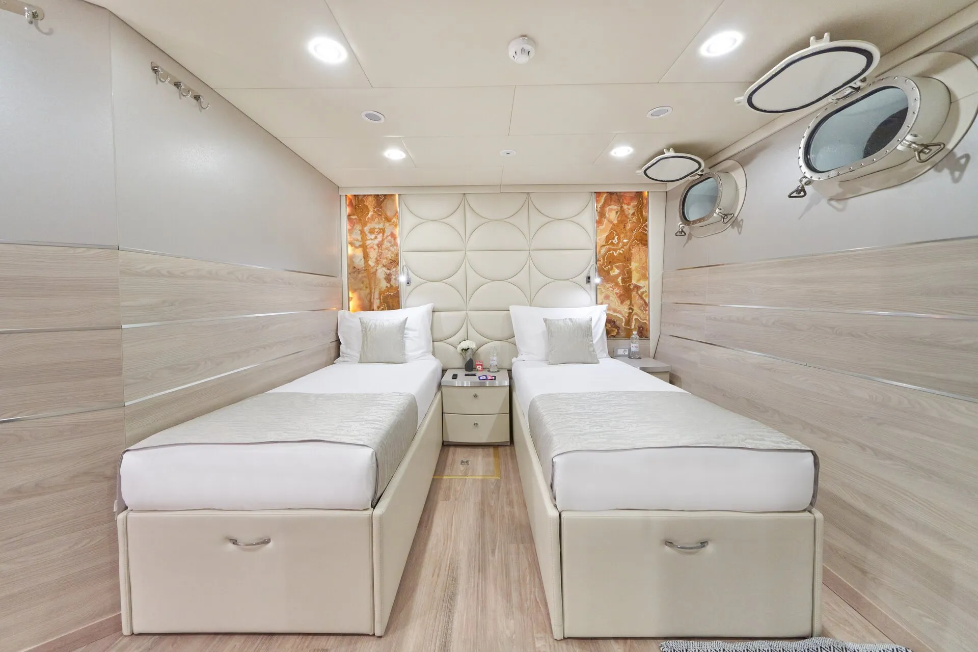 L’ampio ed elegante salone principale di Aeterna dispone di due tavoli da pranzo per 24 ospiti con un’area lounge meno formale dove gli ospiti possono socializzare con un drink o due dal bar ben attrezzato. Il layout di Aeterna offre 10 sontuose cabine per un massimo di 20 ospiti, ciascuna arredata con cura e attenzione ai dettagli. Il designer degli interni è riuscito a creare zone intime in tutta la barca, nonostante gli ampi spazi interni, concentrandosi sul massimo comfort e piacere per gli ospiti. Dispone di 4 cabine Master con bagni privati, 4 cabine doppie con letti king-size e 2 cabine Twin, tutte dotate di smart TV inclusa TV satellitare.