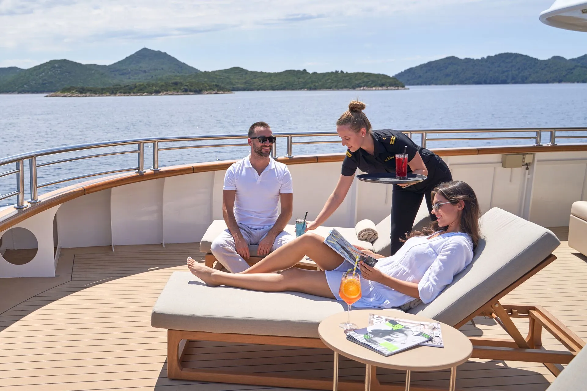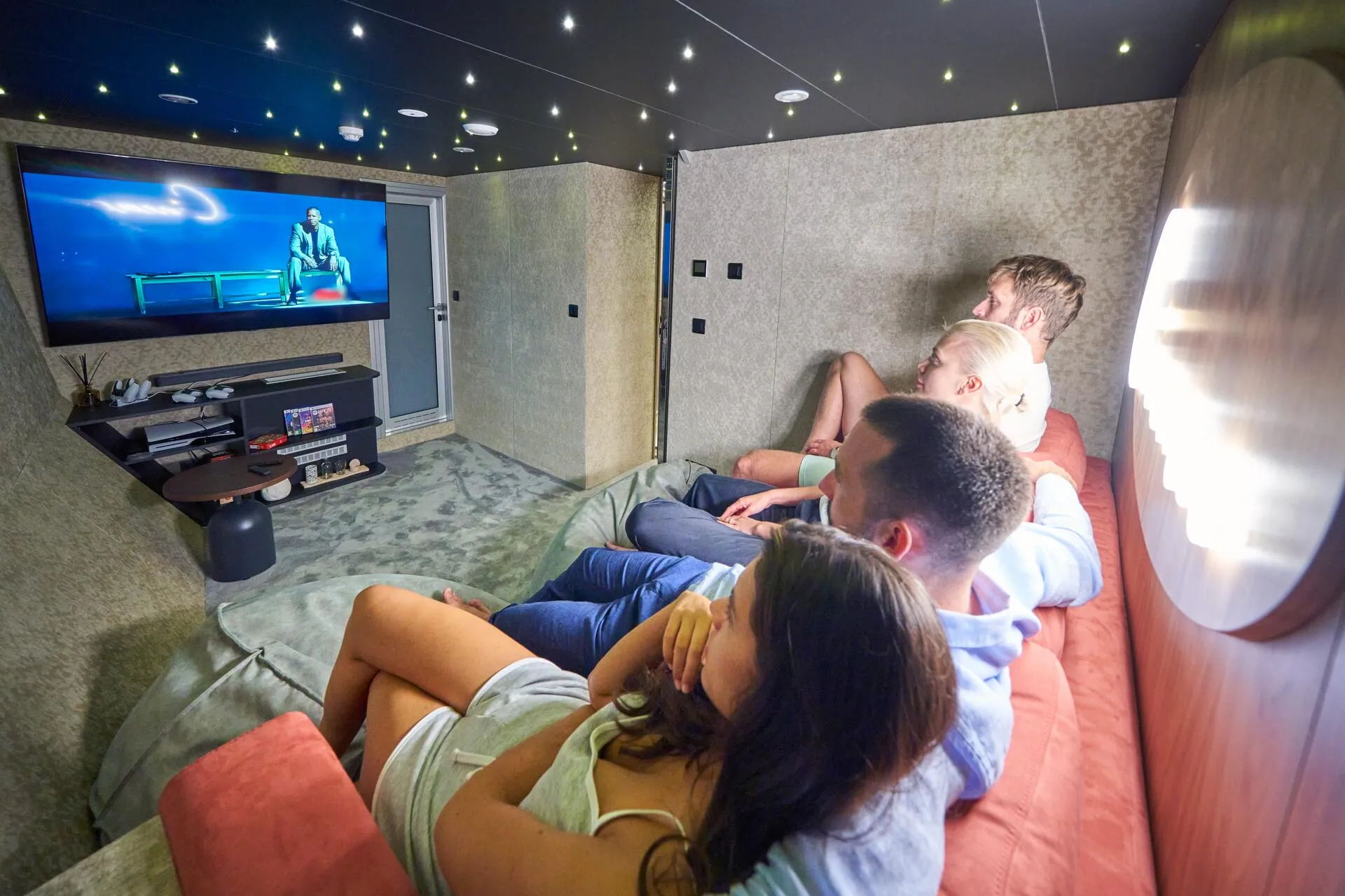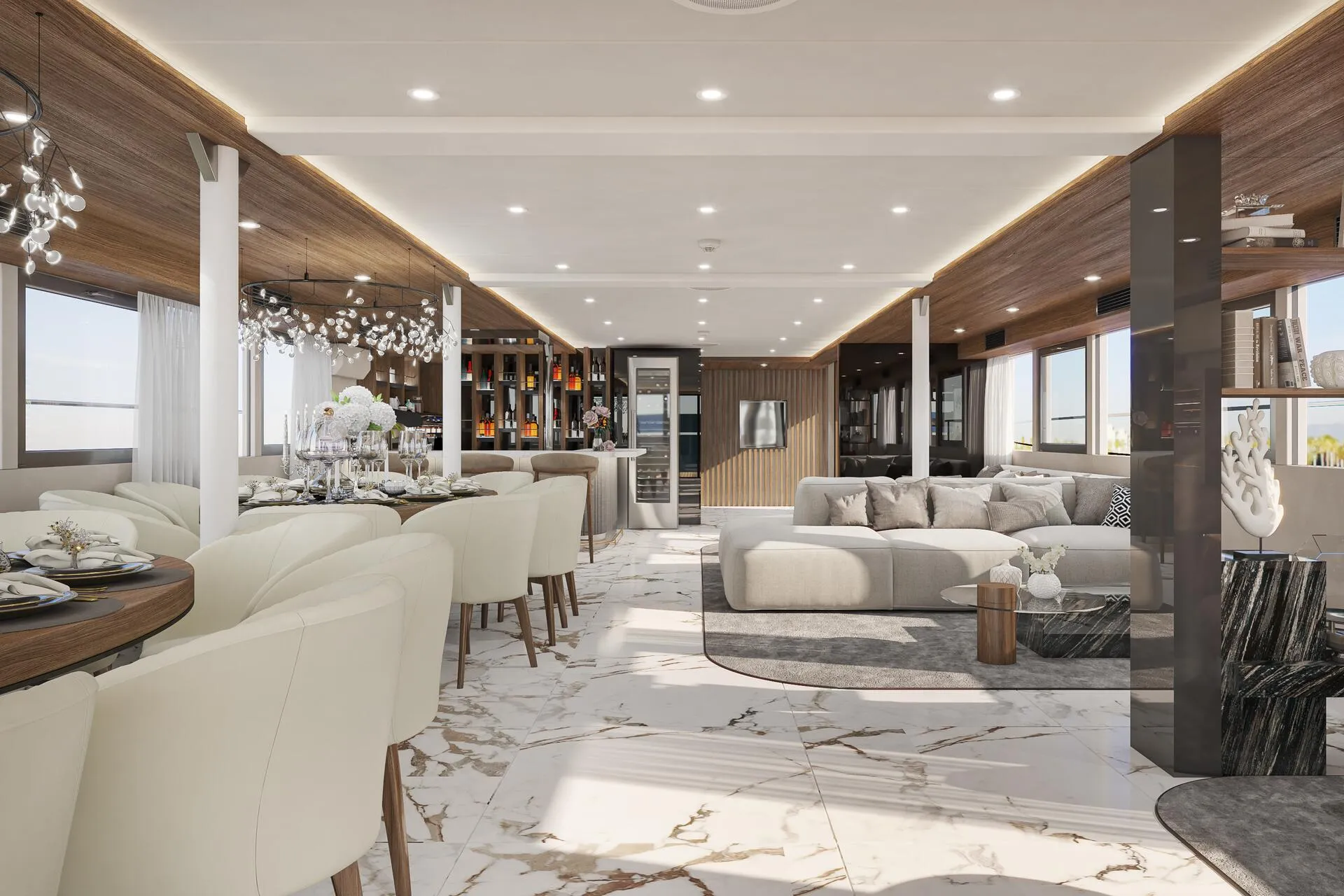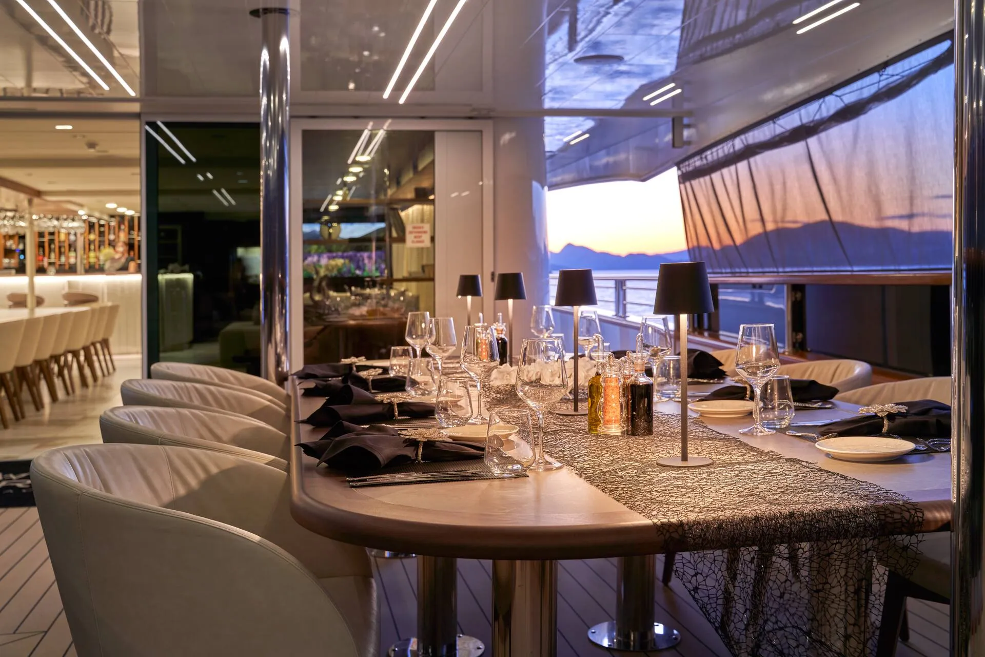 Aeterna ha uno scafo in acciaio e una sovrastruttura in alluminio e offre maggiore spazio a bordo attraverso 4 enormi ponti che si estendono per 53 metri. Per cene all’aperto e per godersi il paesaggio, ci sono due tavoli da pranzo da 24 posti sul ponte superiore. Se gli ospiti desiderano una serata cinema accogliente, c’è un cinema all’aperto sul ponte solarium, insieme a un’area barbecue e un forno per pizza, rendendolo il luogo perfetto per guardare un film in un ambiente più informale. Per gli amanti della tintarella, Aeterna offre Jacuzzi e lettini prendisole, anch’essi sul ponte solarium.