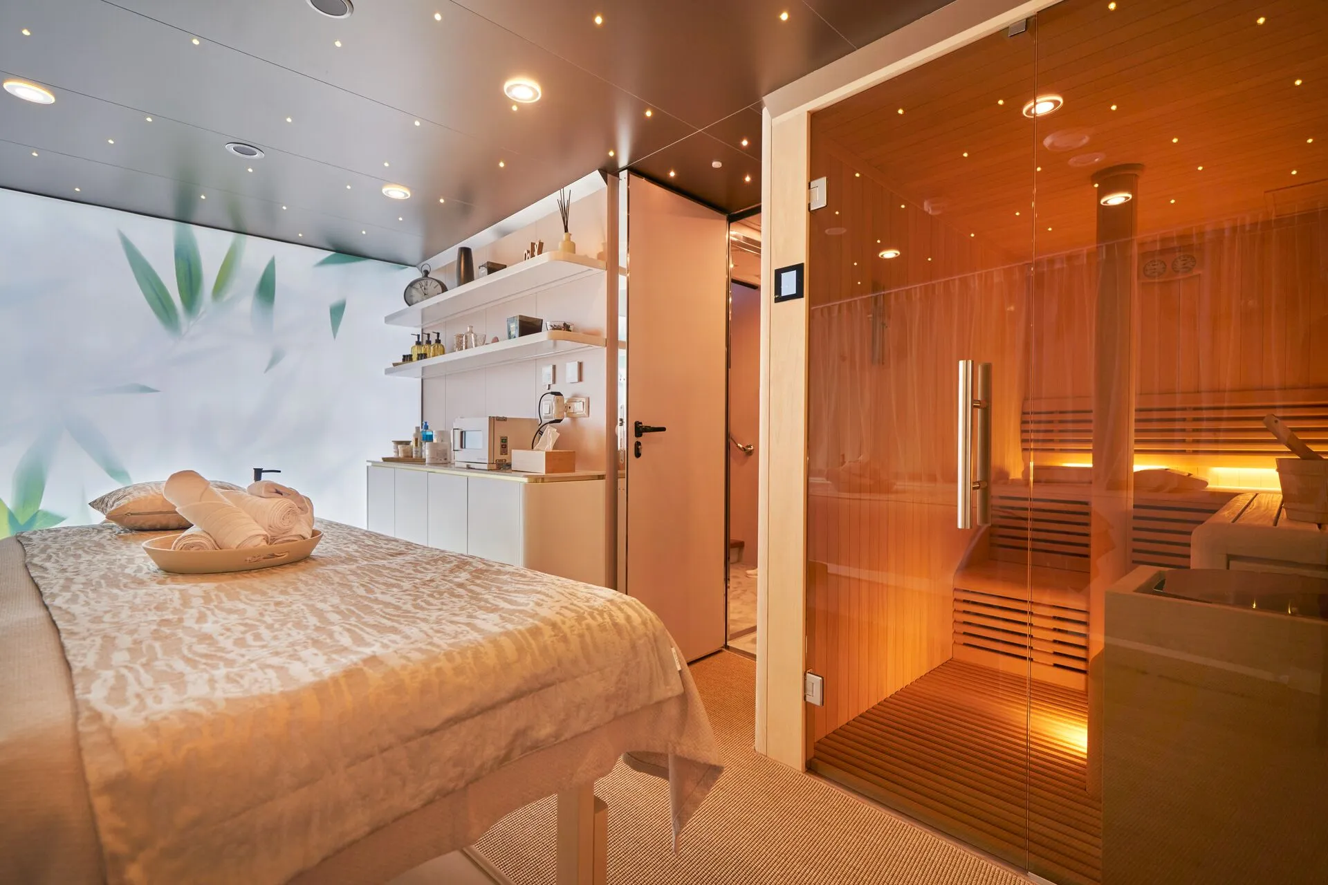 C’è molto di più da godere su questo yacht di lusso oltre a prendere il sole: c’è una spaziosa palestra all’aperto sul flybridge dotata di tapis roulant e cyclette, TRX, barra per trazioni e pesi.