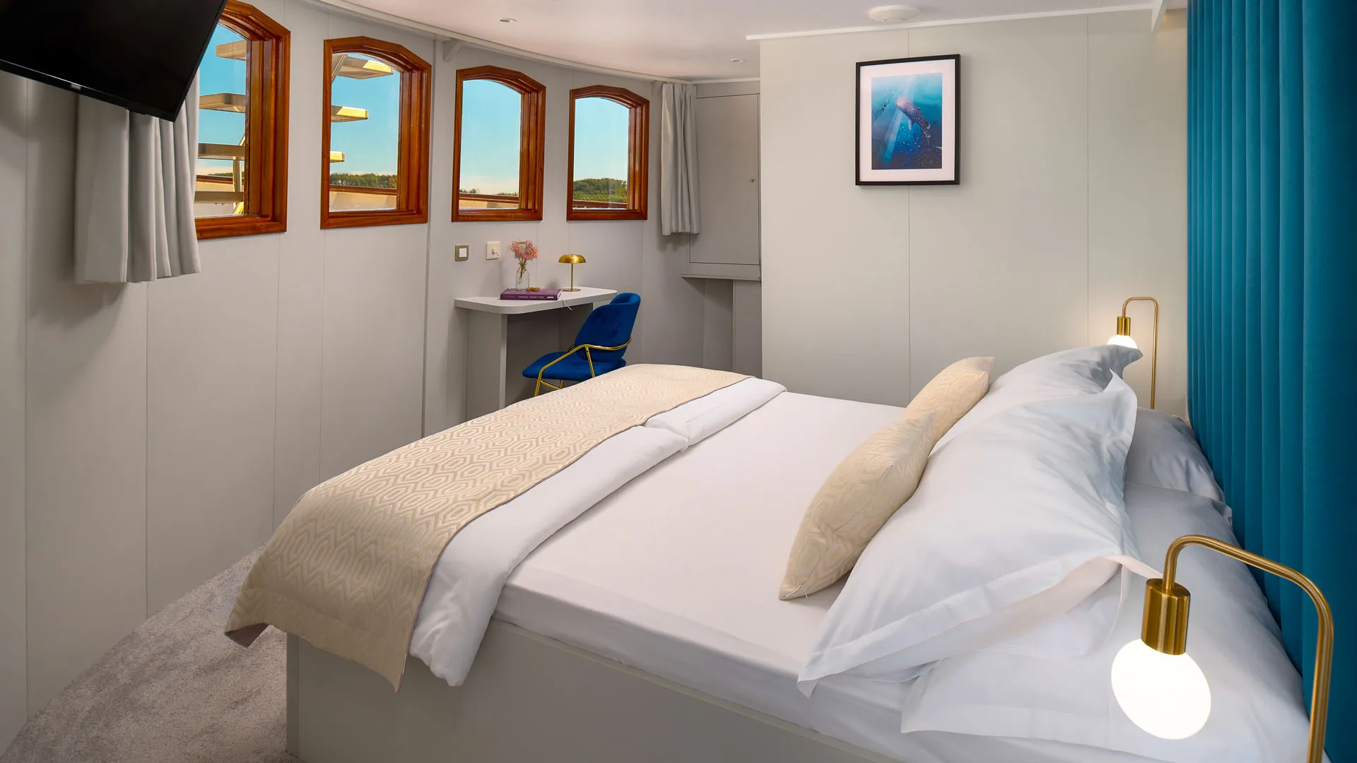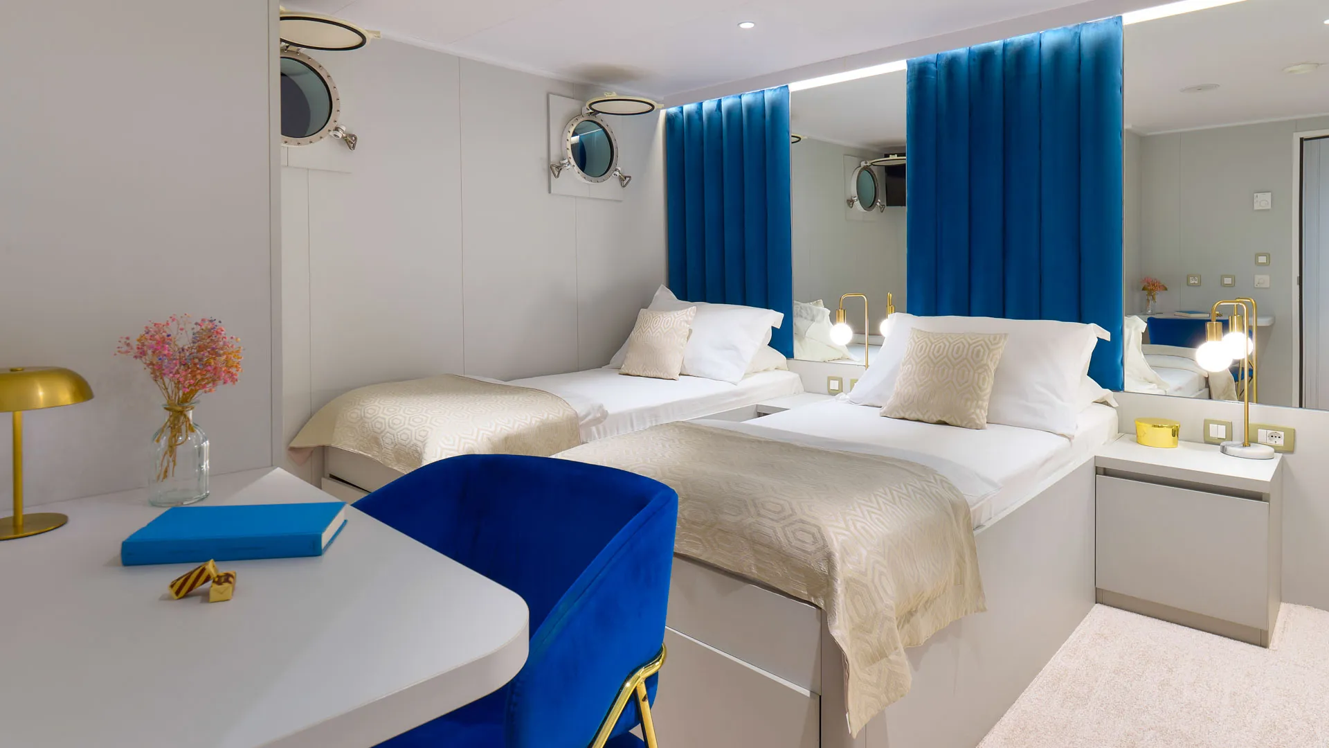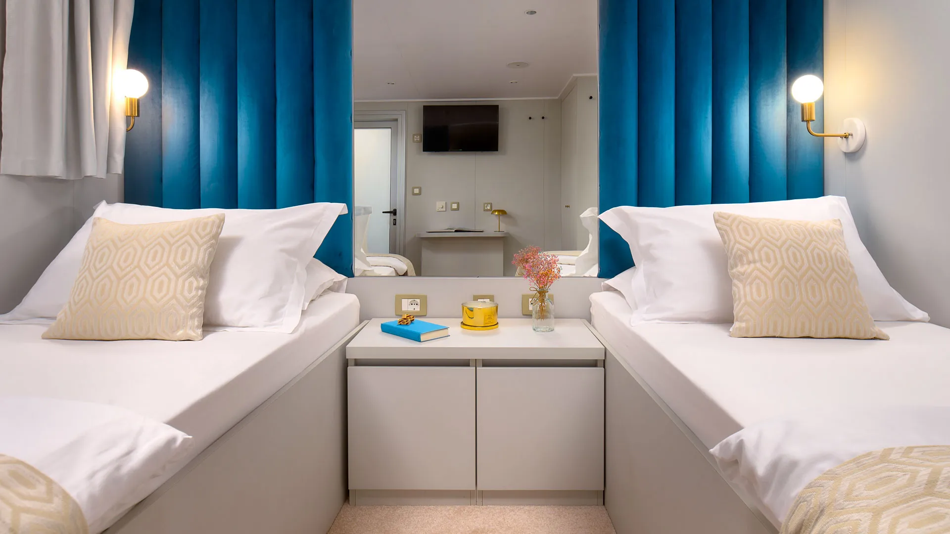 Bellezza offre una selezione di cabine elegantemente progettate che soddisfano le diverse preferenze degli ospiti, garantendo comfort e privacy a bordo. Sul ponte principale, ci sono 11 cabine: tre cabine doppie, ciascuna con letto matrimoniale e bagno privato, e sette cabine convertibili, che possono essere configurate come doppie o matrimoniali, ciascuna con il proprio bagno privato completo di box doccia e toilette in stile domestico.