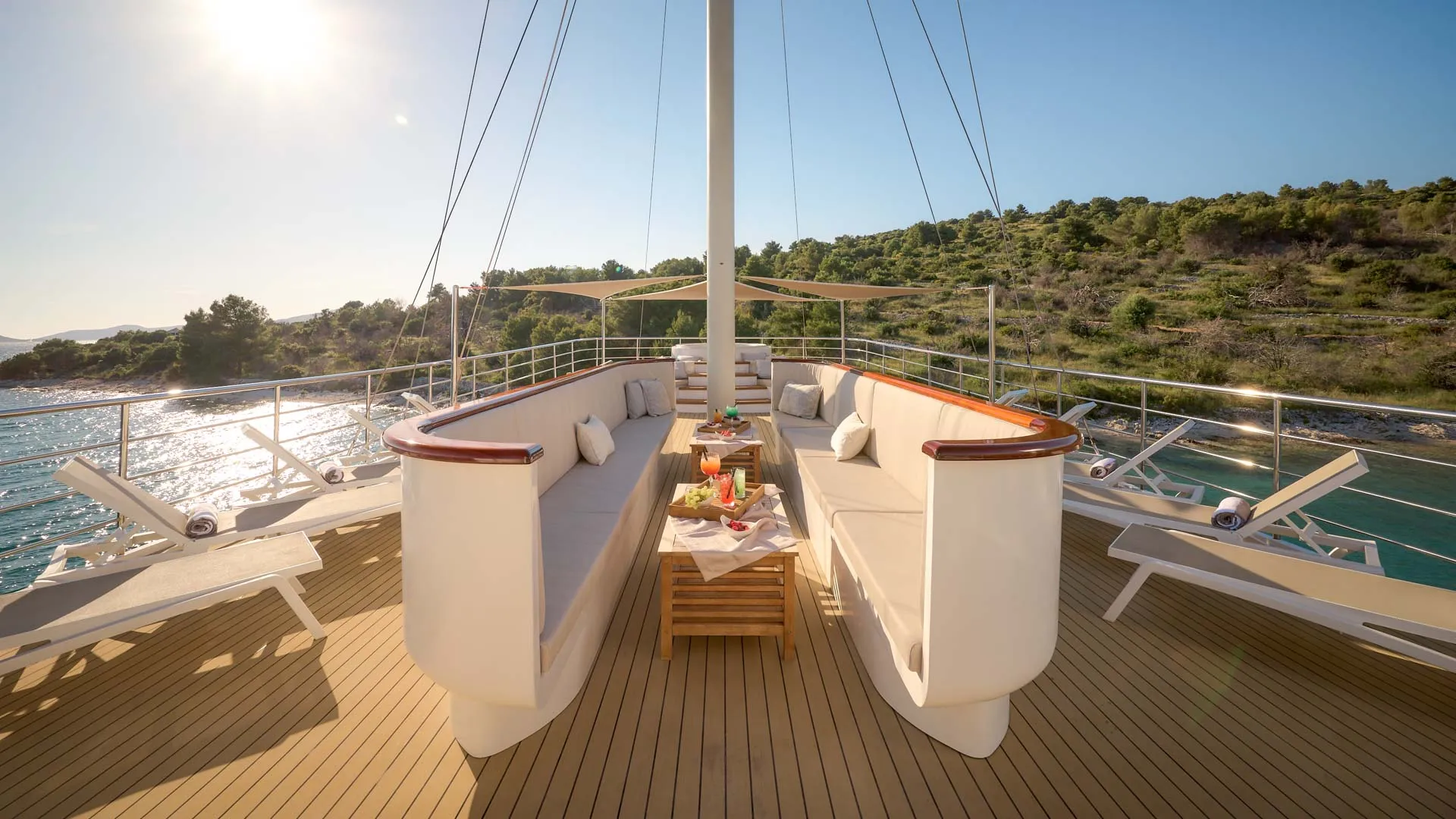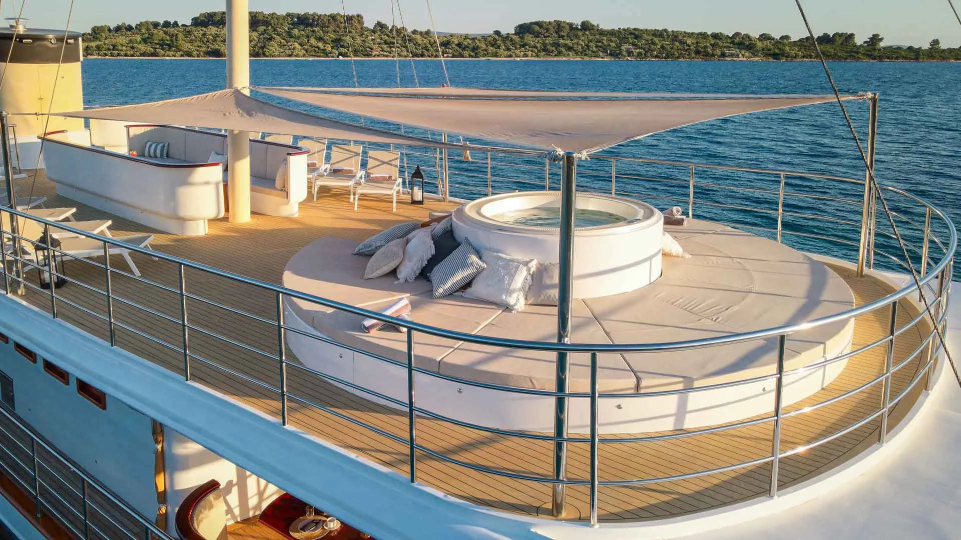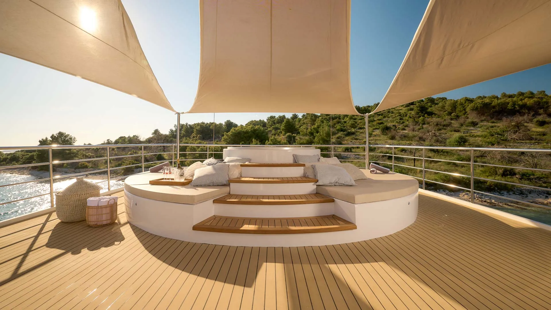 Il lussuoso cruiser Bellezza affascina con la sua estetica senza tempo in legno e il suo fascino classico, offrendo ampi spazi all’aperto per godere della bellezza delle isole dalmate. Il ponte principale offre aree per prendere il sole e rilassarsi, con spazi ombreggiati perfetti per una pausa rinfrescante con un cocktail in mano. Per la stagione 2024, il ponte superiore presenterà una nuova area lounge e una jacuzzi, aggiungendo fascino allo yacht e invitando gli ospiti a immergersi nell’atmosfera adriatica con stile.