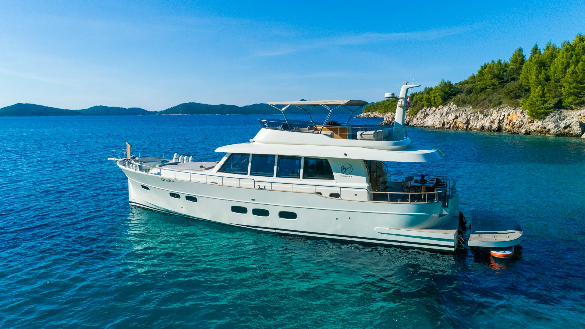 Le caratteristiche distintive del Sasga Menorquín 68 Flybridge esaltano ogni viaggio. L’ampio flybridge include un’area lounge confortevole, perfetta per rilassarsi godendo di viste panoramiche. A prua, i lettini prendisole offrono il luogo ideale per godersi il sole. Con un pescaggio ridotto di soli 1,60 metri, accede facilmente a baie appartate e calette nascoste. Aggiungendo un tocco di avventura, a bordo è disponibile una selezione di giochi d’acqua, promettendo avventure divertenti sull’acqua. Ormeggiata a Dubrovnik, il suo porto di origine, Cloud 9 è pronta a offrire un’esperienza di noleggio lussuosa e indimenticabile in Croazia.
