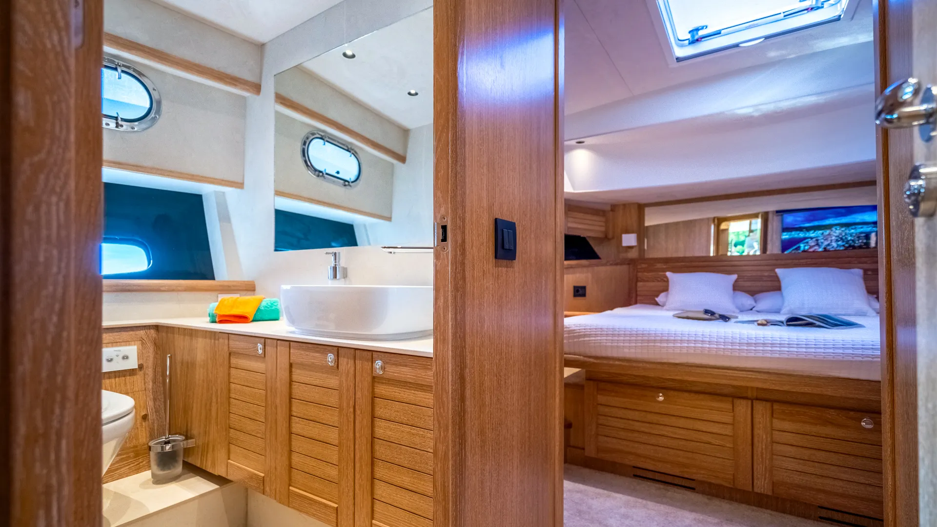 Progettato pensando al comfort, il Menorquín 68 FB ospita fino a sei ospiti in un layout studiato. La suite armatoriale a tutto baglio, situata a metà nave, vanta un bagno privato, una scrivania da toeletta e un angolo salotto accogliente. La cabina VIP a prua e una cabina doppia a dritta offrono ulteriori spazi invitanti per gli ospiti. Quartieri separati per 2 membri dell’equipaggio assicurano un servizio attento durante tutta la crociera. Ogni cabina è inondata di luce naturale e progettata con cura per creare un’atmosfera di calore e relax, rendendo questo yacht ideale per famiglie o amici in cerca di un rifugio tranquillo.