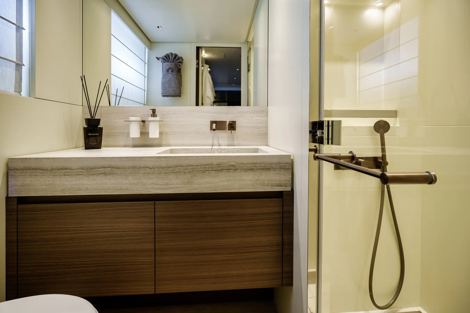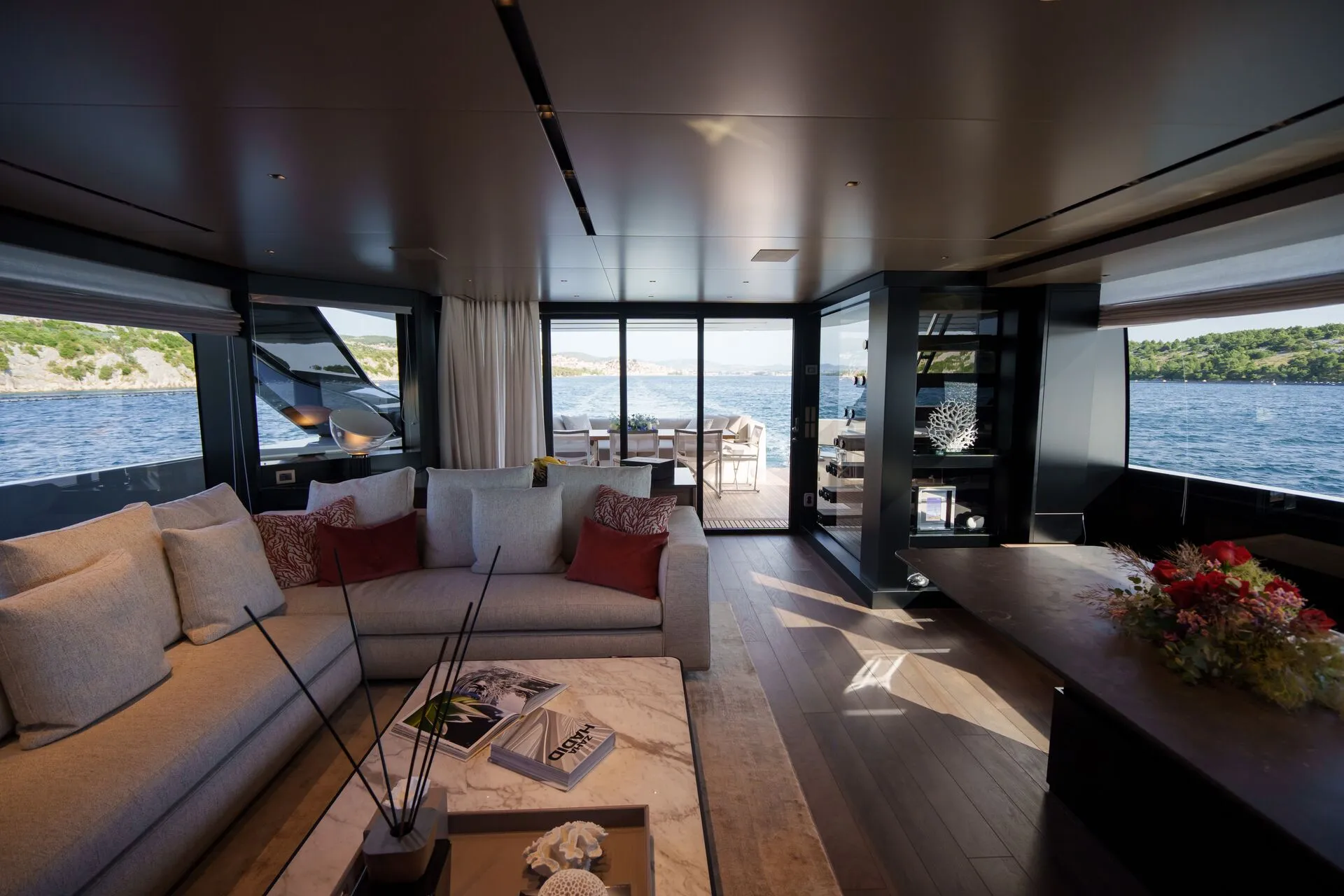 Gli interni di Laura Sessa Romboli sono inondati di luce naturale grazie alle finestre a tutta altezza e a una sorprendente parete scorrevole sul lato sinistro del salone principale, creando una connessione continua con il mare. Toni morbidi, materiali raffinati e dettagli accuratamente curati elevano l’atmosfera in tutto lo yacht. L’alloggio include una suite armatoriale sul ponte principale, due cabine doppie e due cabine convertibili, oltre a un ulteriore letto pullman, offrendo flessibilità e privacy per un massimo di 11 ospiti.