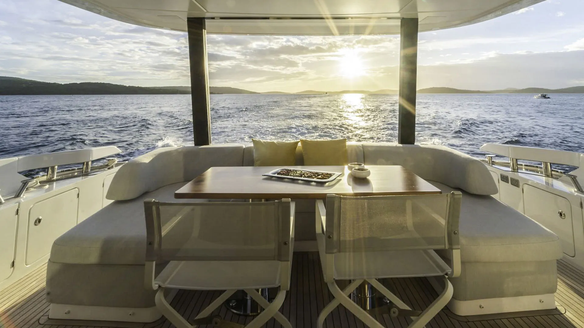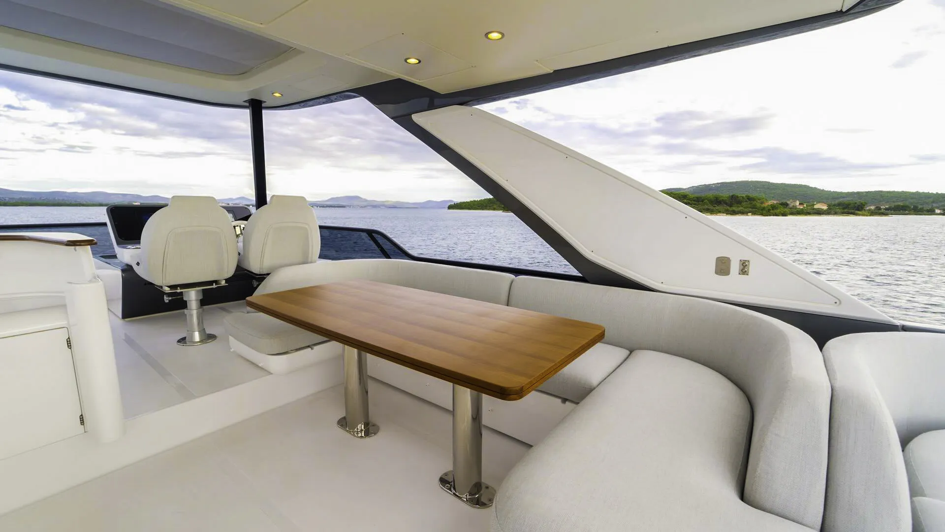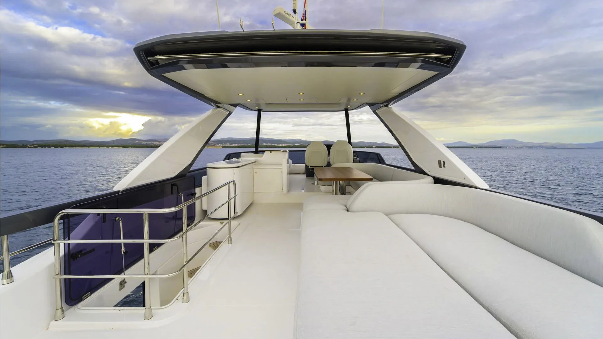 Gli ospiti apprezzeranno anche il pozzetto di poppa, che è completamente coperto dal flybridge con il divano a forma di C, il tavolo regolabile e il bar bagnato elegante. Il flybridge di questo yacht Azimut offre ai suoi ospiti ulteriori spazi per socializzare: doppio sedile del comandante nella parte anteriore, di fronte – un ampio prendisole e un grande tavolo da pranzo e un divano nella parte centrale.