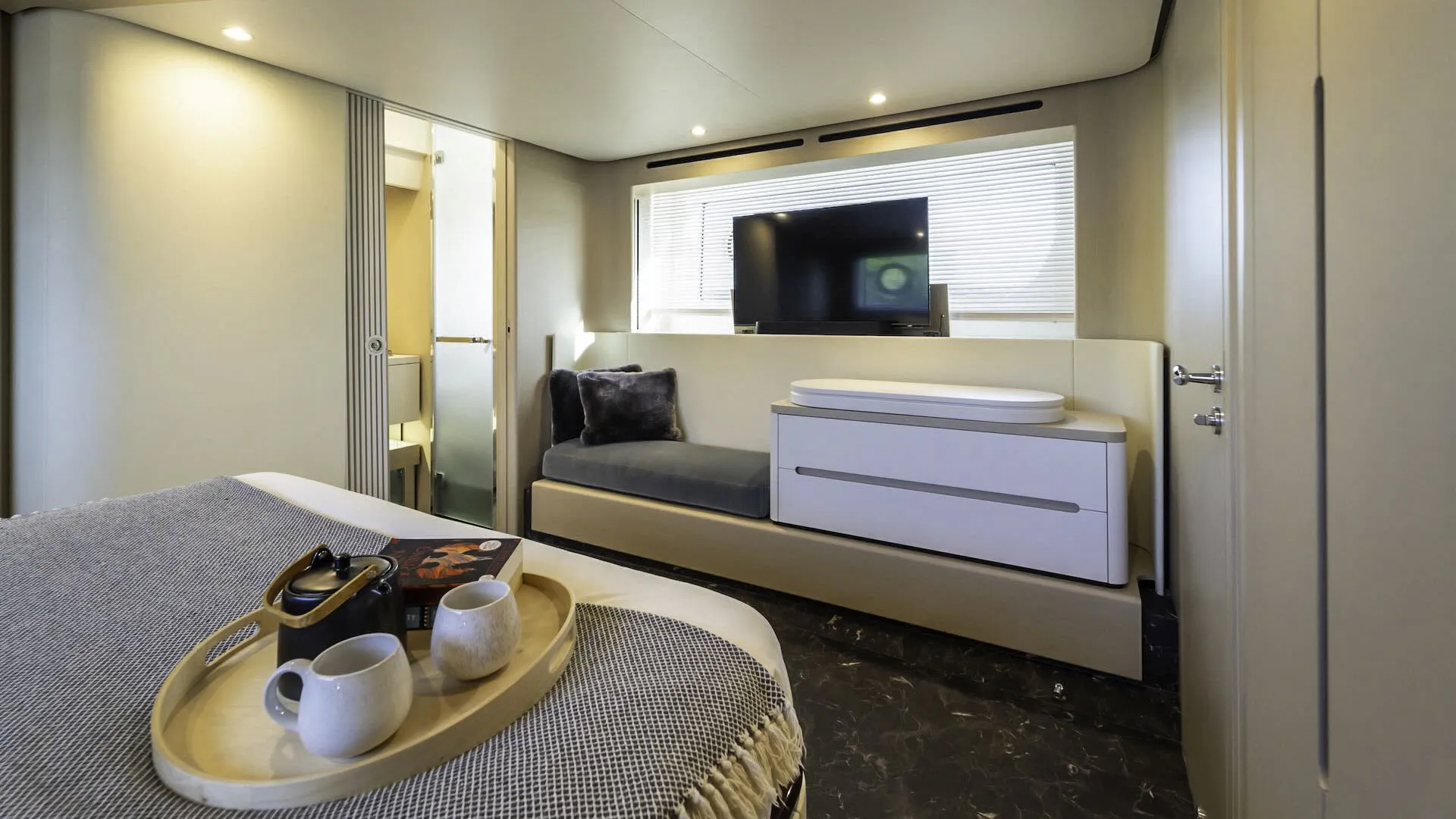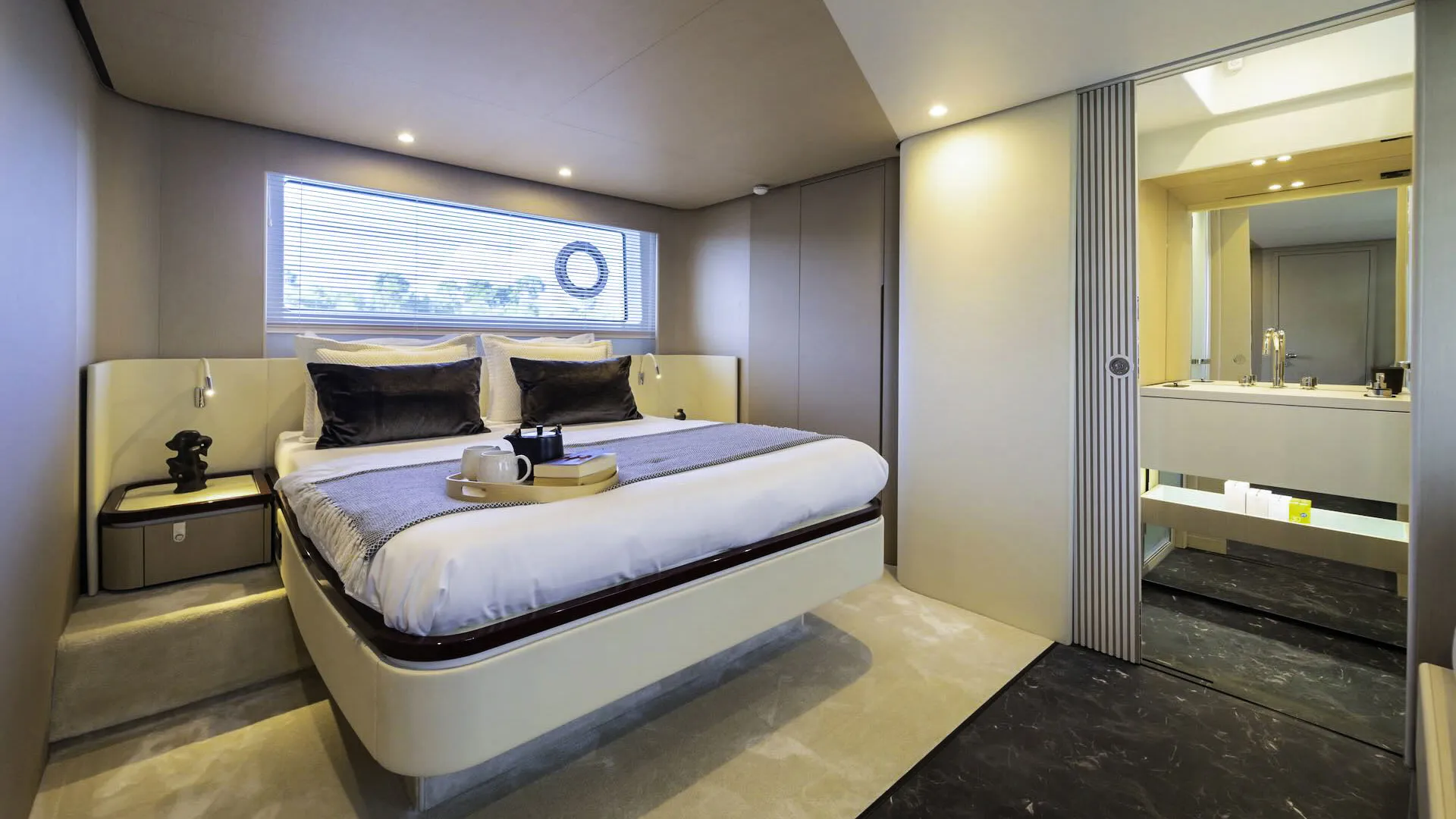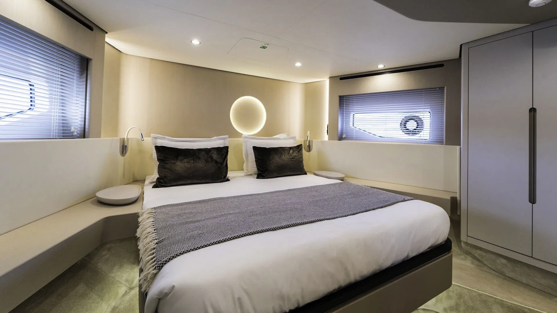 Sotto il ponte dell’Azimut 68 Fly ci sono quattro cabine e tre bagni. I suoi ospiti apprezzeranno la suite armatoriale a tutta larghezza, progettata con praticità ed eleganza, con un letto king size accessibile da tutti i lati. Il bagno in stile aperto ha un’atmosfera da spa e benessere, con il pavimento in pietra utilizzato lungo il percorso. Inoltre, c’è una cabina VIP con letto queen e una cabina doppia a dritta, con una cabina singola a babordo.