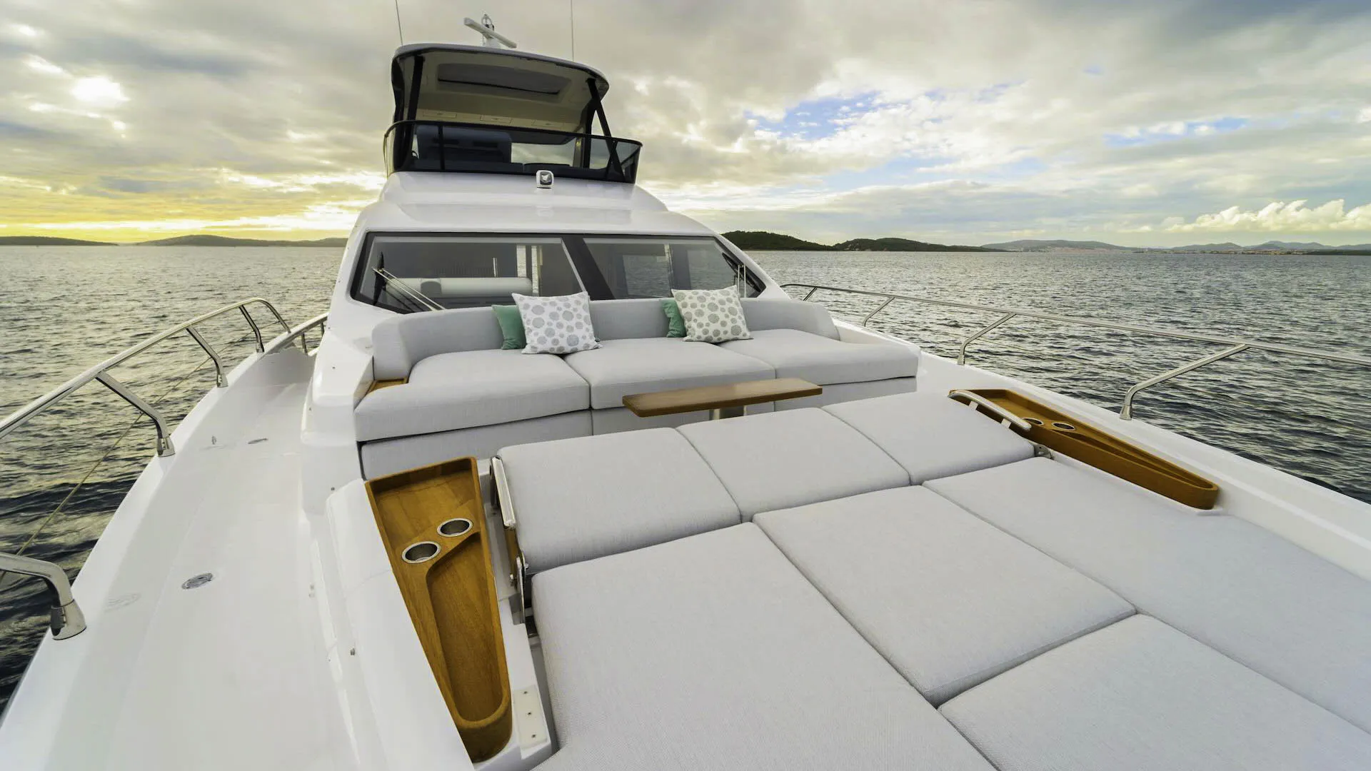 Il marchio Azimut combina con successo grandi volumi con velocità ed economia di carburante grazie all’uso estensivo di fibra di carbonio nella sovrastruttura e nel hard top, riducendo così il peso degli yacht. Inoltre, lo scafo a V dell’Azimut 68, progettato con Pierluigi Ausonio Naval Architecture, offre prestazioni eccellenti alla velocità massima, anche quando è abbastanza ben carico di carburante e acqua. L’Azimut 68 Fly dispone di un comodo ponte di prua con un ampio divano lounge, un tavolo regolabile e un triplo prendisole lungo 2 metri che si piega per diventare un divano e completare un salotto all’aperto completo. C’è anche l’opzione di coprire l’intera area con un bimini, come riparo quando il sole è troppo forte.