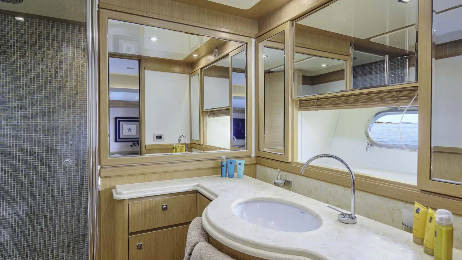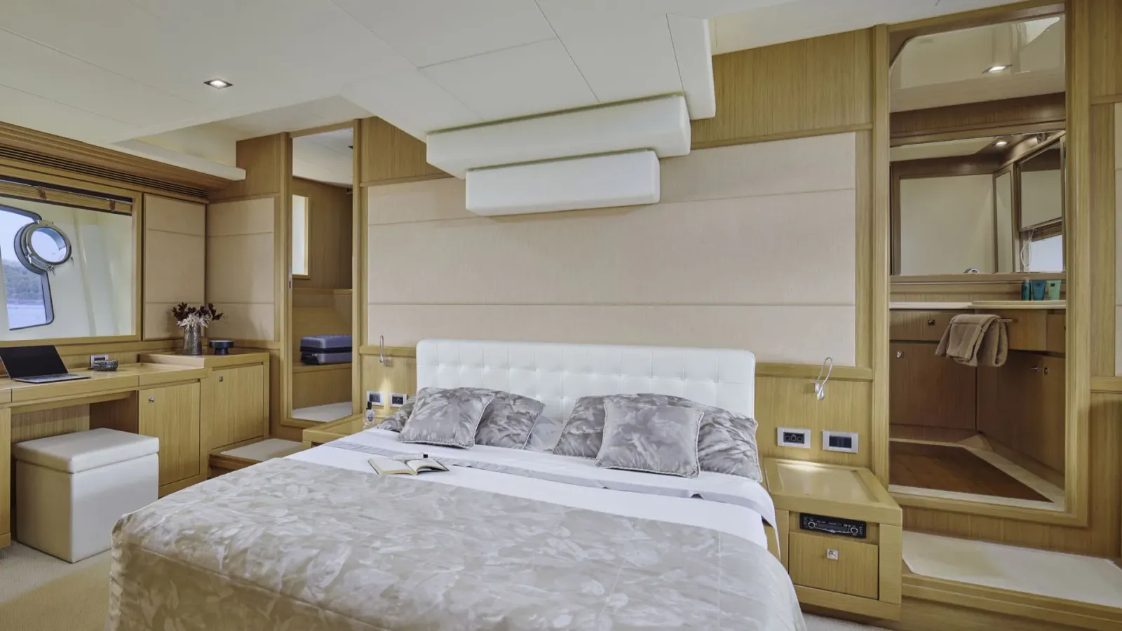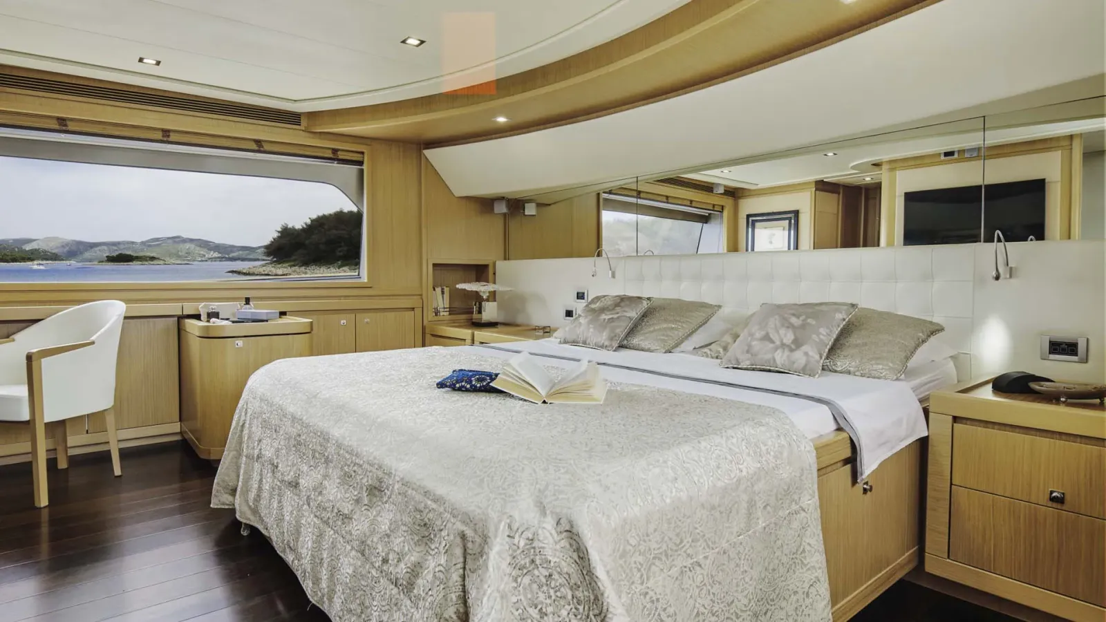 Questo yacht Ferretti vanta una suite armatoriale a tutta larghezza sul ponte principale, una rarità per uno yacht di queste dimensioni. Una scala a chiocciola conduce al ponte inferiore, dove troverai tre cabine con cabine armadio e bagni en-suite. La cabina VIP si estende per tutta la larghezza dello yacht, rendendola ideale per due ospiti principali o una famiglia allargata. Le altre due cabine possono essere configurate come doppie o convertite in una matrimoniale.