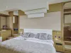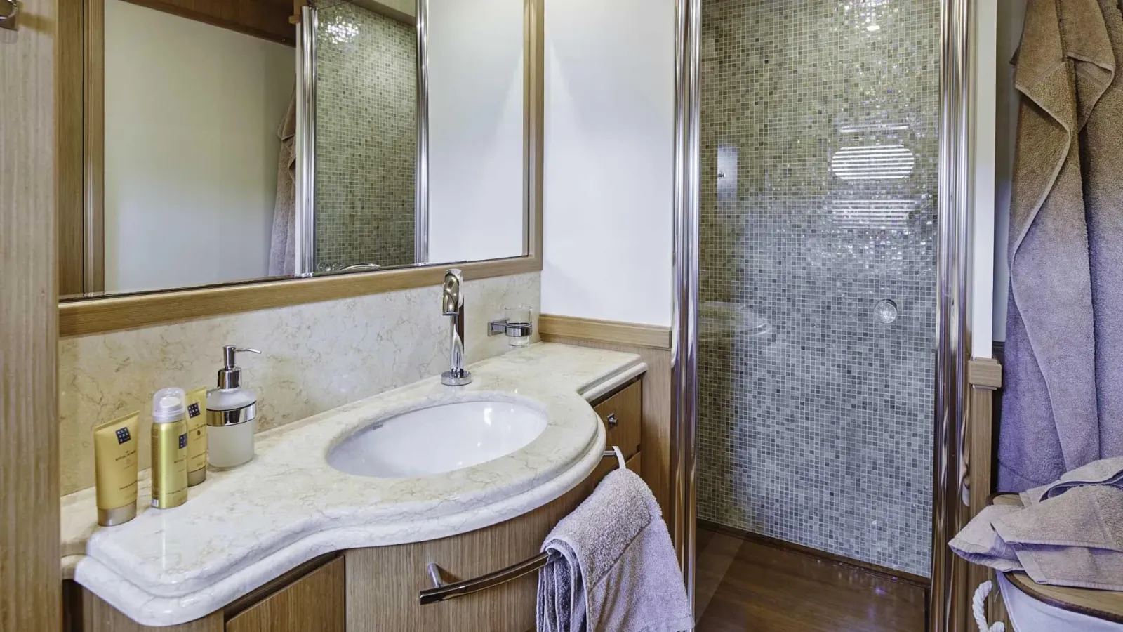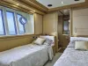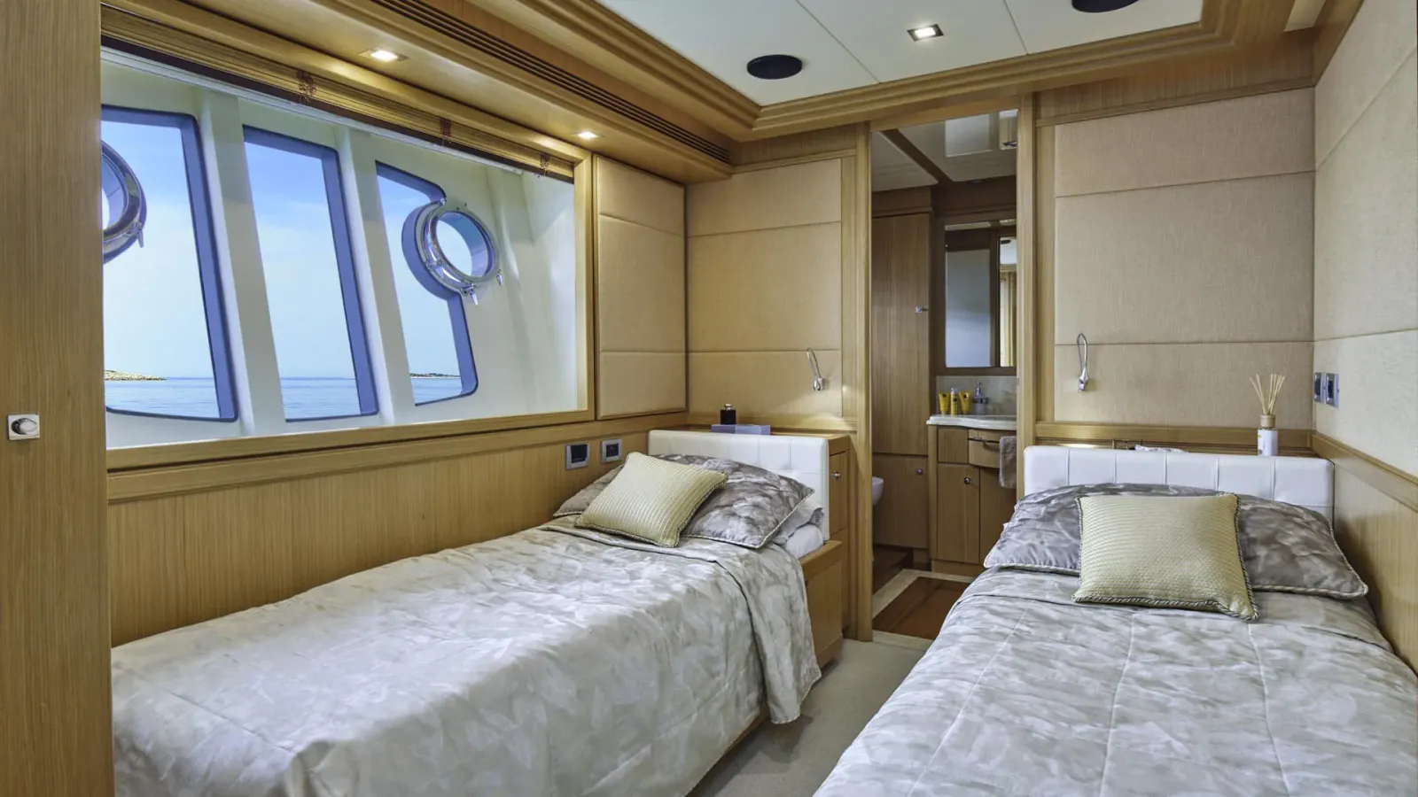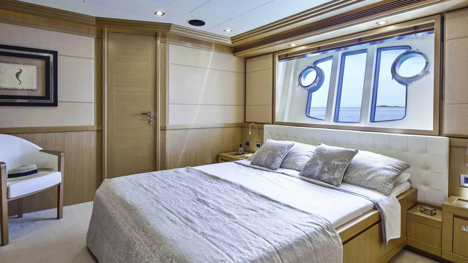 Questo yacht Ferretti vanta una suite armatoriale a tutta larghezza sul ponte principale, una rarità per uno yacht di queste dimensioni. Una scala a chiocciola conduce al ponte inferiore, dove troverai tre cabine con cabine armadio e bagni en-suite. La cabina VIP si estende per tutta la larghezza dello yacht, rendendola ideale per due ospiti principali o una famiglia allargata. Le altre due cabine possono essere configurate come doppie o convertite in una matrimoniale.