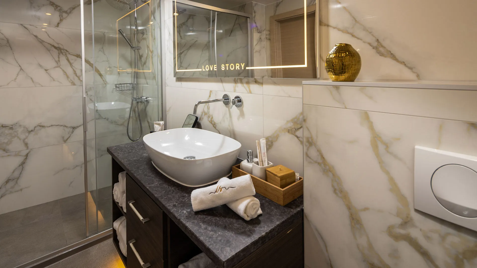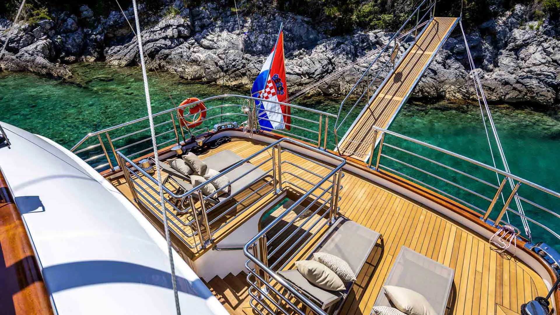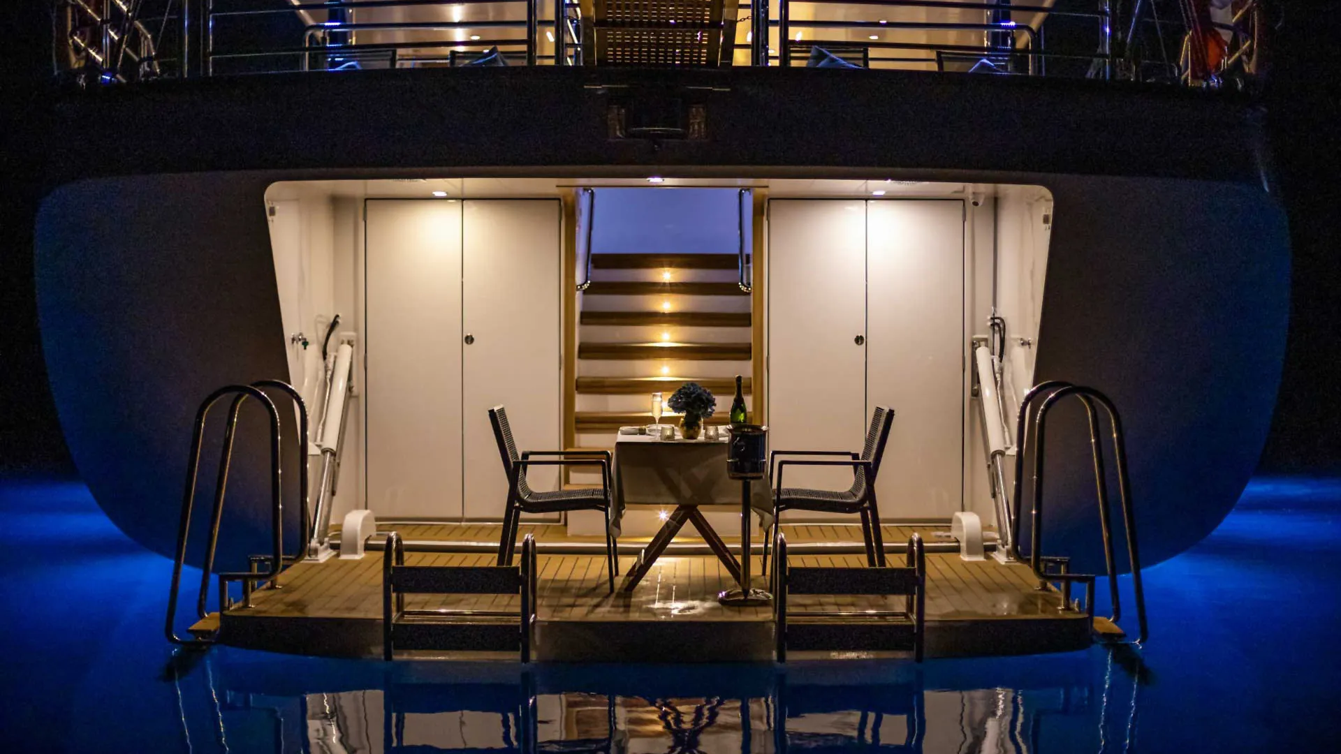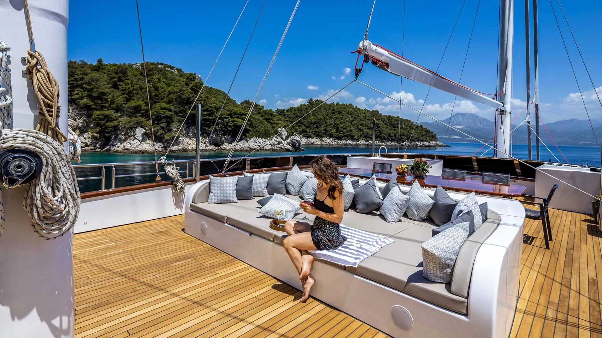 Il ponte solarium di Love Story è un luogo straordinario per il caffè del mattino, momenti romantici al tramonto e adorabili viste sull’Adriatico. Infatti, il ponte solarium dispone di una splendida area pranzo con bar, un’ampia zona per prendere il sole e un irresistibile Jacuzzi. Rilassatevi su numerosi materassini, cuscini e divani. Inoltre, il ponte principale di Love Story ha una parte anteriore invitante con generosi materassini per il relax. Il ponte di poppa ombreggiato con un bellissimo tavolo è perfetto per cene all’aperto. Inoltre, la piattaforma solarium di poppa con lettini è un luogo eccellente per prendere il sole. Durante il giorno, godetevi le attività quotidiane sulla piattaforma da bagno. Fate un tuffo e divertitevi con i più recenti giochi d’acqua per tutte le età e interessi. Tuttavia, quando cala la notte, questa piattaforma si trasforma in una spaziosa sala da pranzo per due. Sicuramente, questo è il miglior posto sul lussuoso yacht a vela Love Story per momenti romantici.
