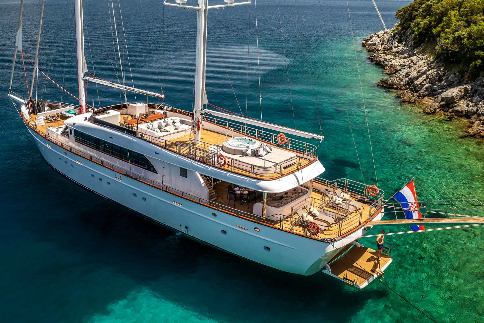 Il lussuoso yacht a vela Love Story può essere definito a tutti gli effetti una straordinaria villa galleggiante a due ponti. Presenta un design esterno elegante e interni moderni. Questo yacht di 43 metri garantirà un’esperienza di crociera memorabile per 12 ospiti. Inoltre, l’equipaggio professionale di 7 membri e l’incantevole scenario dell’Adriatico vi lasceranno senza fiato.