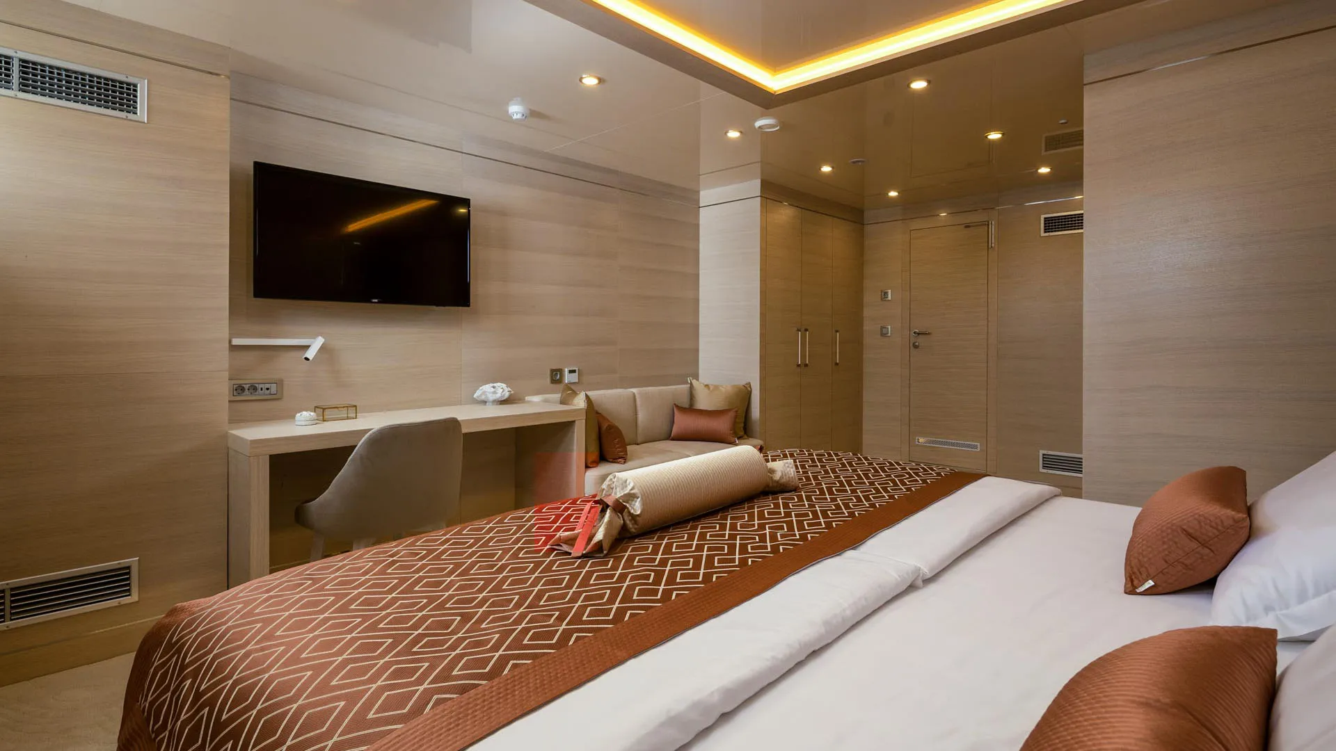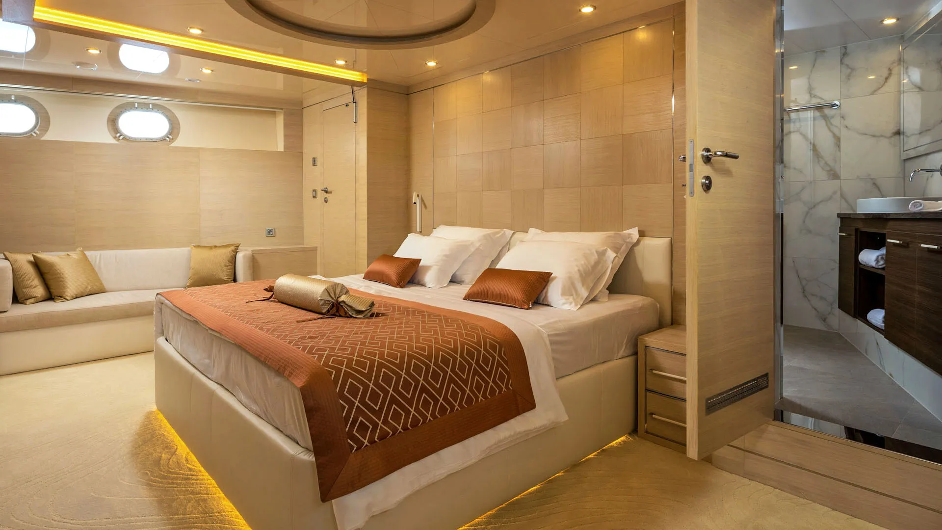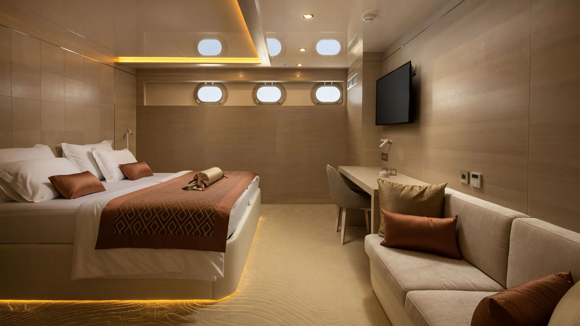 Gli interni del lussuoso yacht a vela Love Story presentano pavimenti in legno e mobili eleganti. Godetevi un’atmosfera accogliente e moderna a bordo. L’impressionante salone principale dispone di un affascinante bar all’ingresso, oltre a un’ampia area per pranzare e rilassarsi. Le sei splendide cabine di questo yacht a vela di lusso sono arredate con mobili moderni nei toni del beige e dell’oro. Ogni cabina è spaziosa e dotata di tutti i comfort per offrire il massimo livello di comodità agli ospiti. Inoltre, un eccezionale equipaggio di 7 persone coccolerà ogni ospite al massimo.