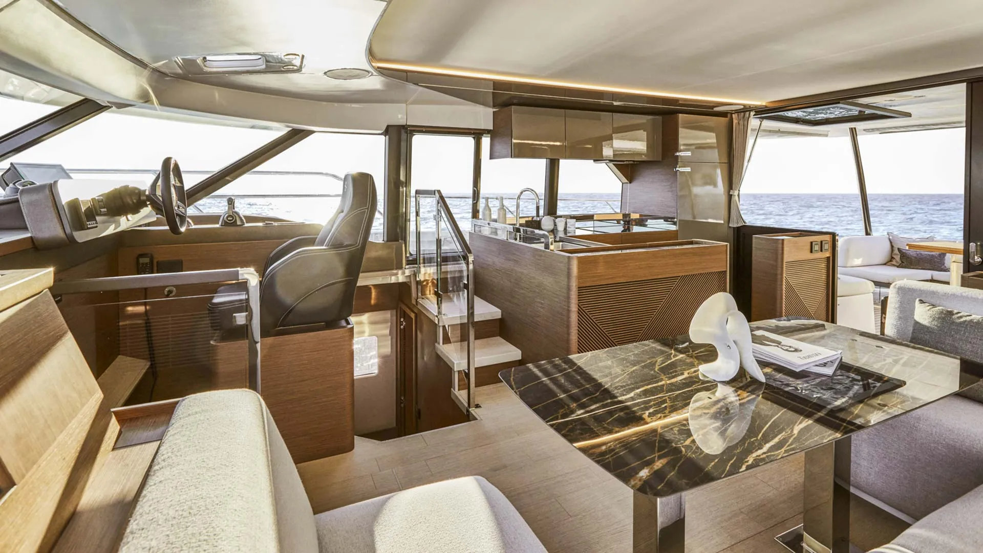 Questo yacht Prestige presenta interni spaziosi e luminosi con grandi finestre, garantendo un’esperienza abitativa confortevole e lussuosa. Progettato da Valentina Militerno de Romedis, l’M48 dà priorità alla connessione con la natura, permettendo agli ospiti di riconnettersi veramente con il mare e con se stessi. Una cucina moderna equipaggiata con piano cottura a induzione Siemens e microonde grill Whirpool si apre su un salotto con un divano a forma di C intorno all’area pranzo.