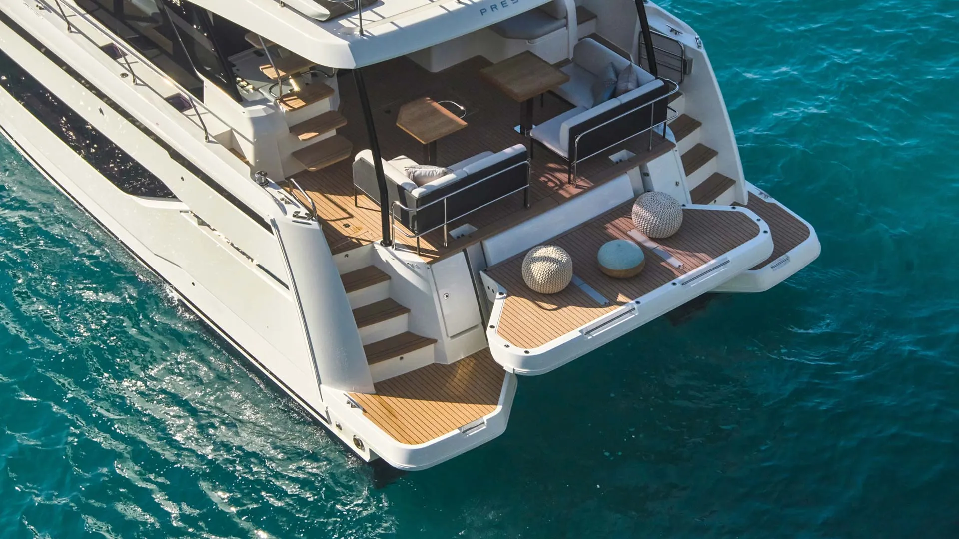 Il flybridge di questo catamarano a motore con 3 cabine dispone di un wet bar con grill, lavello, frigorifero e spazio di stivaggio. Inoltre, la versatile piattaforma dell’M48, capace di trasportare un tender o un jet ski, può essere abbassata e utilizzata come base per i bagnanti. Infatti, il suo ruolo principale è quando è completamente sollevata, permettendo agli ospiti di usarla come ponte di poppa o come area pranzo.