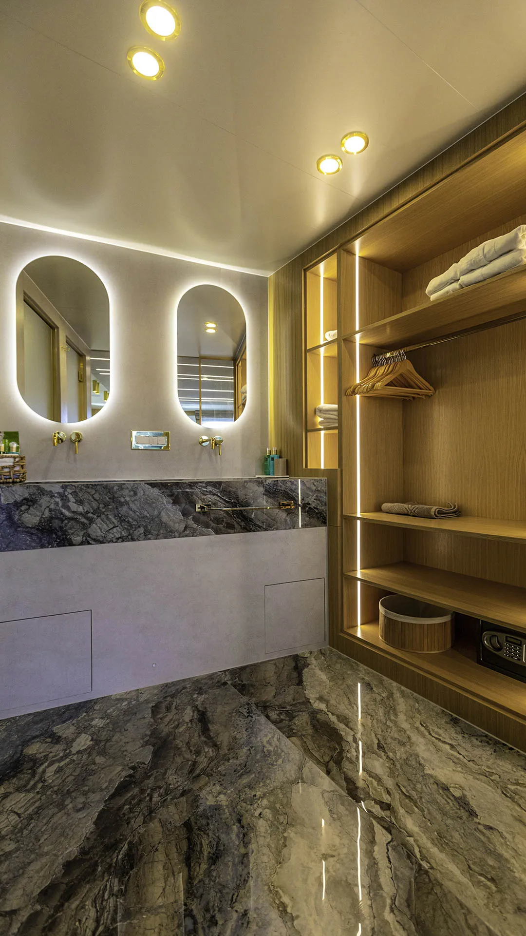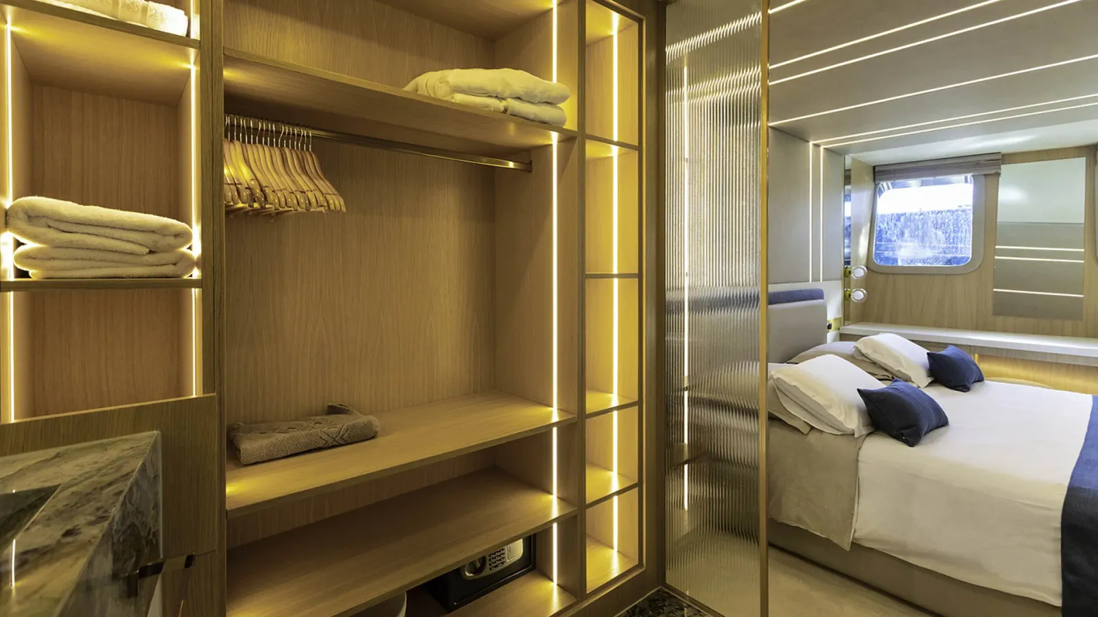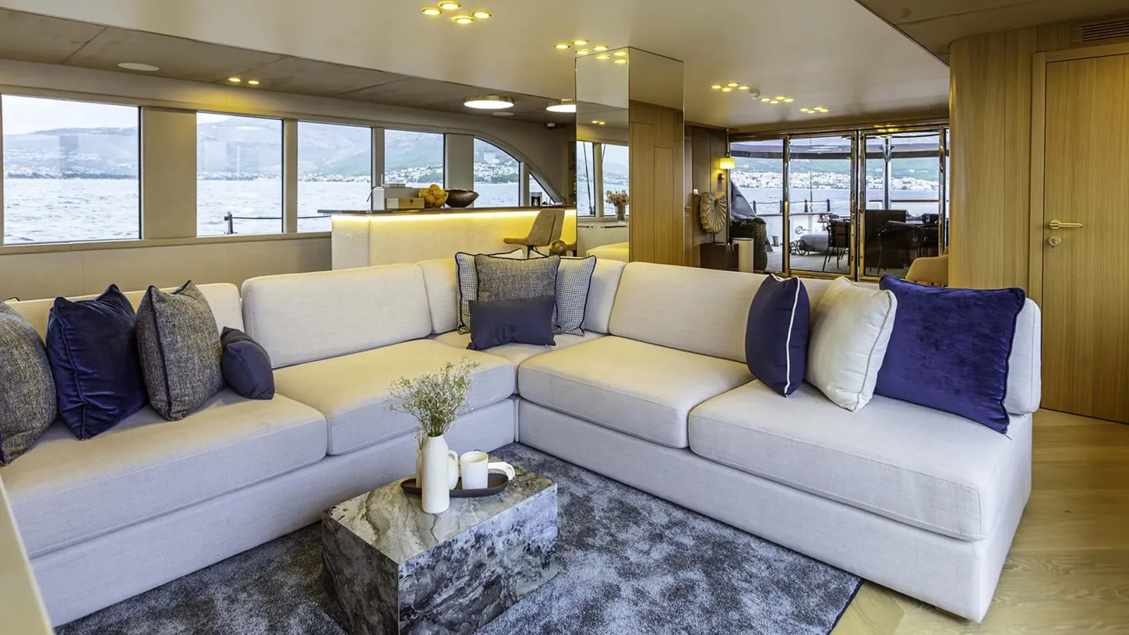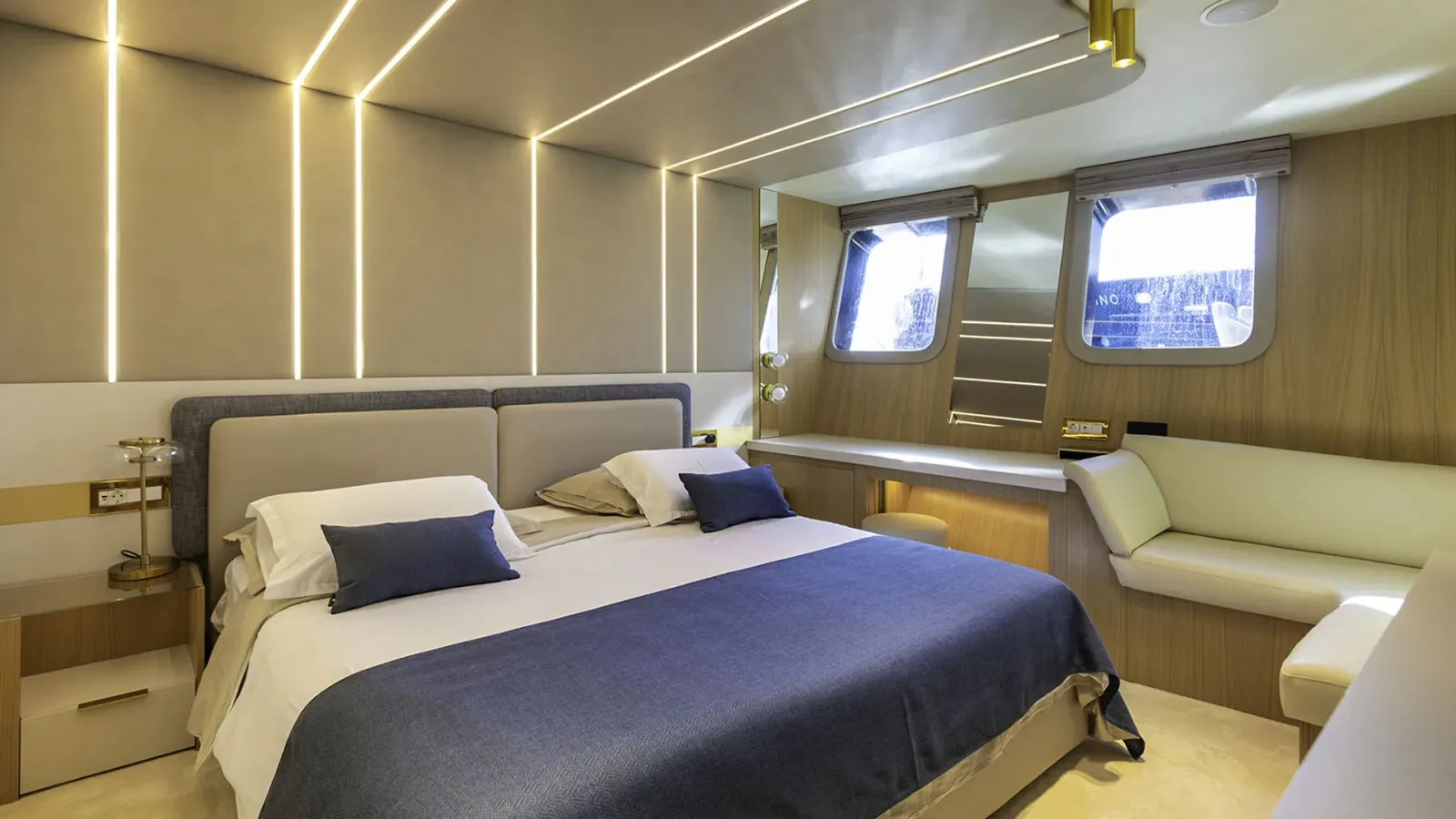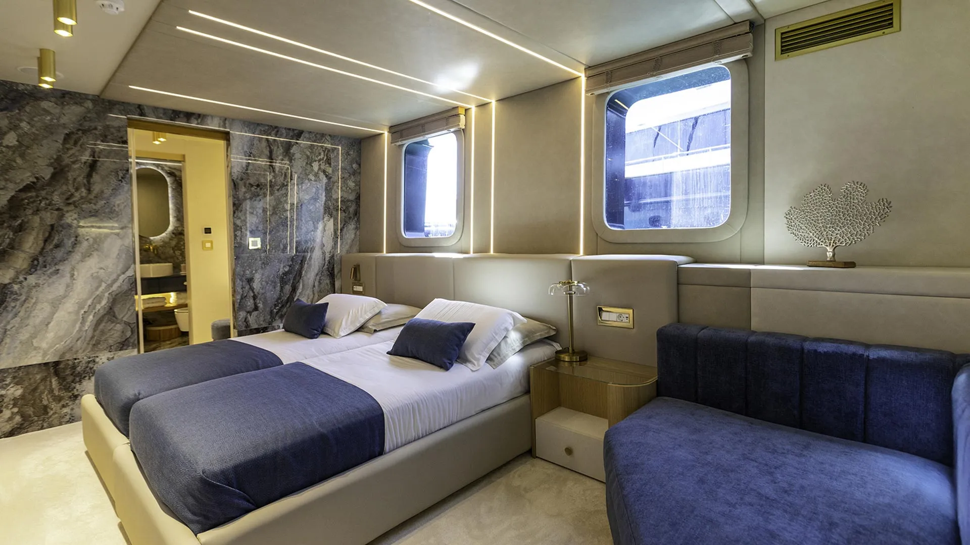 Il ponte principale di SCORPIOS comprende un salone, una zona pranzo, un bar e un magnifico balcone pieghevole con vista sull’acqua. Il salone principale è concepito come un’oasi di relax di lusso, con pavimenti in legno e arredi neutri – l’intero spazio è luminoso grazie alle ampie finestre. La disposizione di SCORPIOS comprende sei cabine: 1 Master a tutta larghezza, 1 cabina VIP e 4 cabine doppie convertibili. Tutte le cabine sono progettate con lusso e dotate di bagni in marmo sfarzosi e ampi guardaroba walk-in. Inoltre, sono dotate di TV a schermo piatto e sistema audio, completamente climatizzate. È facile dire che poche imbarcazioni offrono un comfort così superiore.