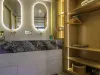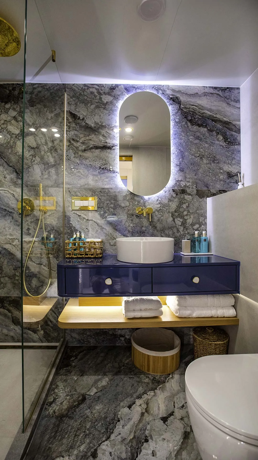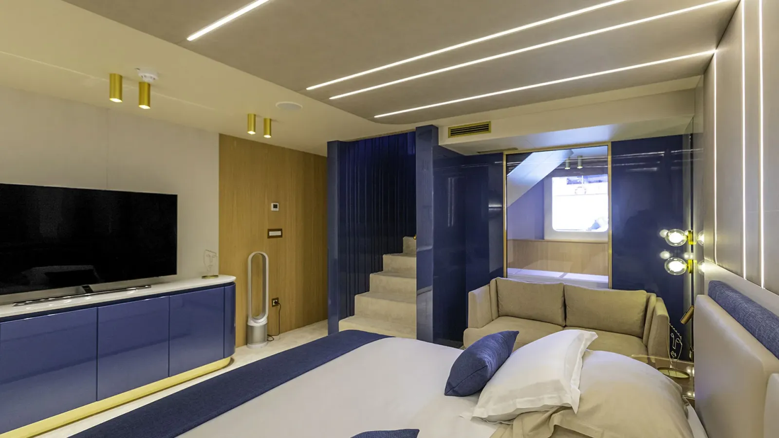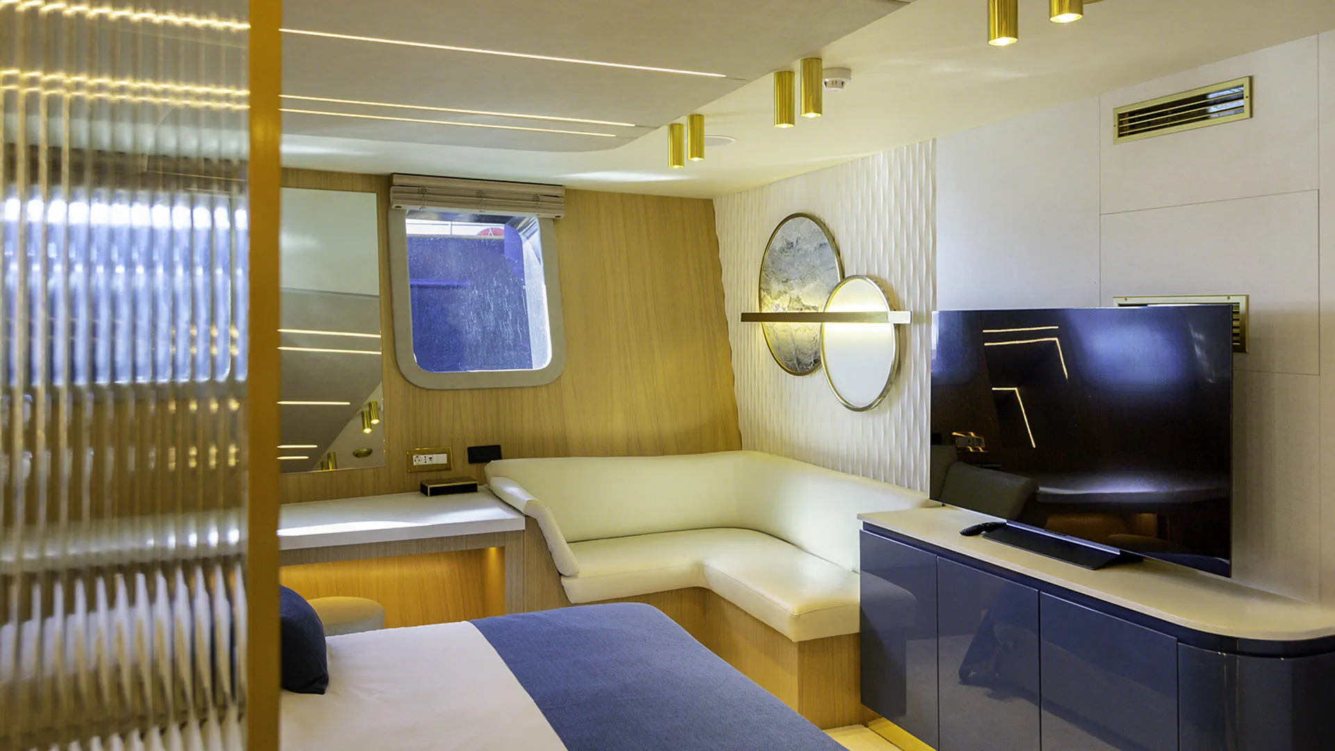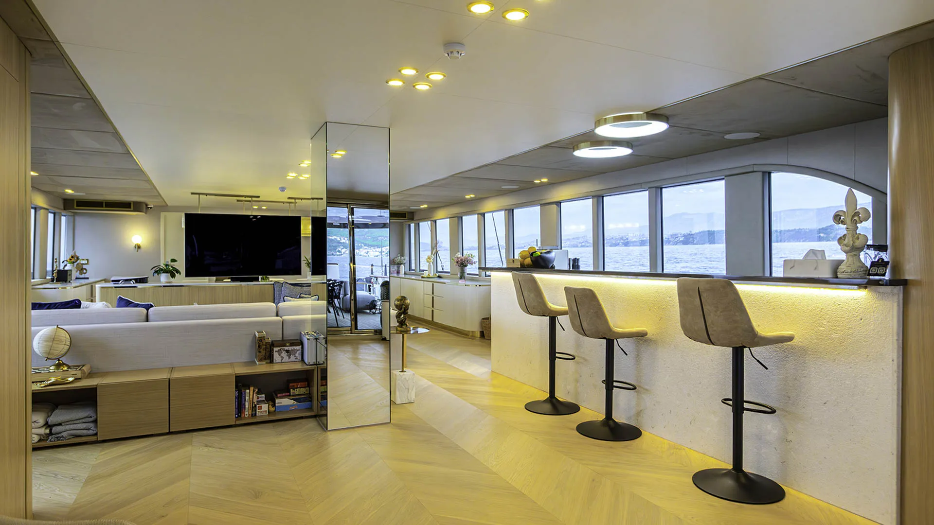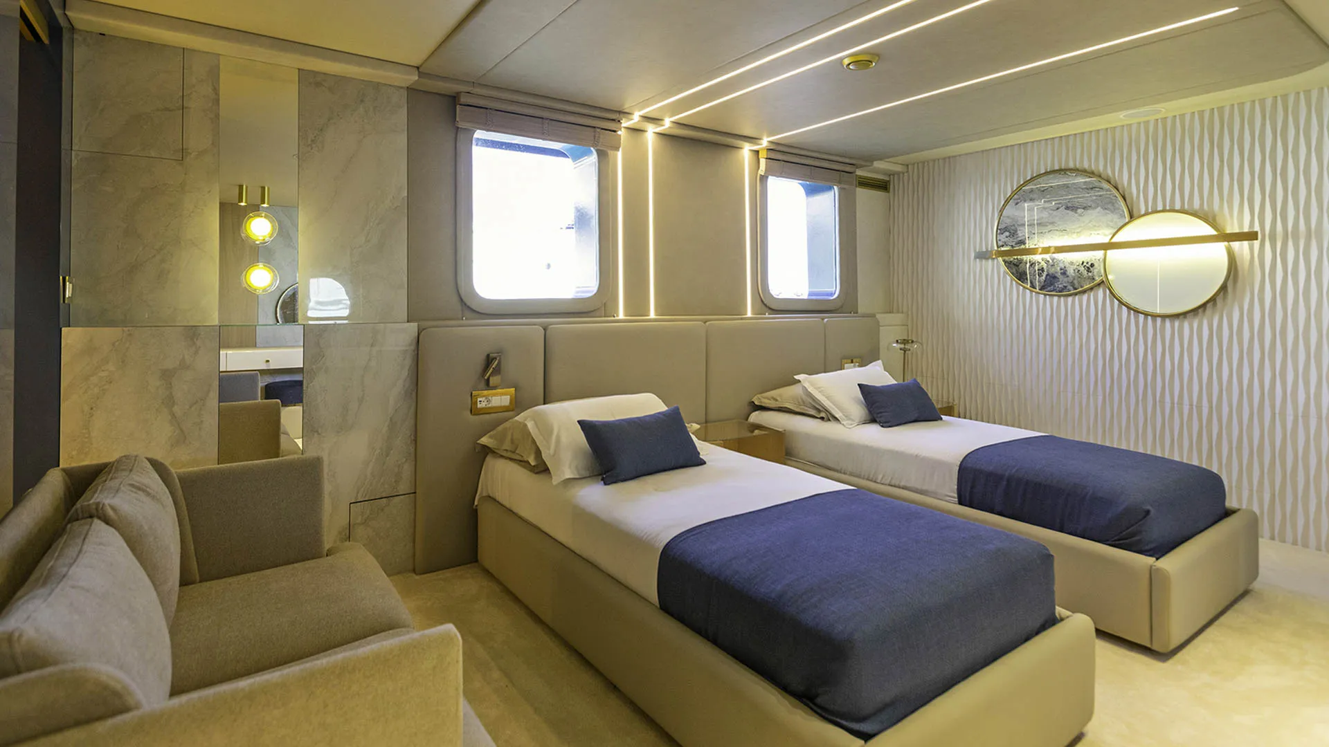Il ponte principale di SCORPIOS comprende un salone, una zona pranzo, un bar e un magnifico balcone pieghevole con vista sull’acqua. Il salone principale è concepito come un’oasi di relax di lusso, con pavimenti in legno e arredi neutri – l’intero spazio è luminoso grazie alle ampie finestre. La disposizione di SCORPIOS comprende sei cabine: 1 Master a tutta larghezza, 1 cabina VIP e 4 cabine doppie convertibili. Tutte le cabine sono progettate con lusso e dotate di bagni in marmo sfarzosi e ampi guardaroba walk-in. Inoltre, sono dotate di TV a schermo piatto e sistema audio, completamente climatizzate. È facile dire che poche imbarcazioni offrono un comfort così superiore.