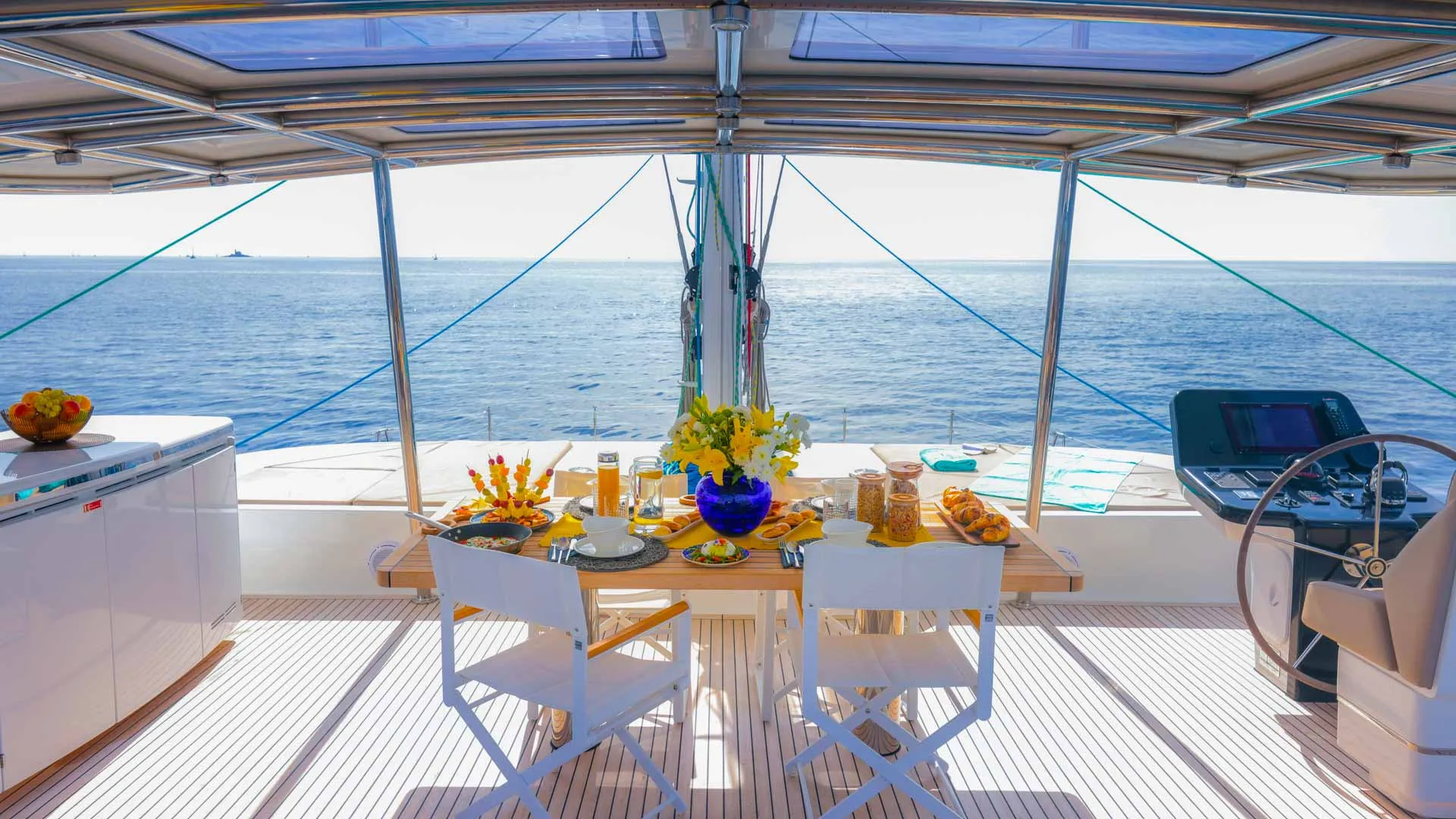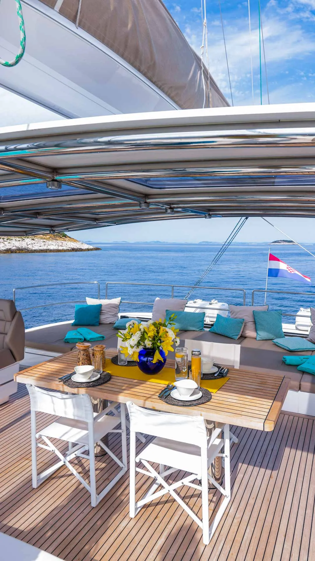 Avanti, la terrazza di prua offre un rifugio tranquillo completo di comodi spazi per il relax e un’amaca — perfetta per cocktail al tramonto o mattine lente accompagnate dal suono del mare. Il pozzetto estende l’esperienza all’aperto con un’altra invitante area pranzo, naturalmente collegata all’interno per un flusso facile in tutta la yacht.