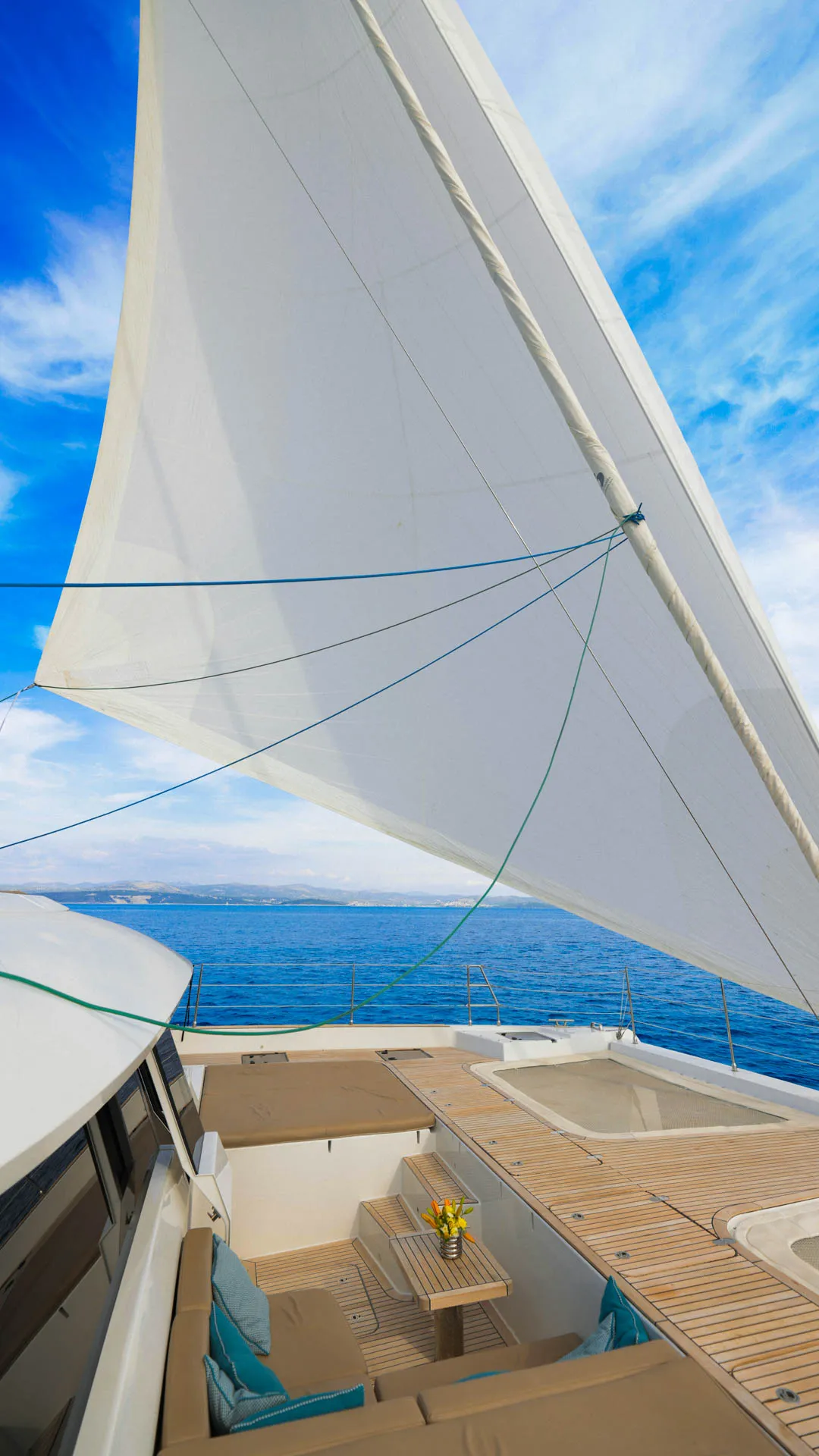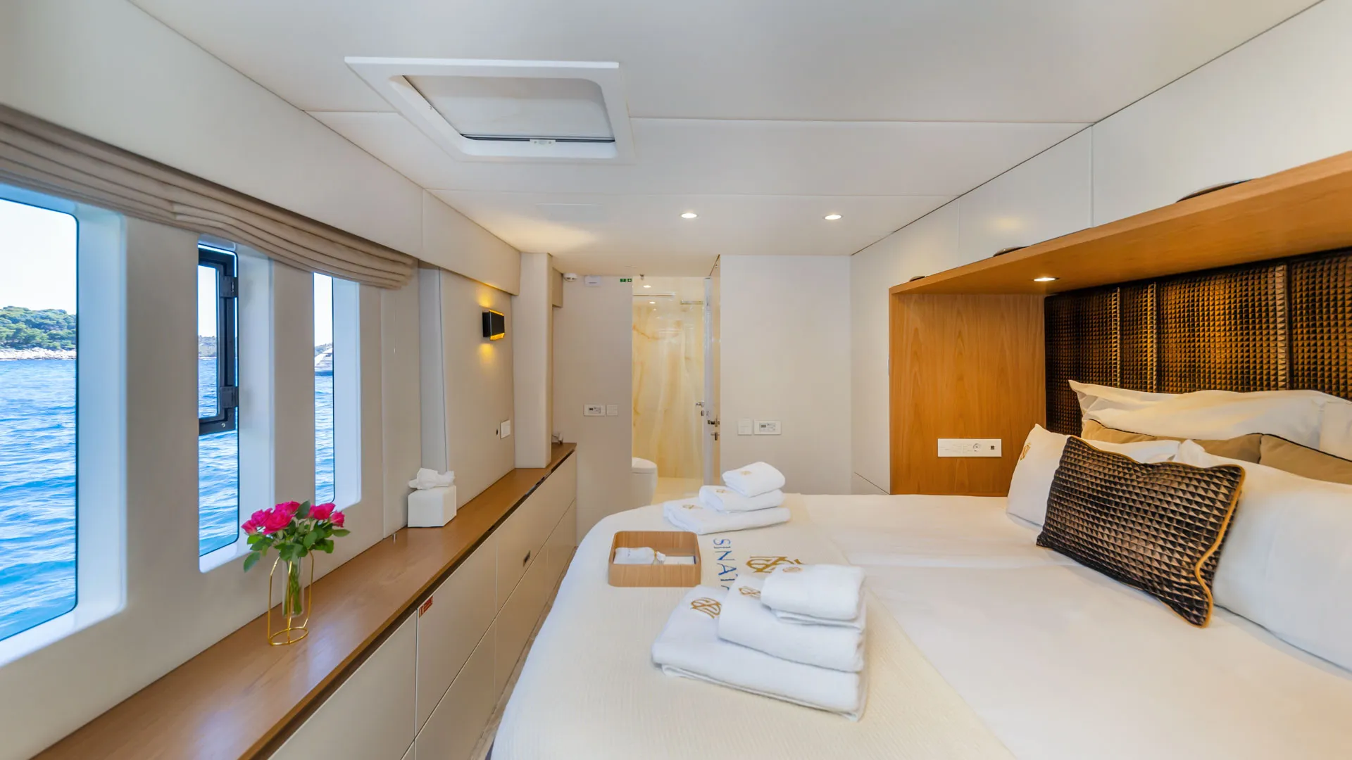Le porte scorrevoli in vetro su entrambi i lati dell’area living dissolvono il confine tra interno ed esterno, permettendo alla fresca brezza marina di fluire e trasformando il salone in un magnifico salotto all’aperto in pochi istanti. La disposizione è progettata con cura per massimizzare comfort e privacy, con tutte le cabine dotate di bagni ensuite e aria condizionata completa con controlli individuali. Dalla suite padronale alle cabine ospiti, ogni spazio offre tonalità rilassanti, design intelligente e splendide viste dall’alba al tramonto, creando un rifugio sereno dopo una giornata in mare.