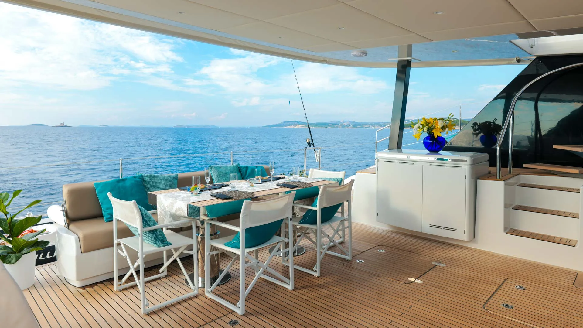 Molteplici aree sociali sono accuratamente disposte per offrire sia spazi di ritrovo vivaci che angoli tranquilli per il relax. Il flybridge offre ampio spazio per il relax e cene all’aperto, rendendolo un ambiente ideale per lunghi pranzi estivi o serate sotto le stelle.