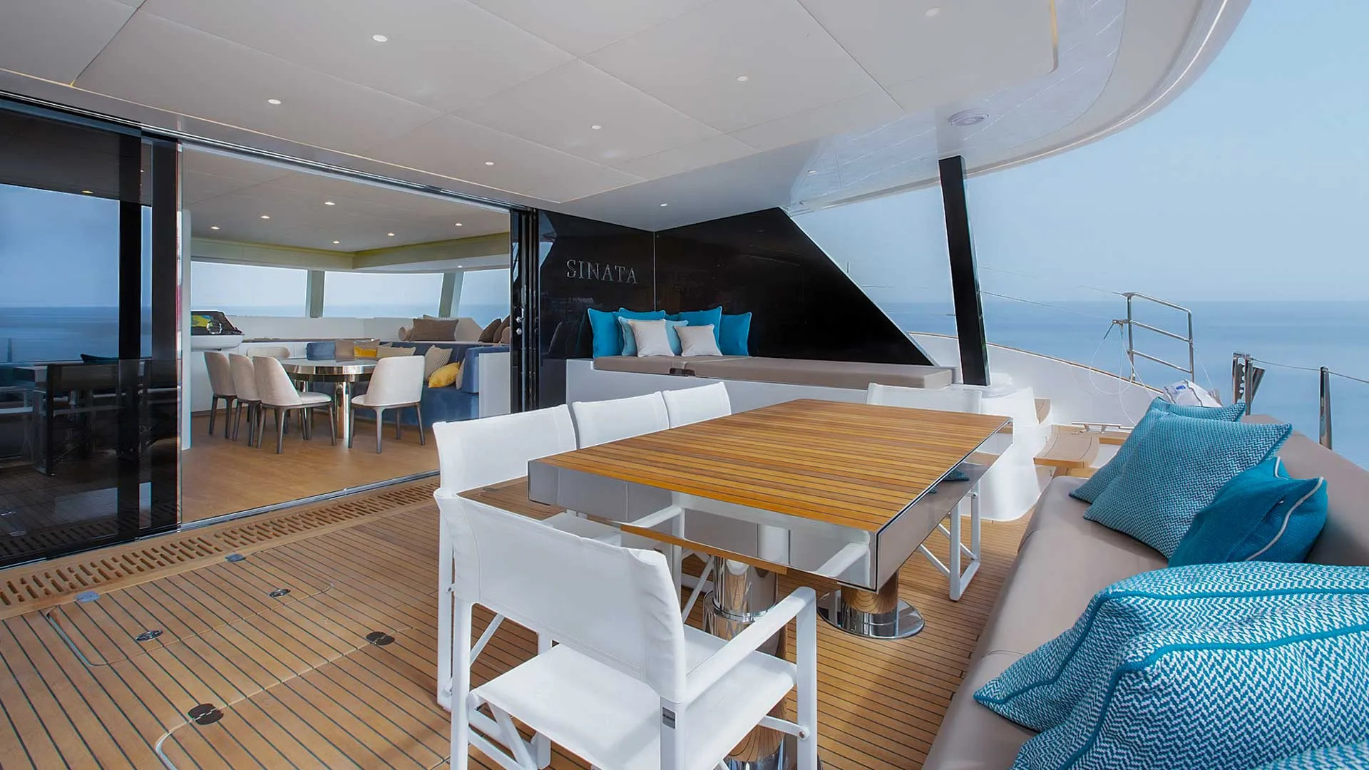 A livello dell’acqua, la piattaforma di nuoto idraulica migliora la connessione con il mare, abbassandosi dolcemente per creare un ambiente simile a una spiaggia privata e garantendo un accesso sicuro e senza sforzo per nuotare o godere dei giochi d’acqua della yacht. Elegante ma altamente funzionale, l’esterno di SINATA è progettato per far sentire ogni momento a bordo aperto, rilassato e perfettamente in sintonia con il paesaggio marino circostante.