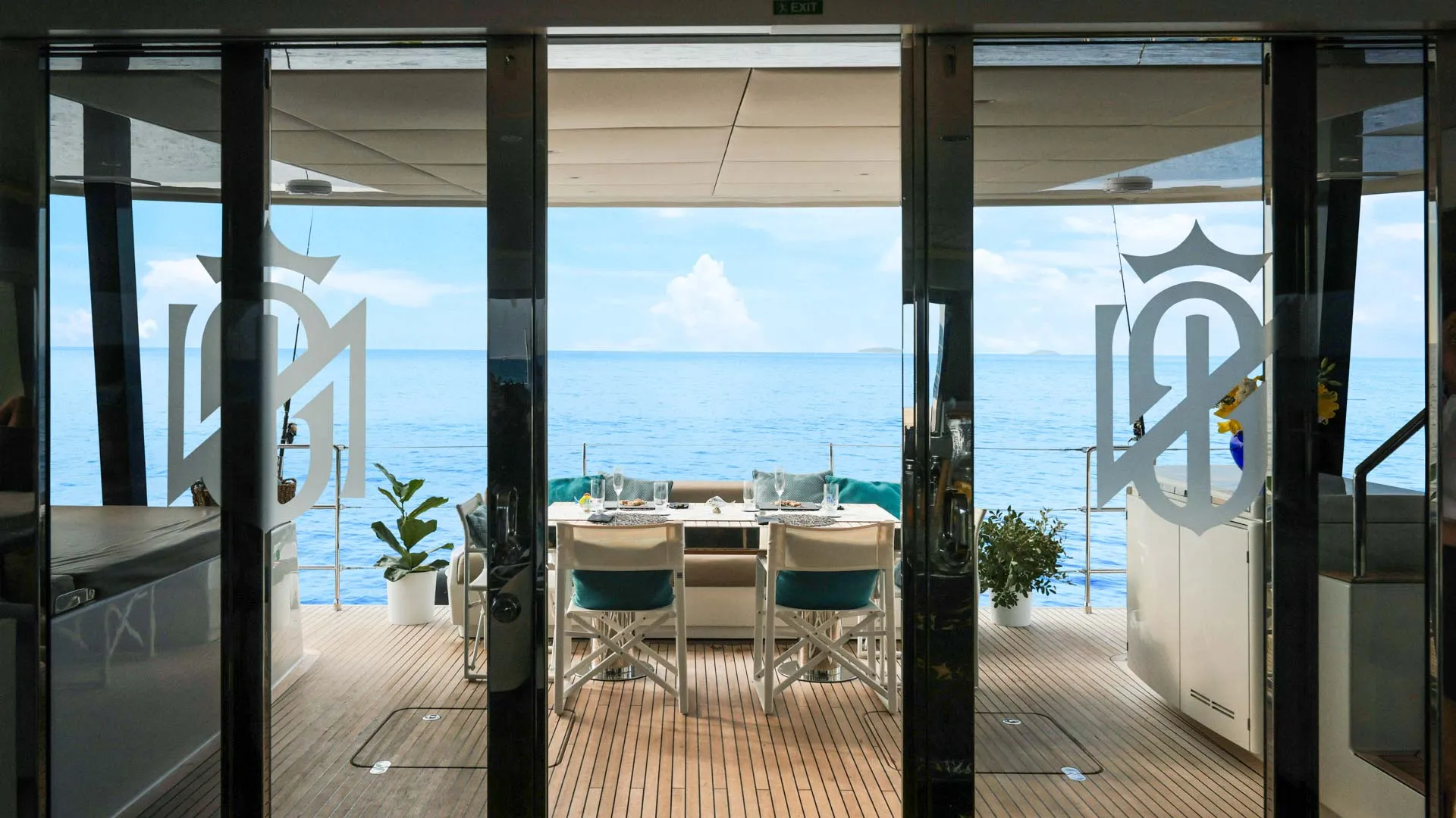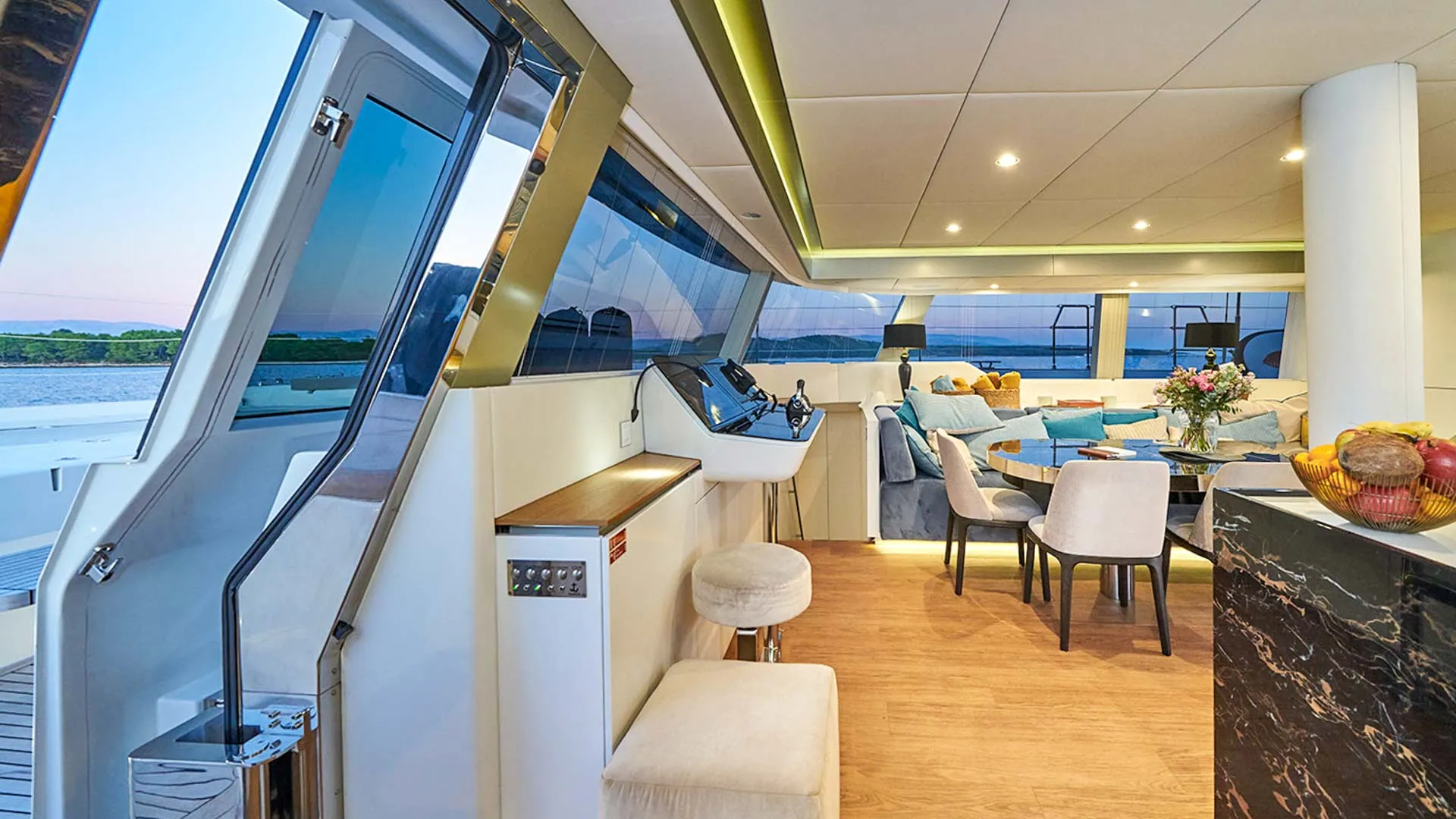 Il catamarano è caratterizzato da luce, spazio e funzionalità senza soluzione di continuità. Le ampie finestre panoramiche circondano il salone, invitando la luce naturale all’interno e incorniciando viste mare ininterrotte in ogni direzione. Il risultato è un’atmosfera che appare sia sofisticata che rilassata, un luogo dove gli ospiti possono distendersi rimanendo costantemente connessi all’orizzonte.