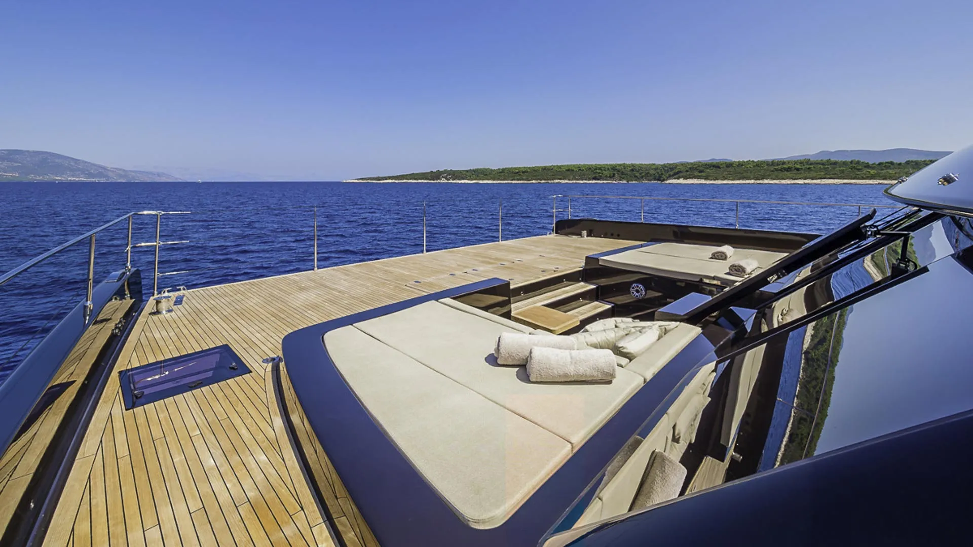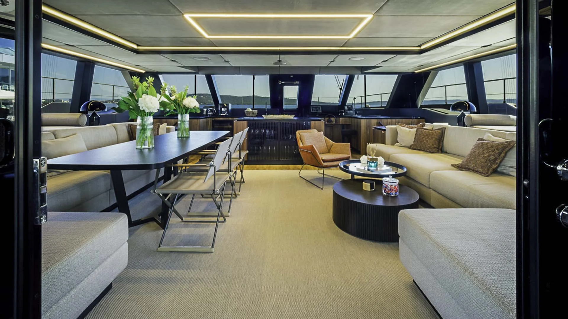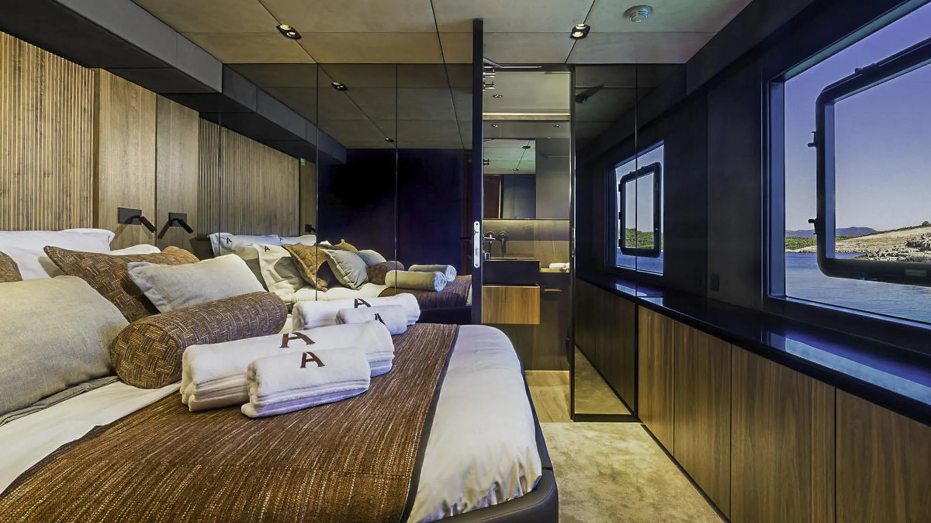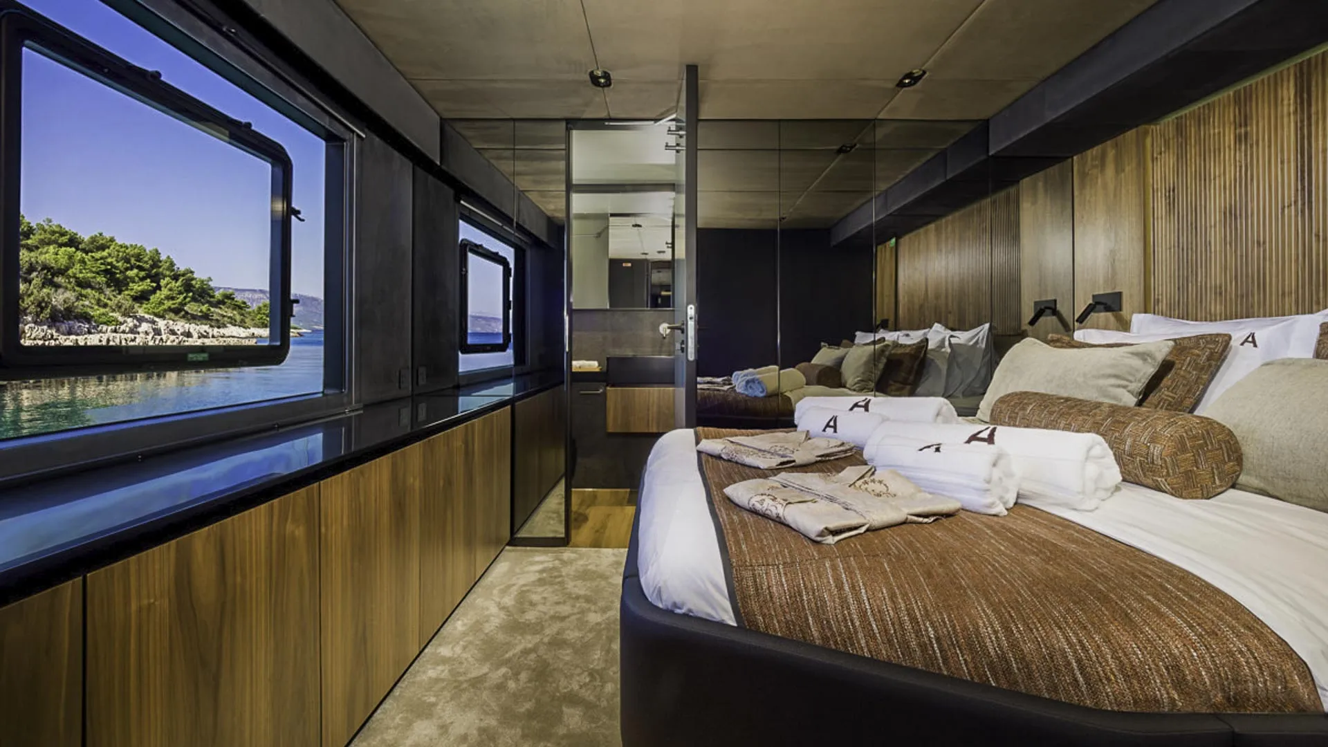 Ha un volume generoso all’interno dello scafo dello yacht che ospita facilmente 8 ospiti in 4 lussuose cabine doppie con bagno privato. La cabina armatoriale sembra indiscutibilmente come se dovesse essere su un mega-yacht, poiché sfrutta quasi completamente la sua larghezza di 30 piedi ed è circondata da una meravigliosa vista panoramica sul mare.